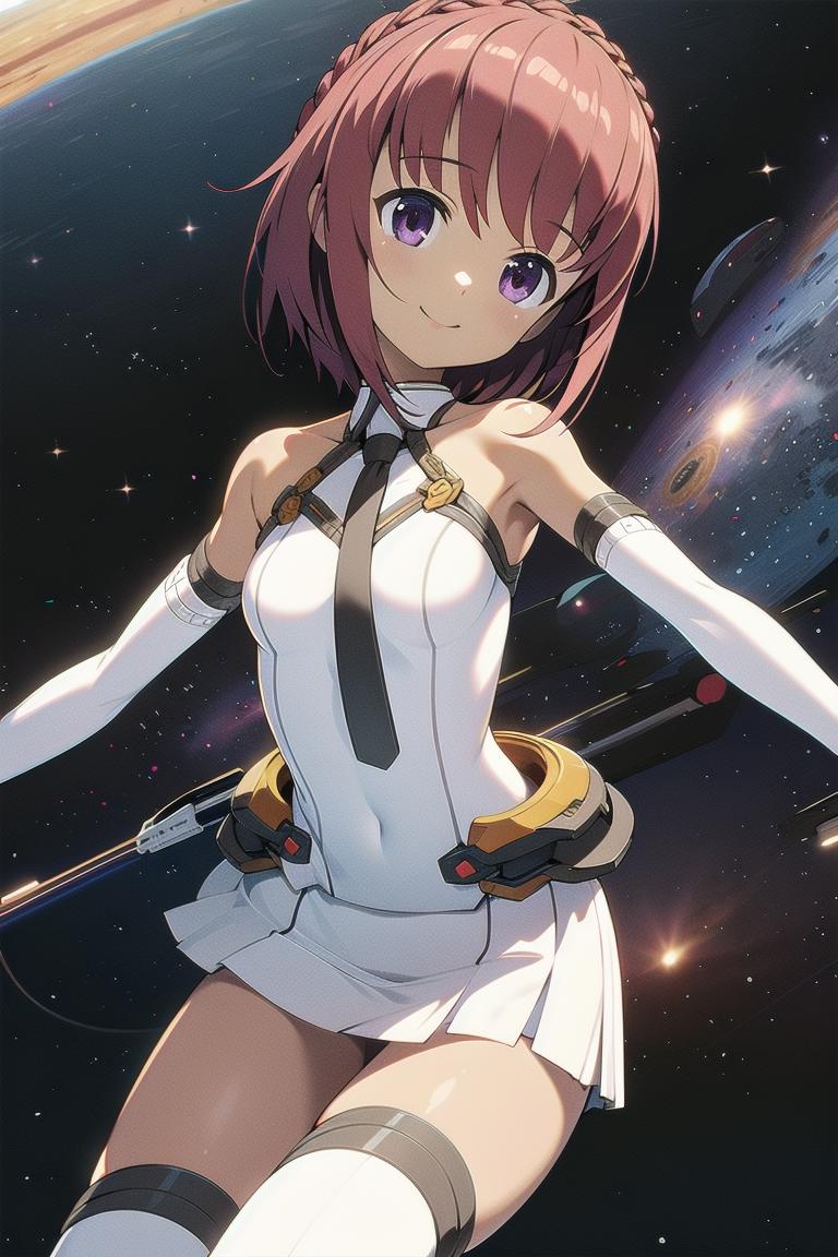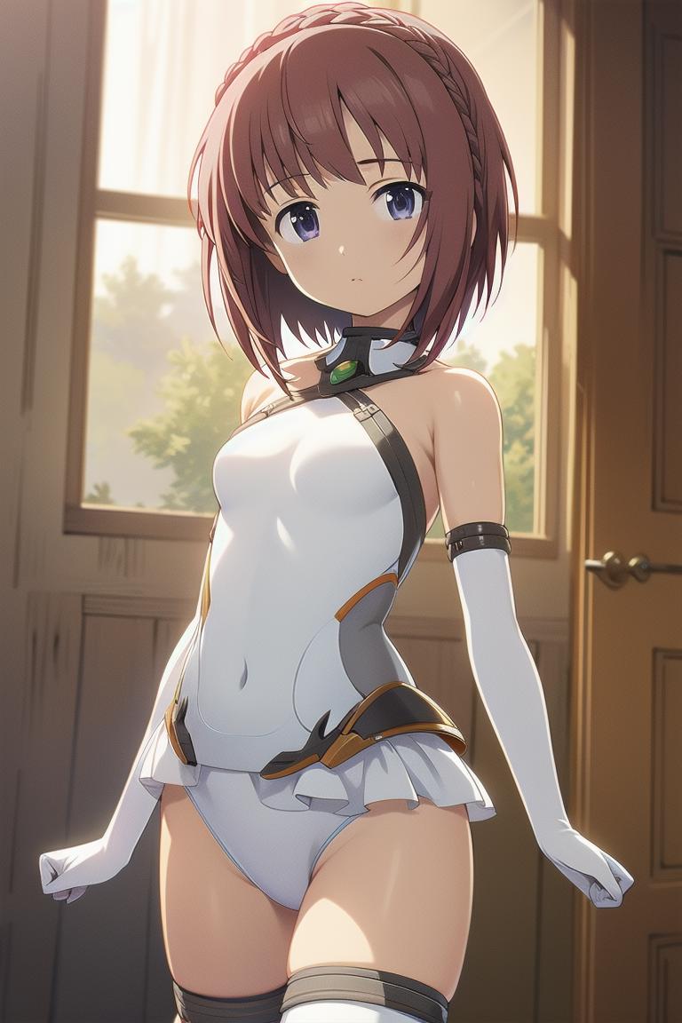 aika, braid, small breasts, white leotard, short necktie, small breasts, bare shoulders, (white elbow gloves), white thighhighs, frille skirt