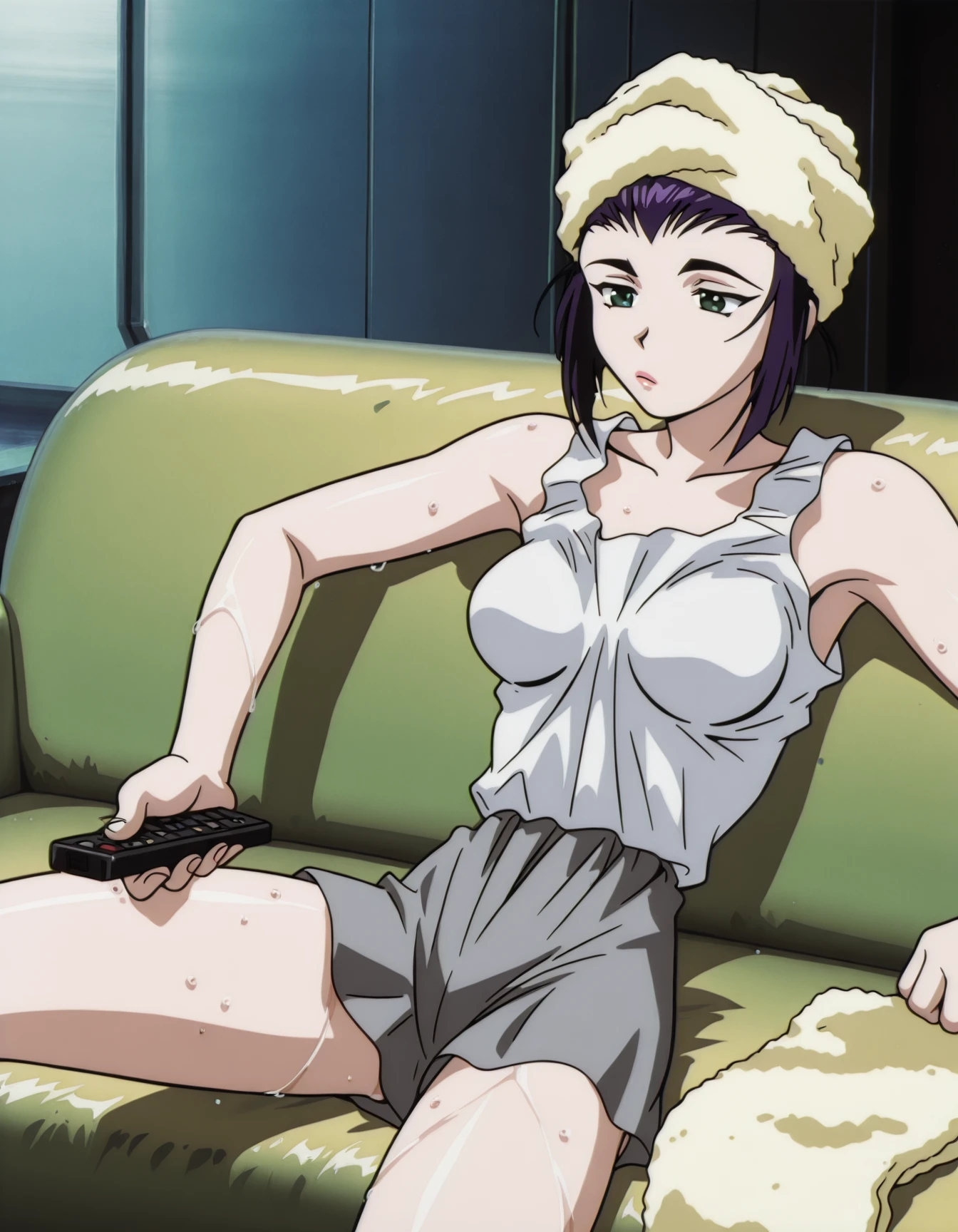 faye valentine, towel on head, white shirt, tank top, grey skirt