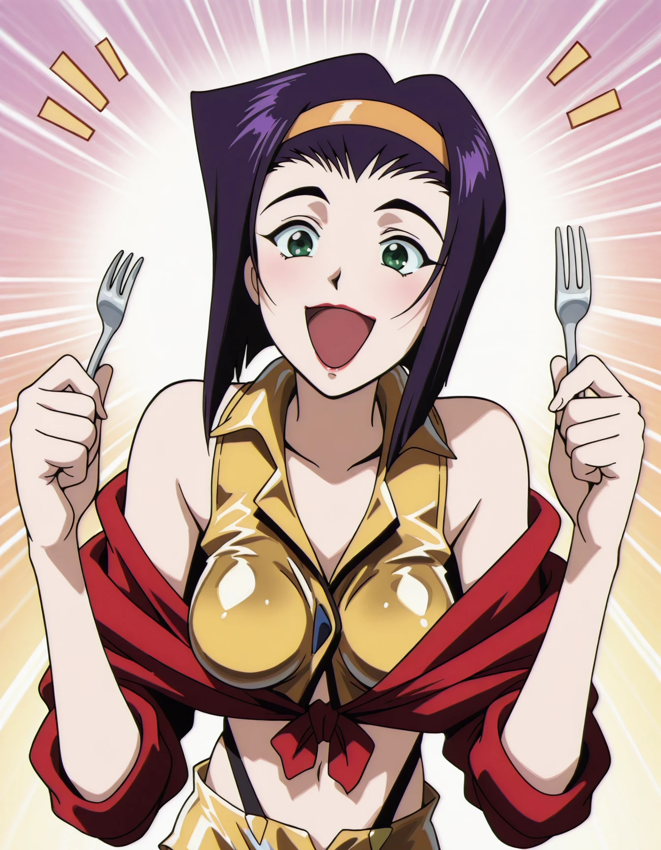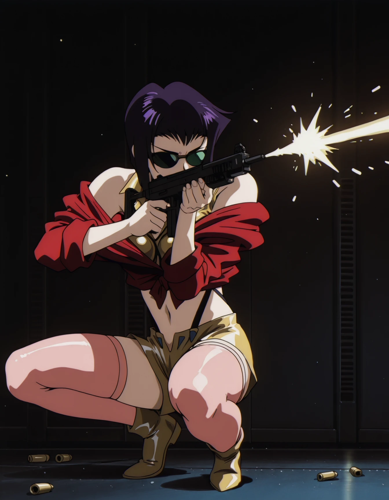 faye valentine, off-shoulder red jacket, crop top, suspender shorts, pink thighhighs