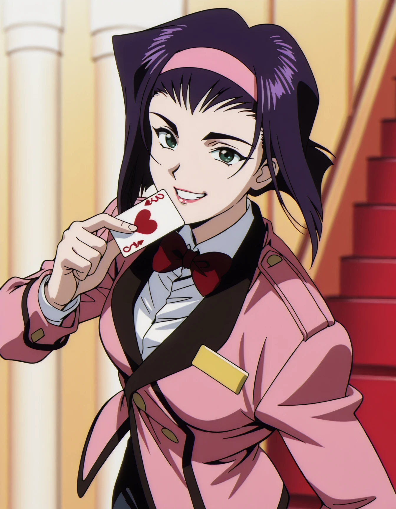 faye valentine, pink hairband, pink jacket, red bowtie, collared shirt, pants
