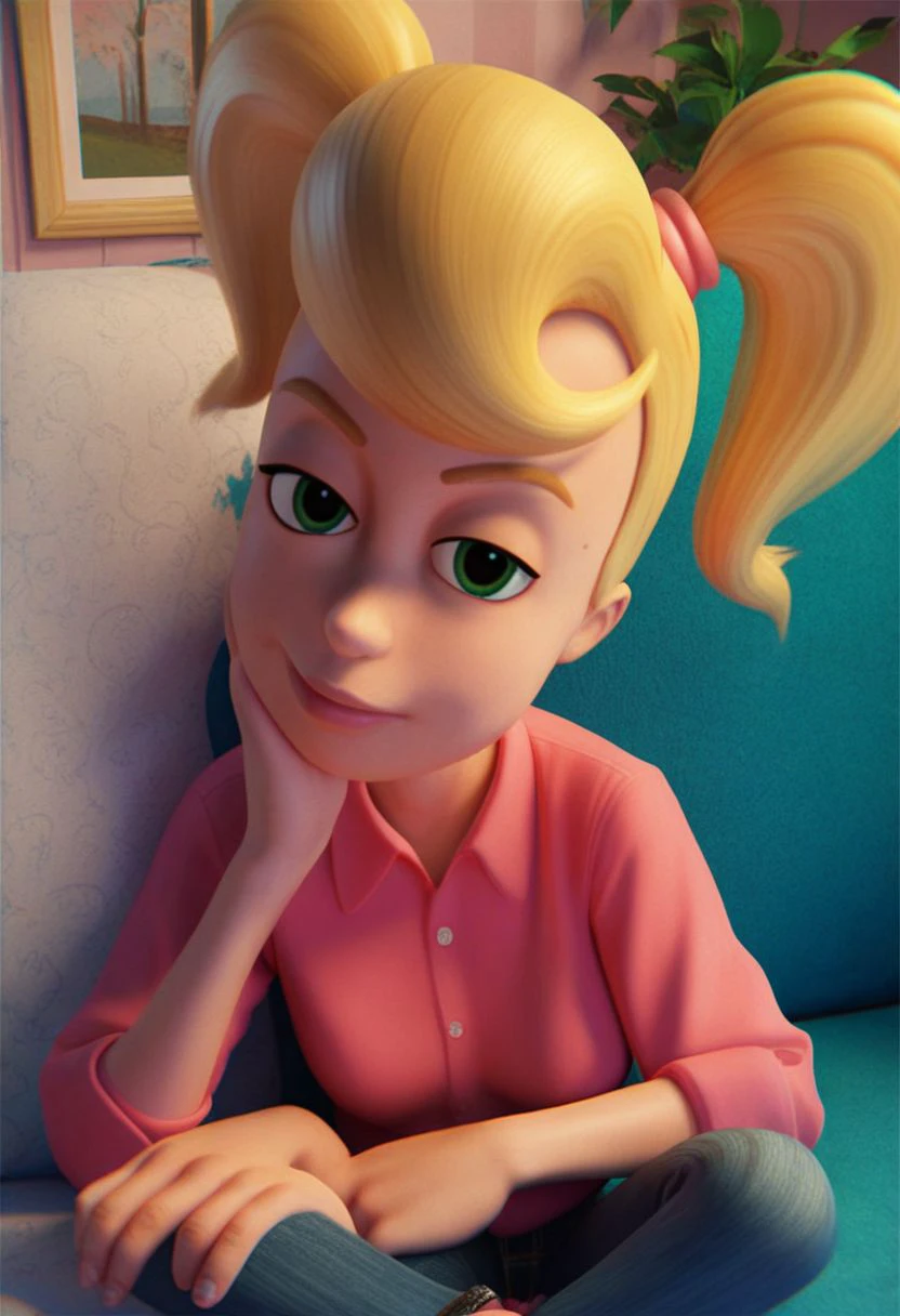 Movie outfit [Blonde hair, twintails, pink shirt, jeans, pinkhairband]