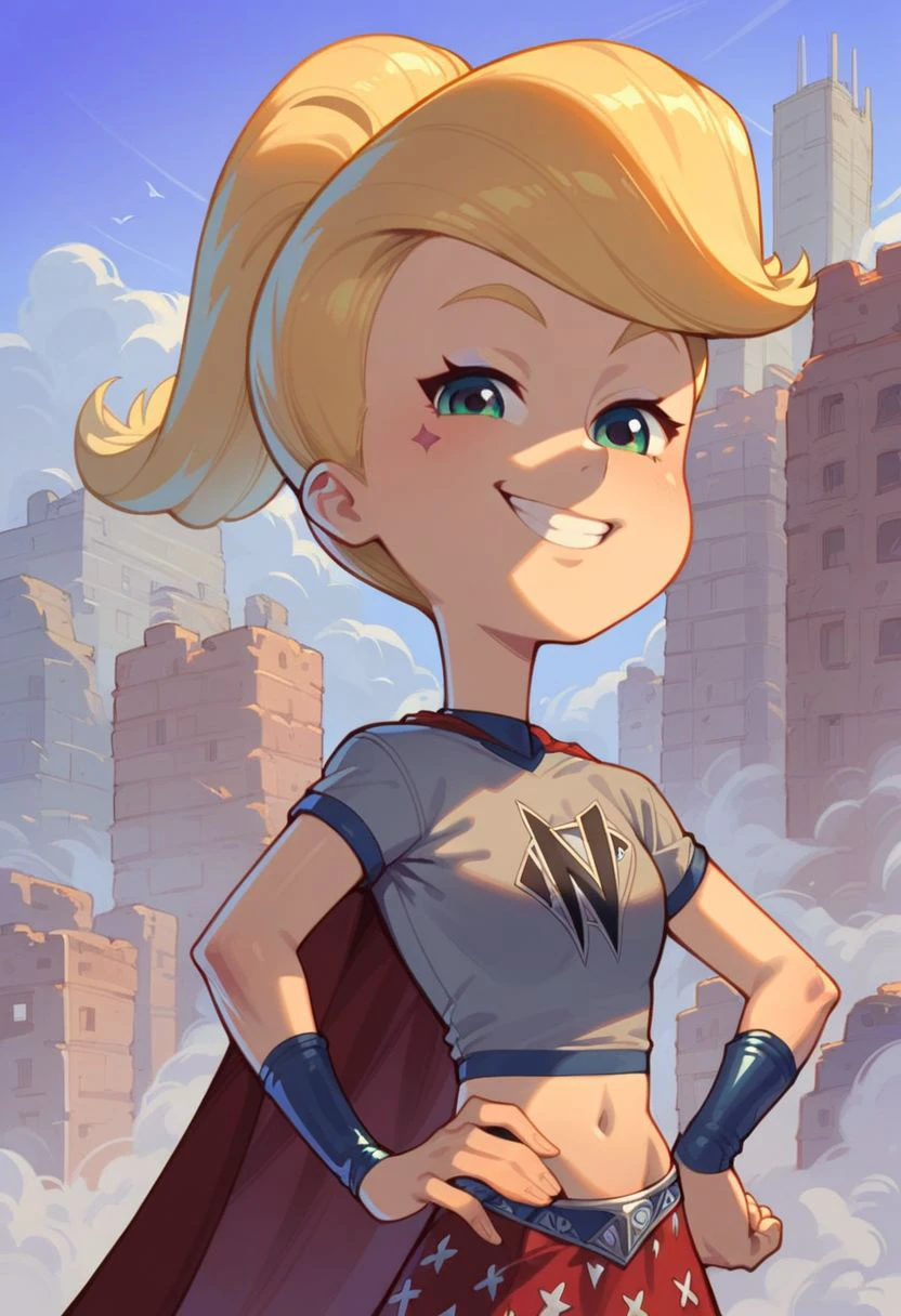 Nmen outfit [Blonde hair, ponytail, pink hairband, star (symbol) skirt, midriff, cape, shirt, wristband]