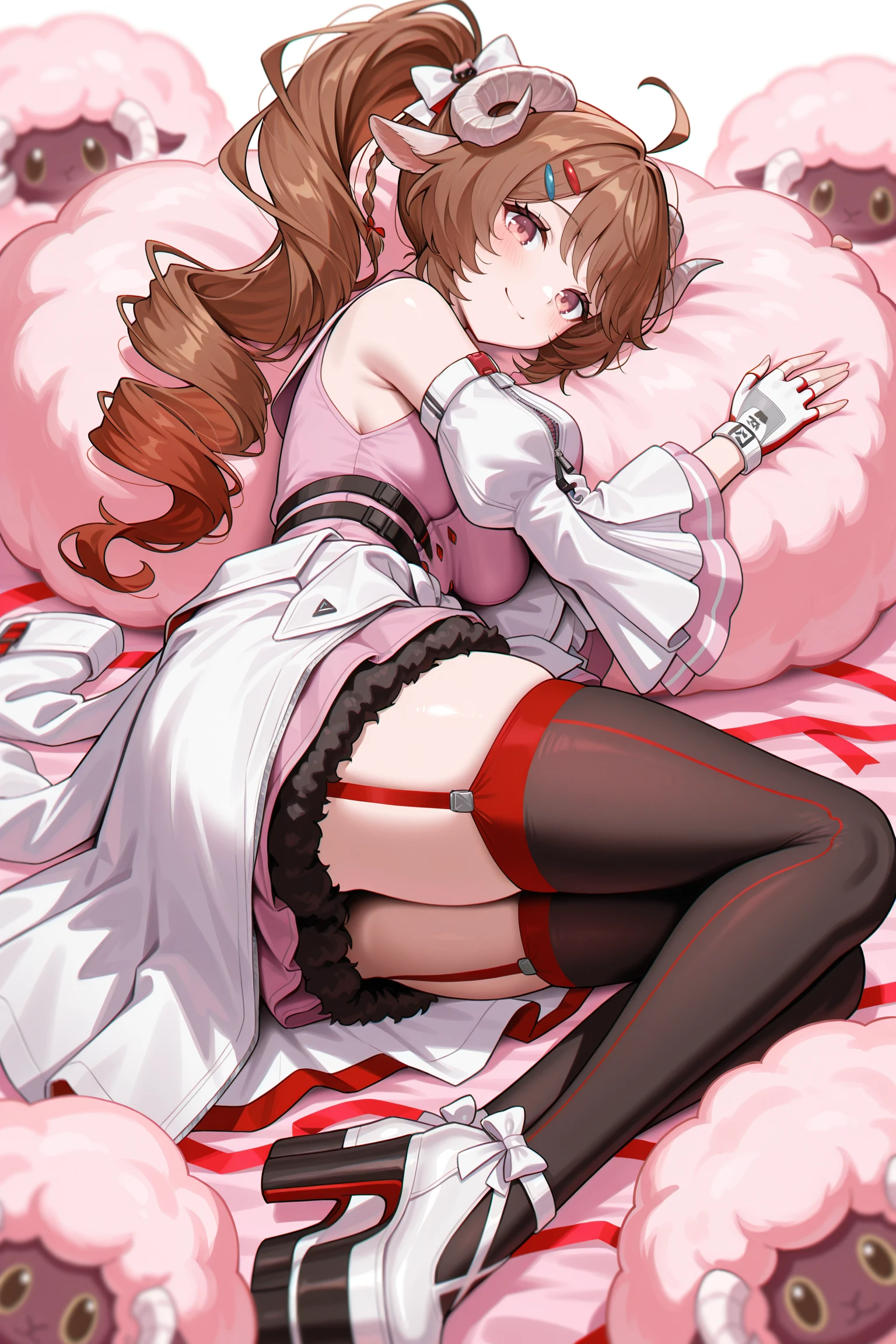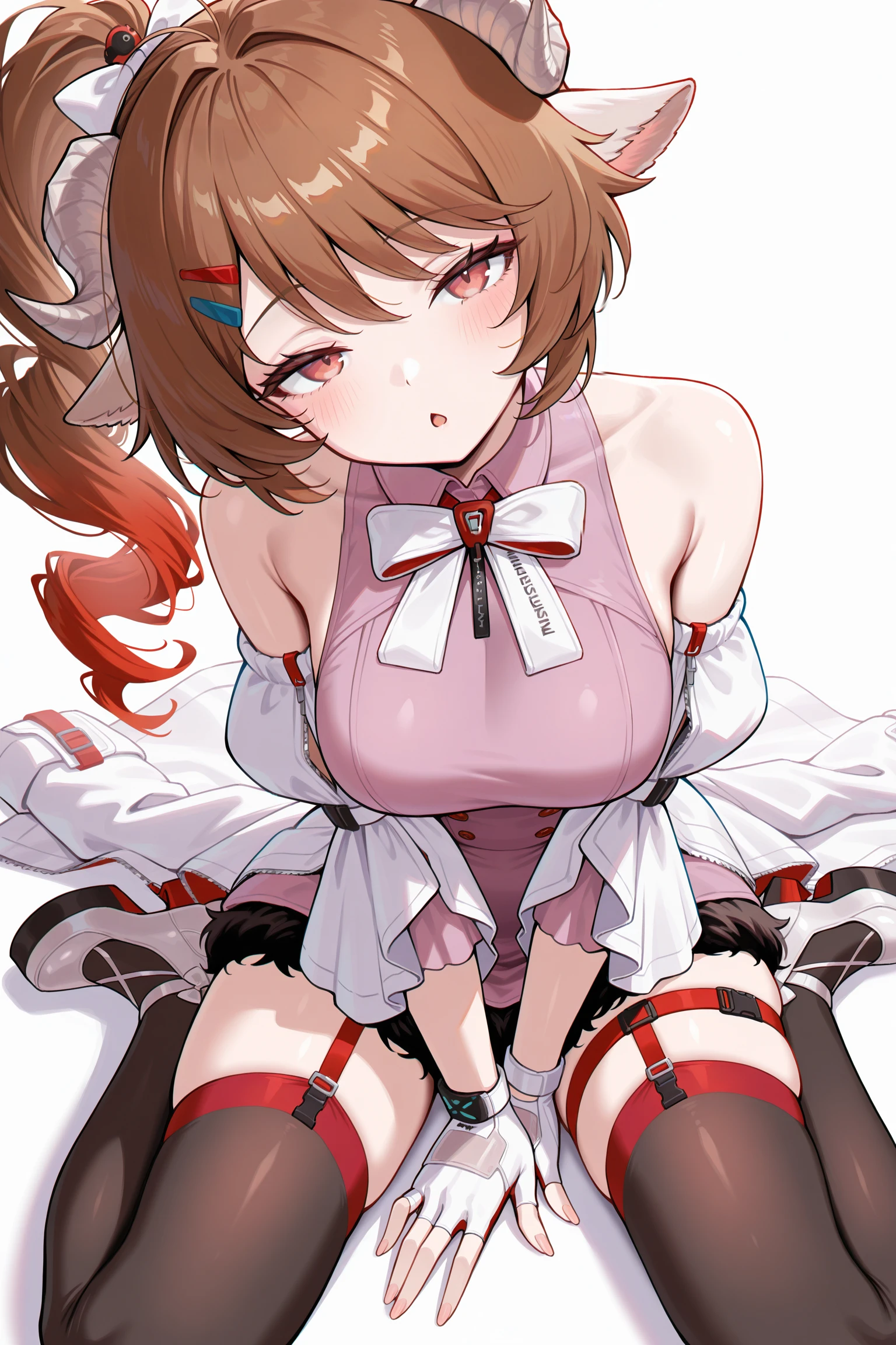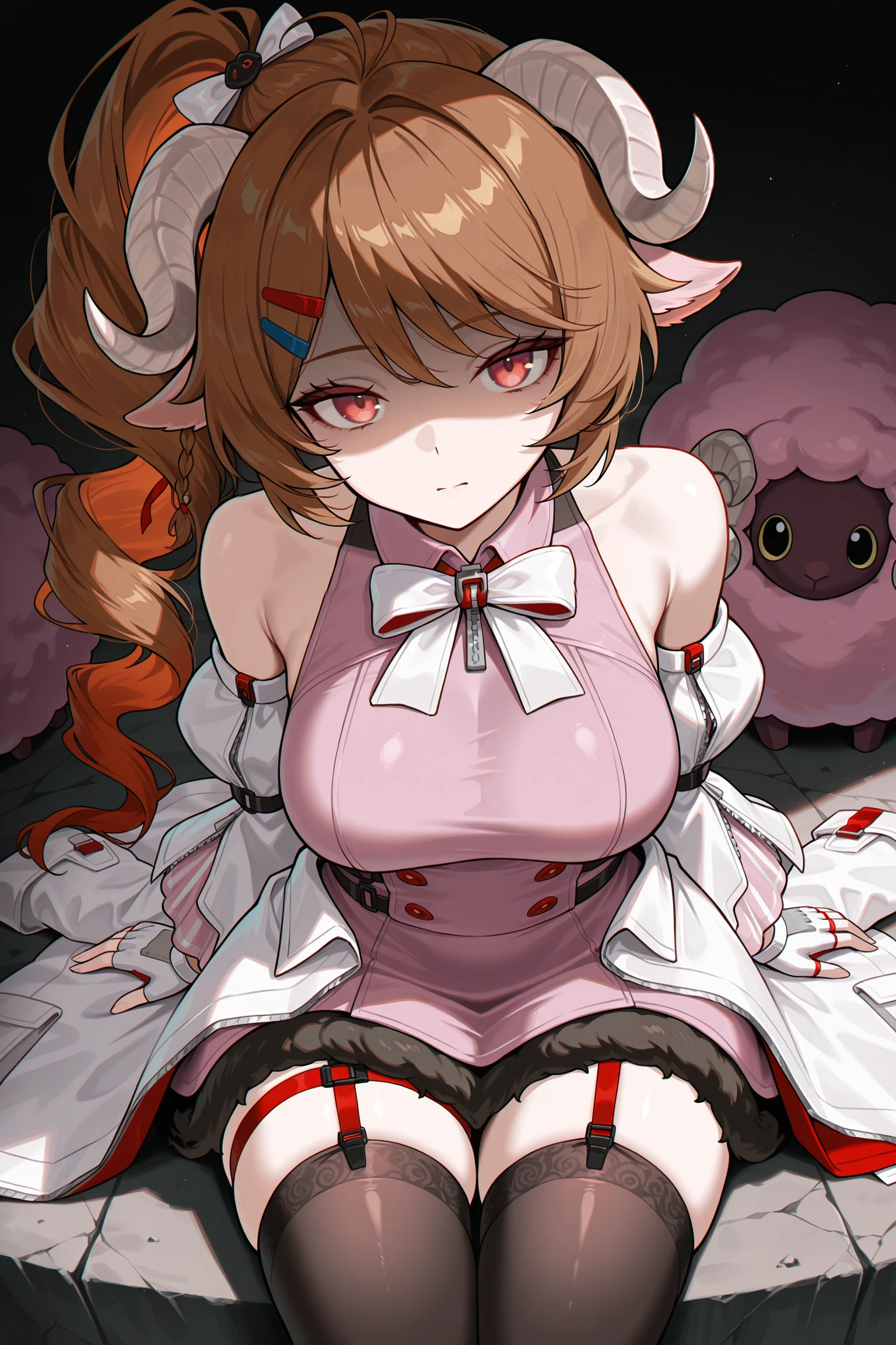 pink sleeveless dress, black fur trim, white detached sleeves, two-tone fingerless gloves, white jacket on waist, red ribbon, black thighhighs, white platform heels, red garter straps,white bow,hair bow,hairpins,