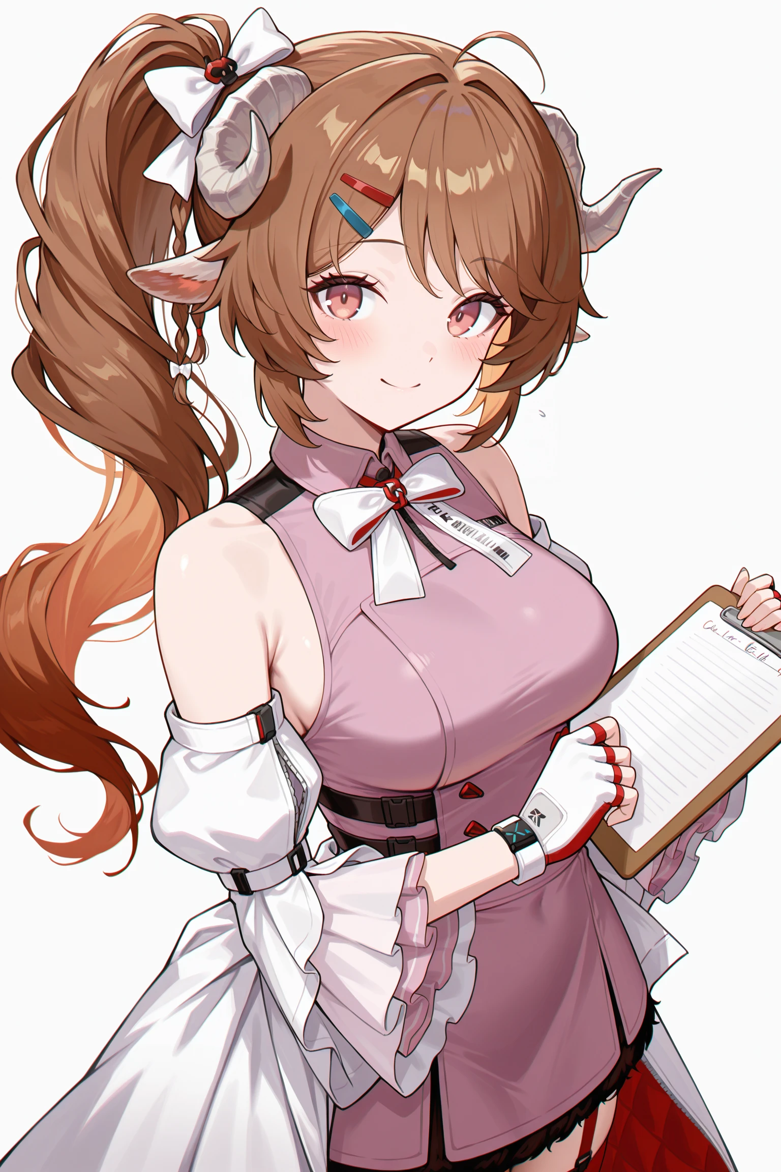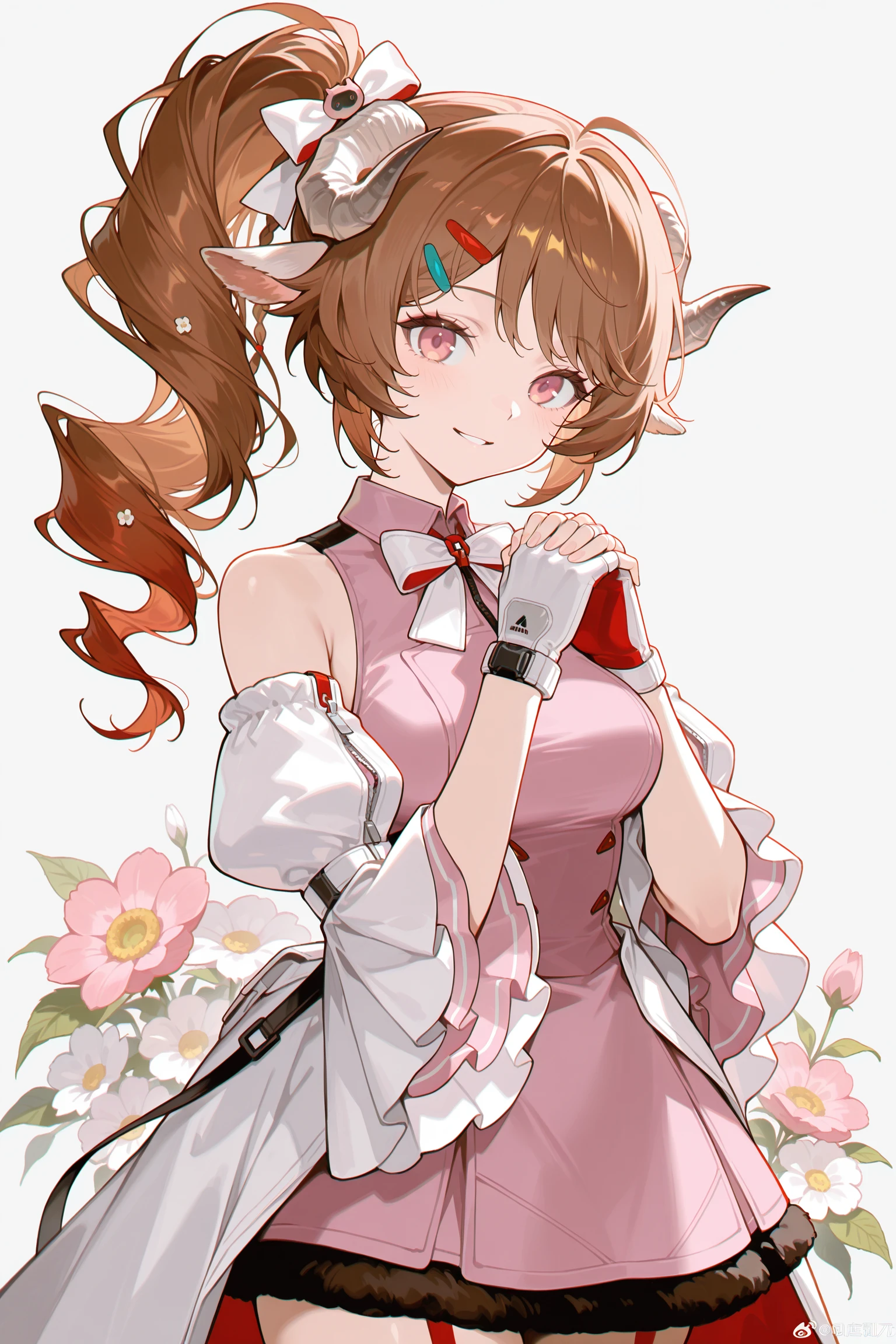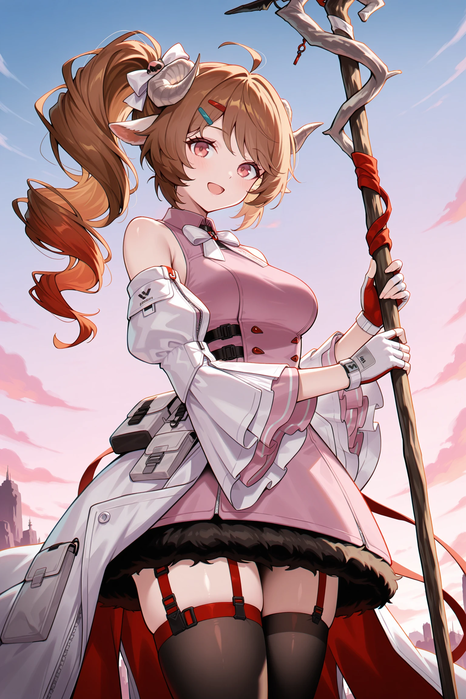 pink sleeveless dress, black fur trim, white detached sleeves, two-tone fingerless gloves, white jacket on waist, red ribbon, black thighhighs, white platform heels, red garter straps,white bow,hair bow,hairpins,
