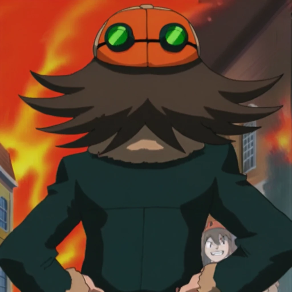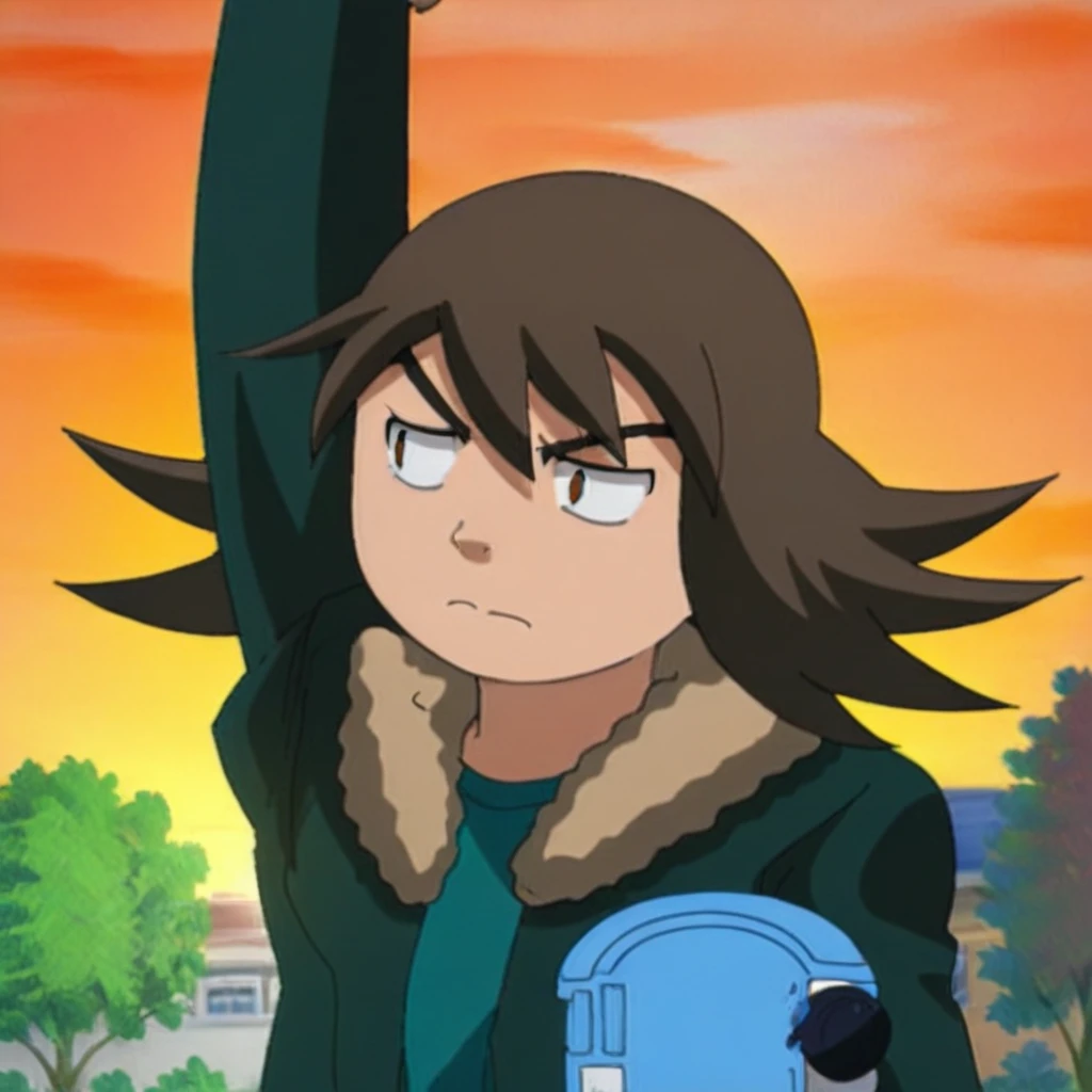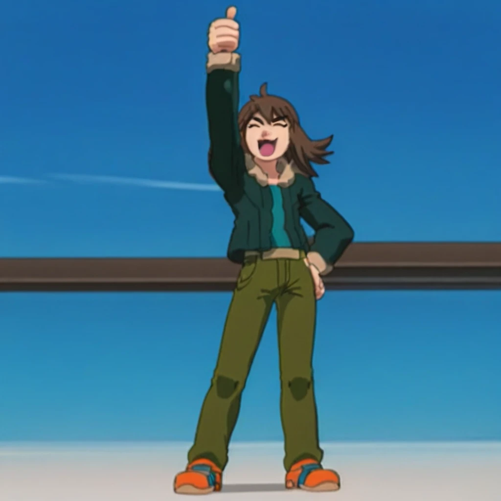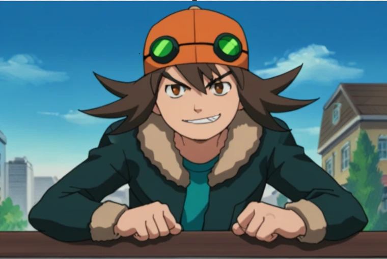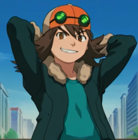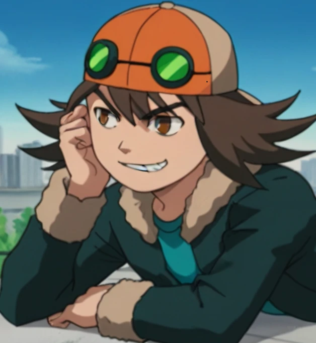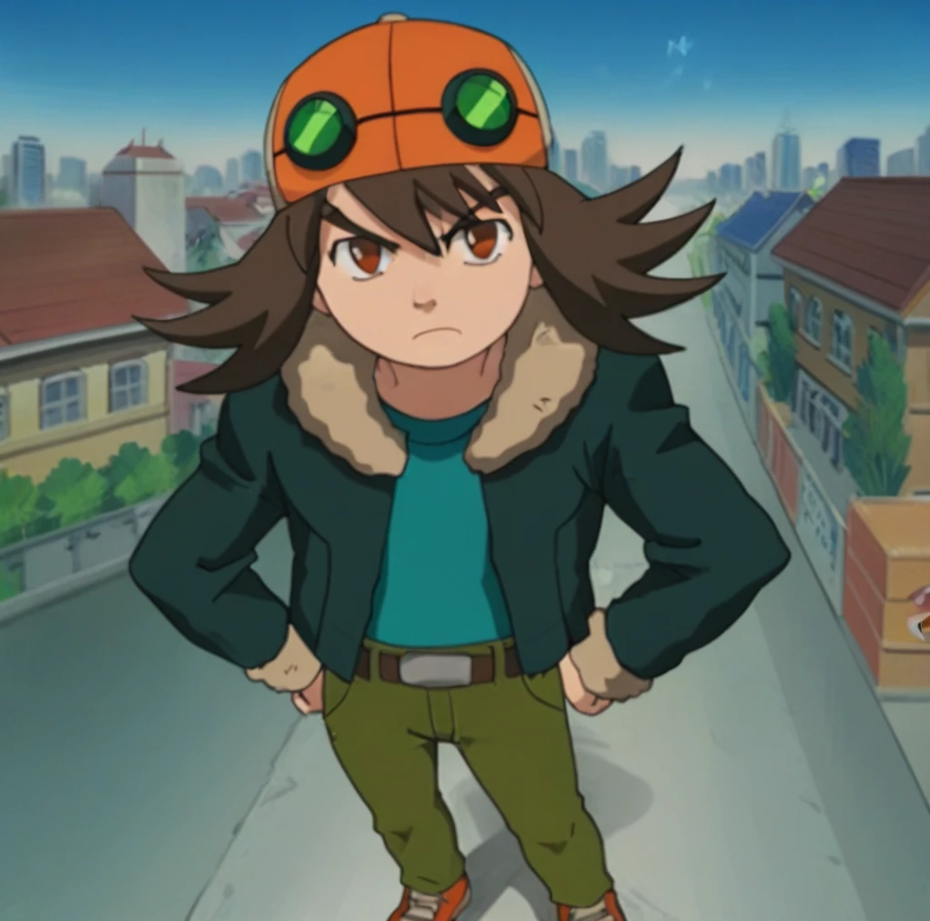 Prompts: male, brown hair, brown eyes, hat, dark teal fur-trimmed jacket / fur trim, light teal short-sleeve shirt, green pants, belt, goggles, goggles on head, orange shoes