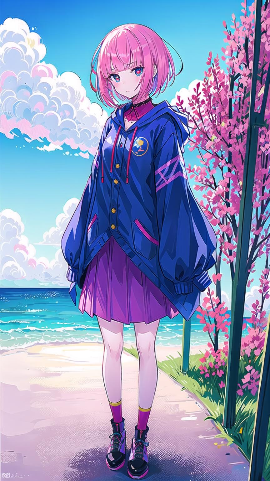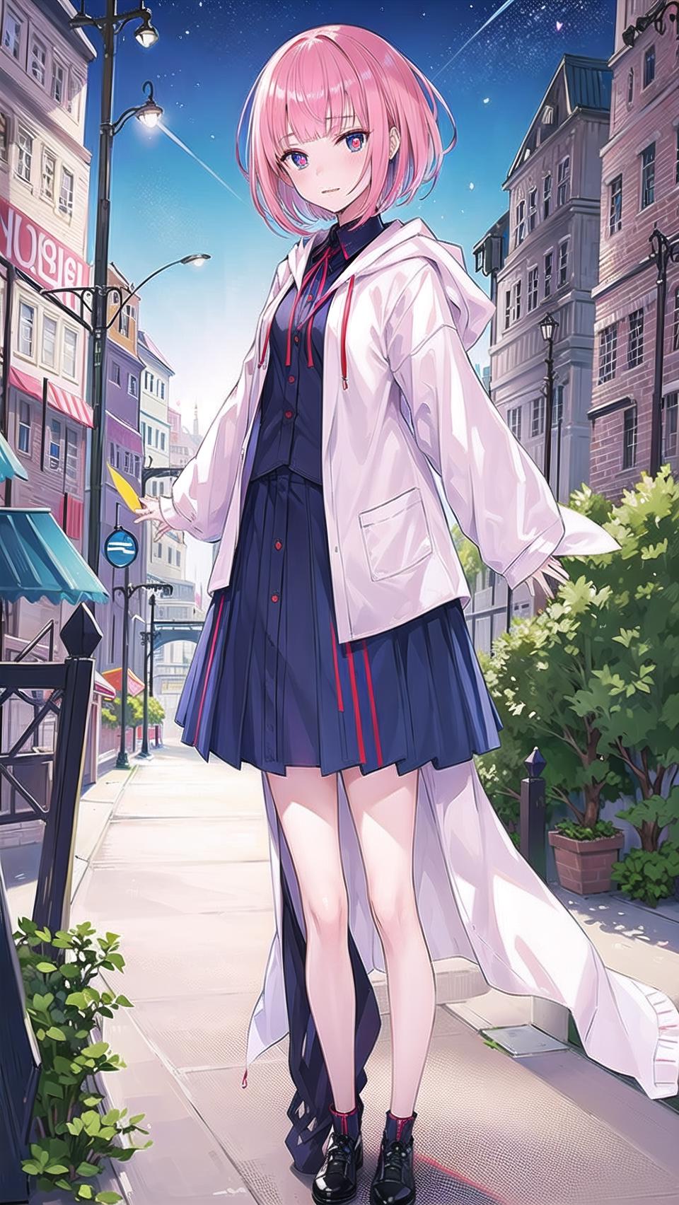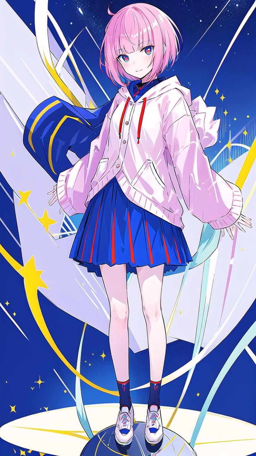 masterpiece, best quality,kafcevioailora, 1girl,virtual youtuber, solo,pink hair, full body, hood,(short hair:), jacket, skirt, shoes, looking at viewer, yellow pupils, socks, standing,long sleeves, slim bangs, blue socks, red eyes, blue eyes, hooded jacket,<lora:KafCevioV6.0:0.7>, blue sky, clouds, stars