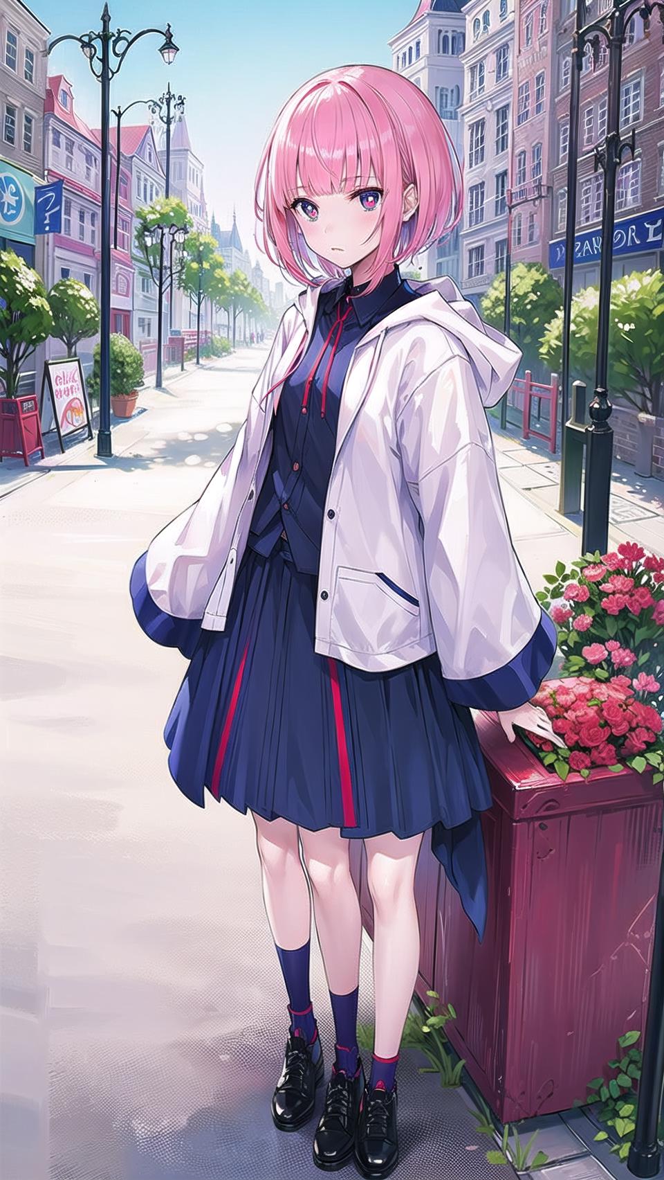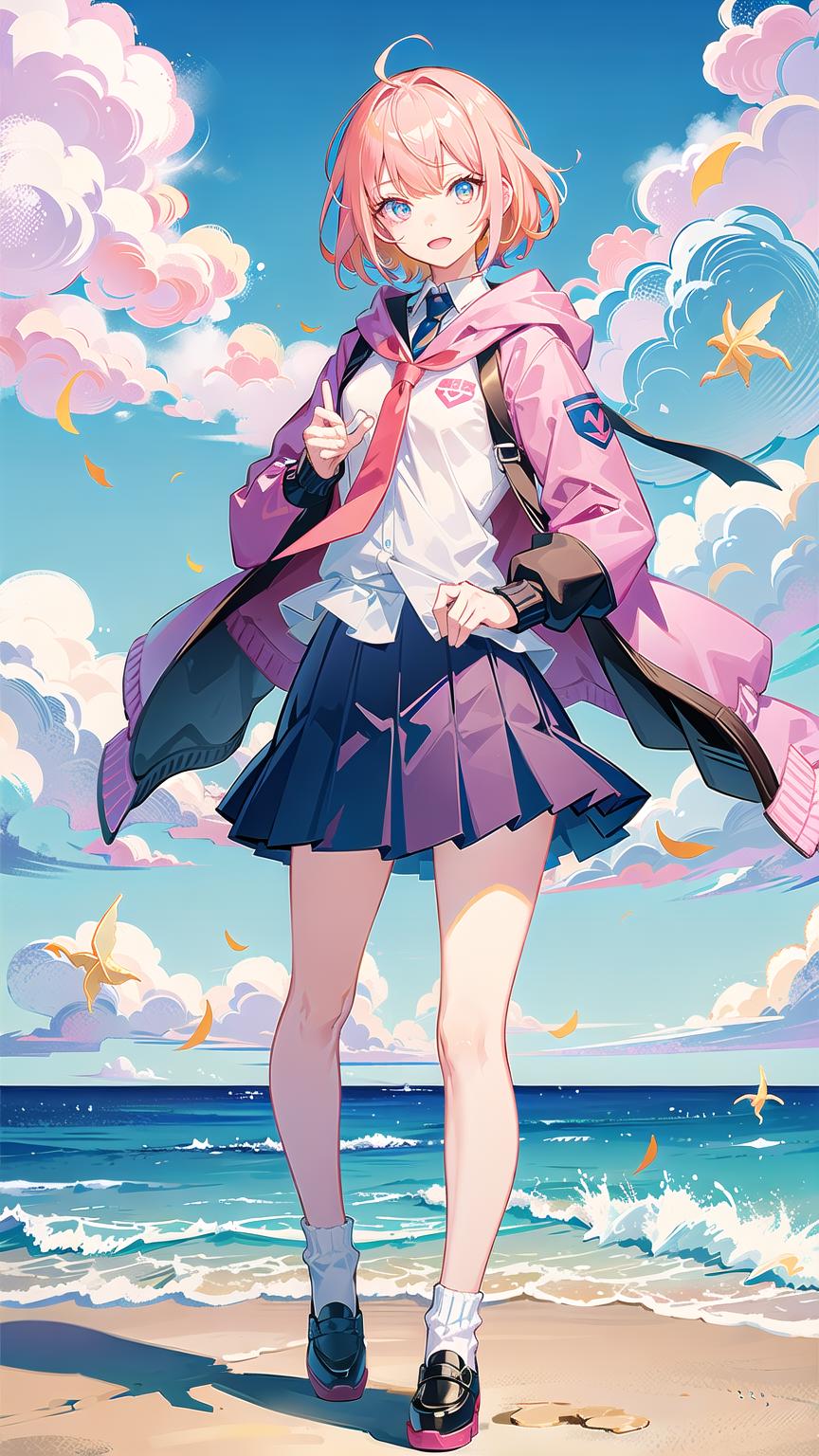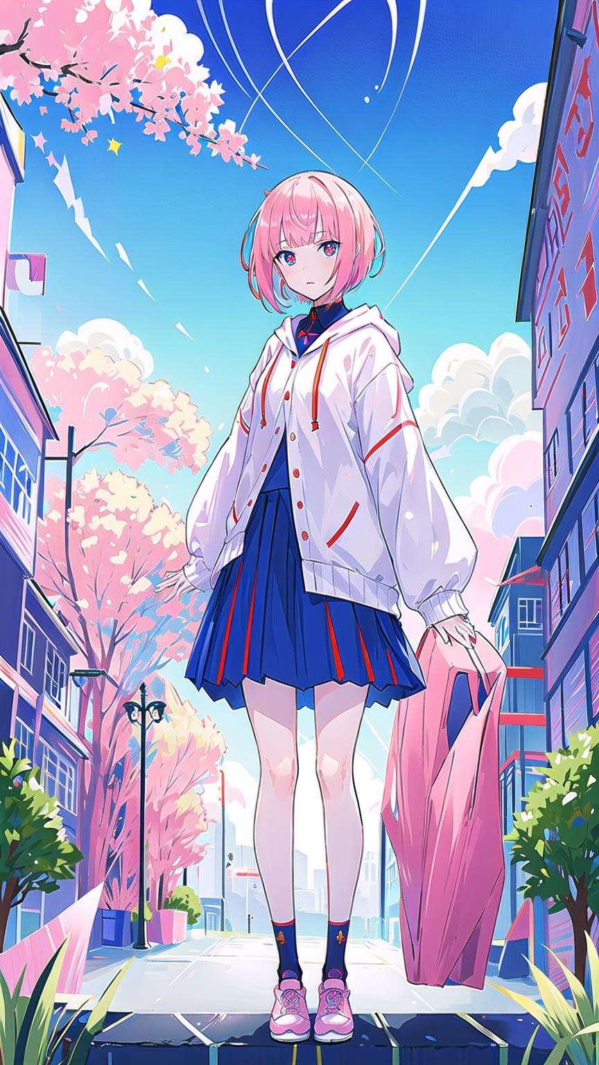 masterpiece, best quality,kafcevioailora, 1girl,virtual youtuber, solo,pink hair, full body, hood,(short hair:), jacket, skirt, shoes, looking at viewer, yellow pupils, socks, standing,long sleeves, slim bangs, blue socks, red eyes, blue eyes, hooded jacket,<lora:KafCevioV6.0:0.7>, blue sky, clouds, stars