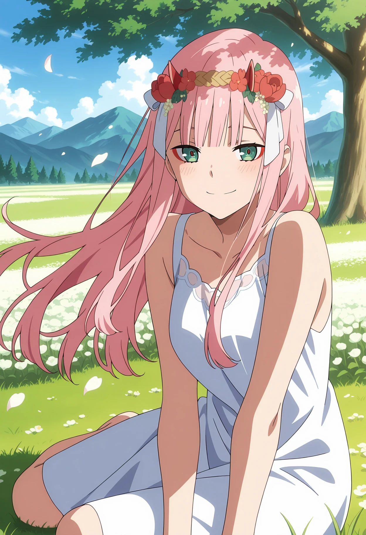 blunt bangs, long hair, pink hair, green eyes, red eyeshadow, red horns, hair flower, head wreath