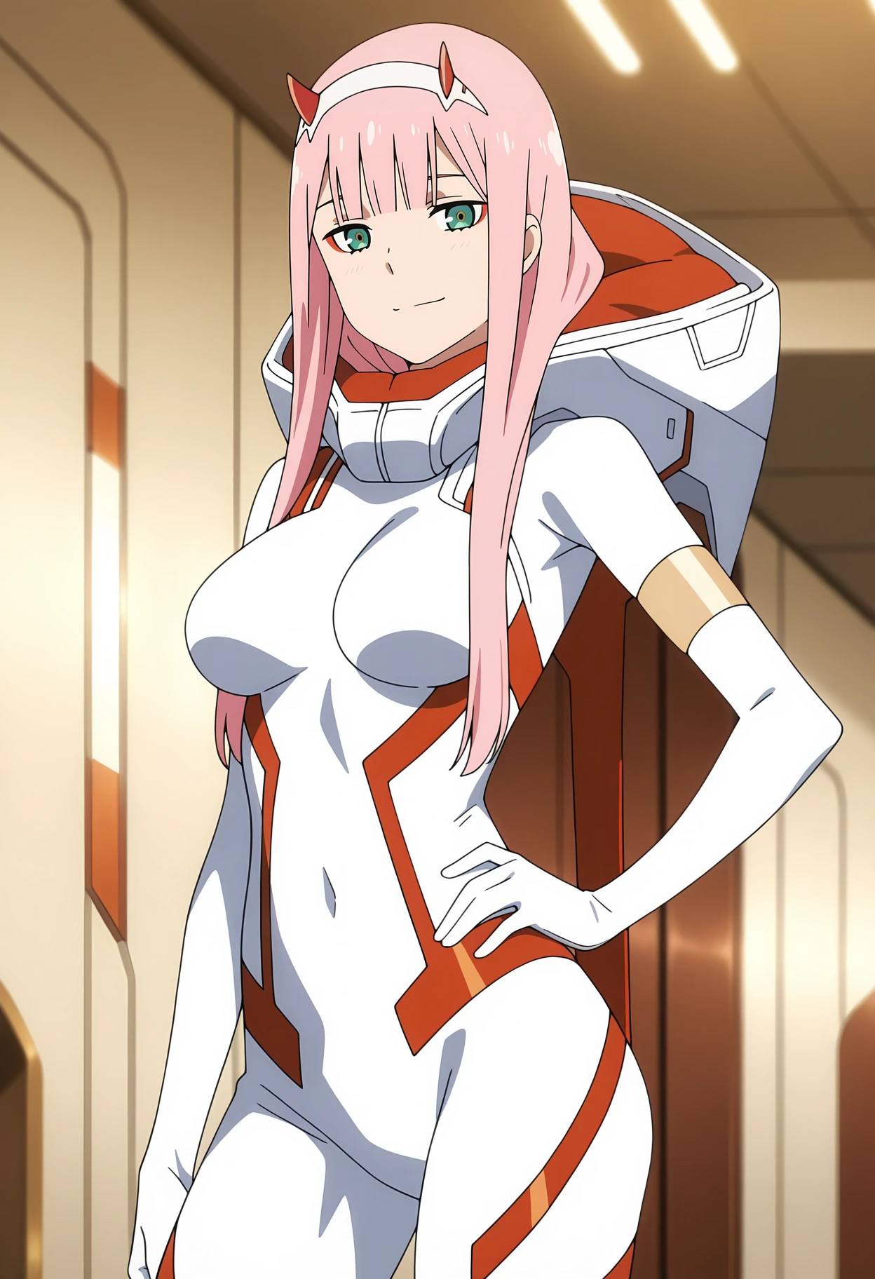 white bodysuit, hood, armlet, red trim, skin tight