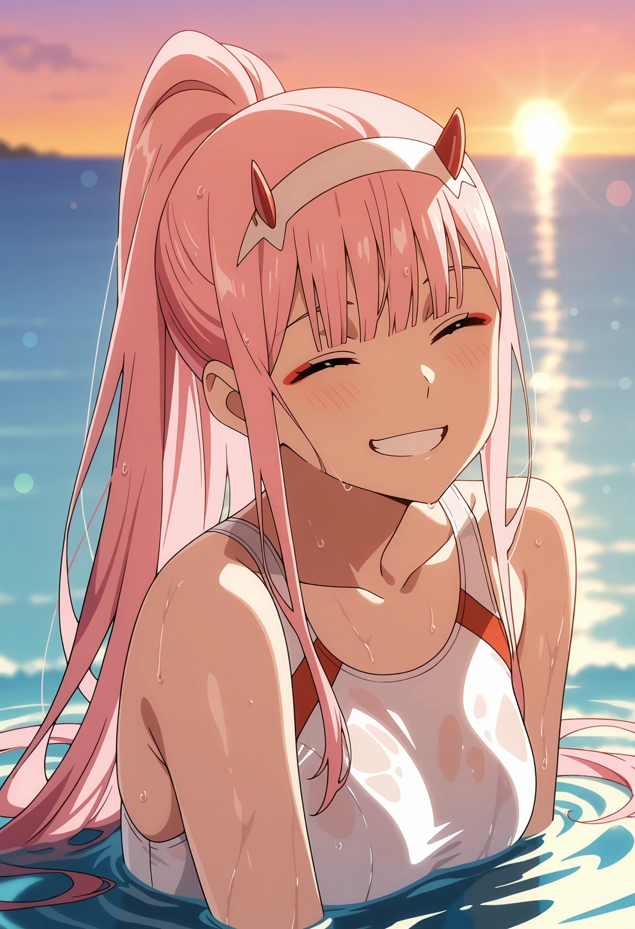 high ponytail, blunt bangs, long hair, pink hair, closed eyes, red eyeshadow, red horns, white hairband
