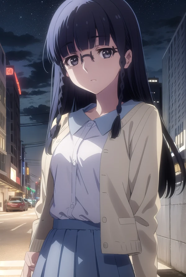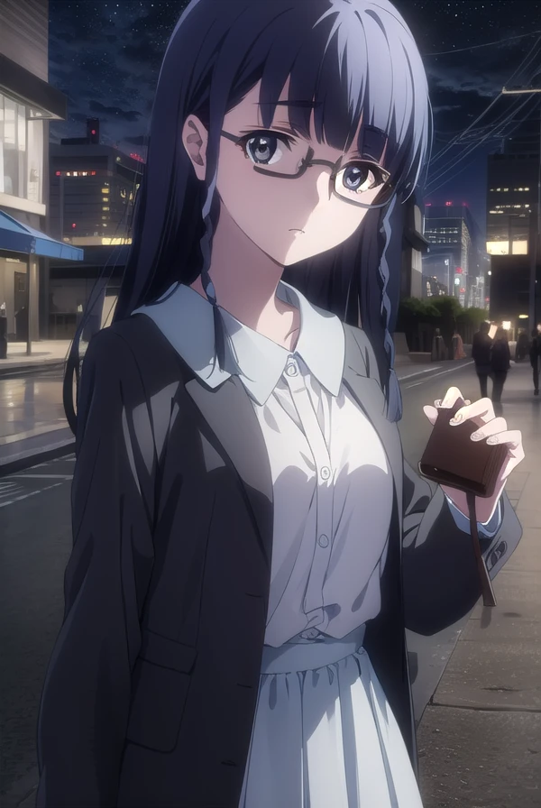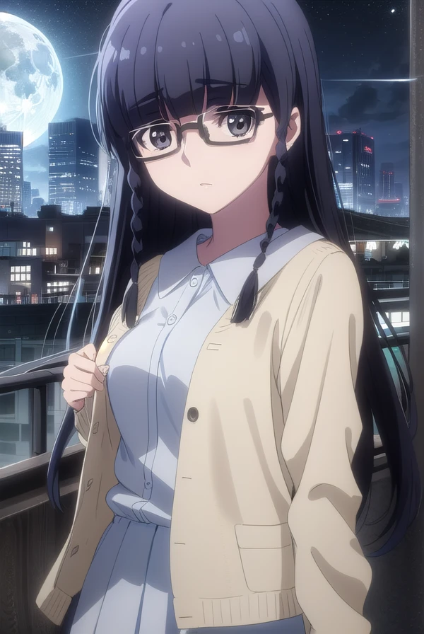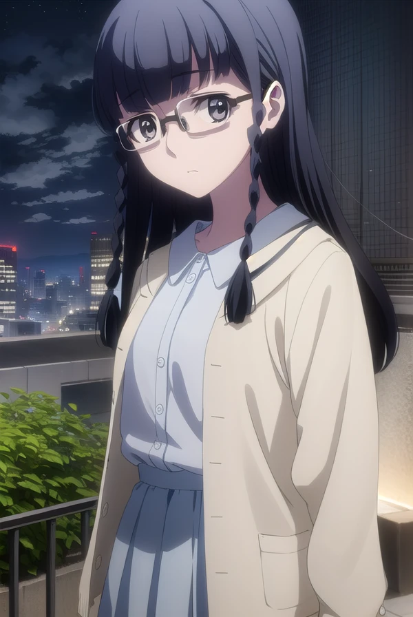 setsuna shimazaki, long hair, bangs, (black eyes:1.5), black hair, braid, glasses, blunt bangs, twin braids, semi-rimless eyewear, under-rim eyewear,