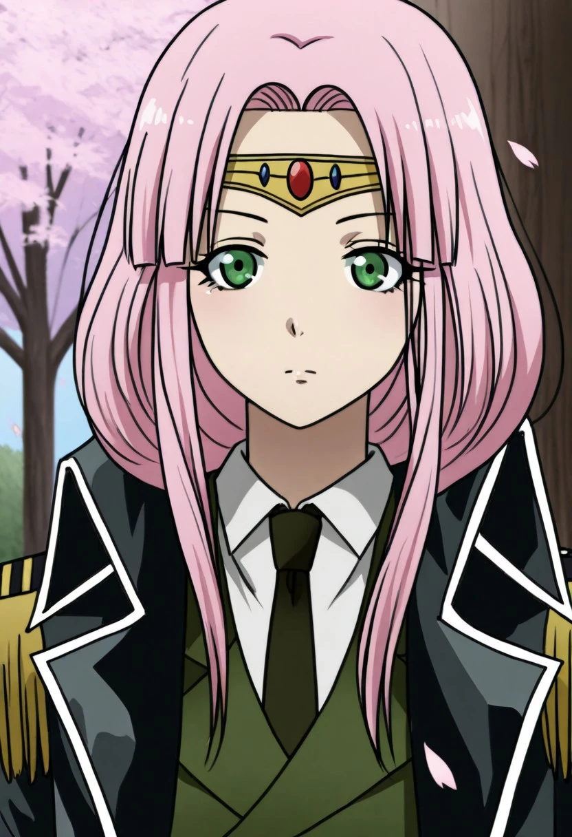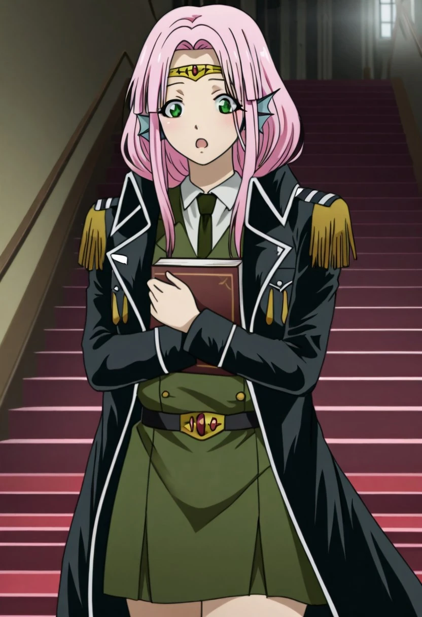 laymia, green eyes, pink hair, long hair, uniform, military uniform, coat, webbed ears.