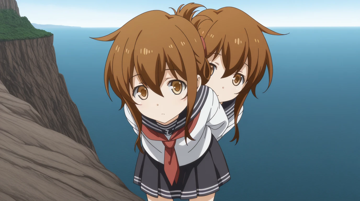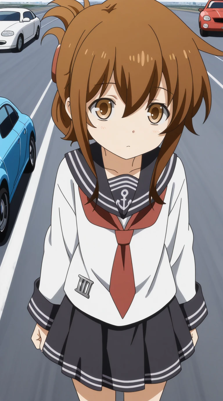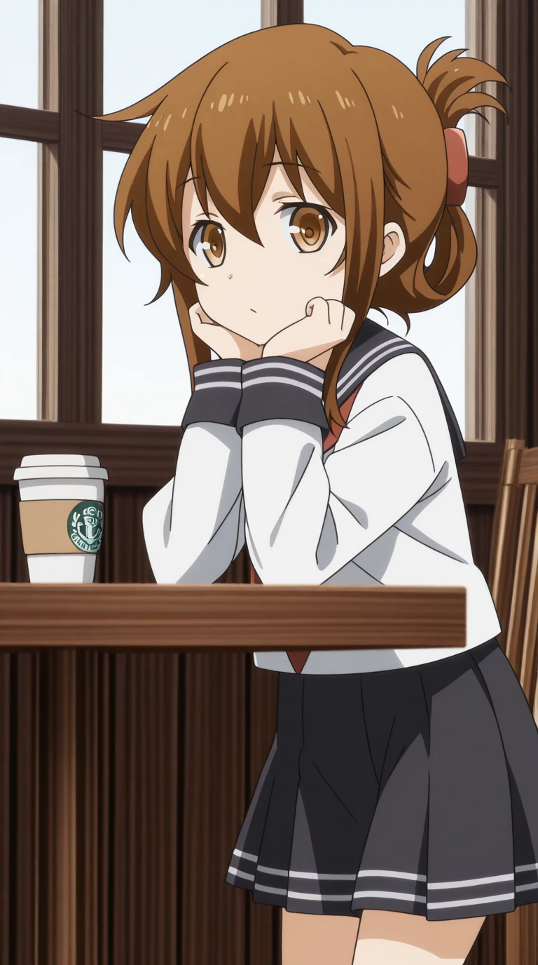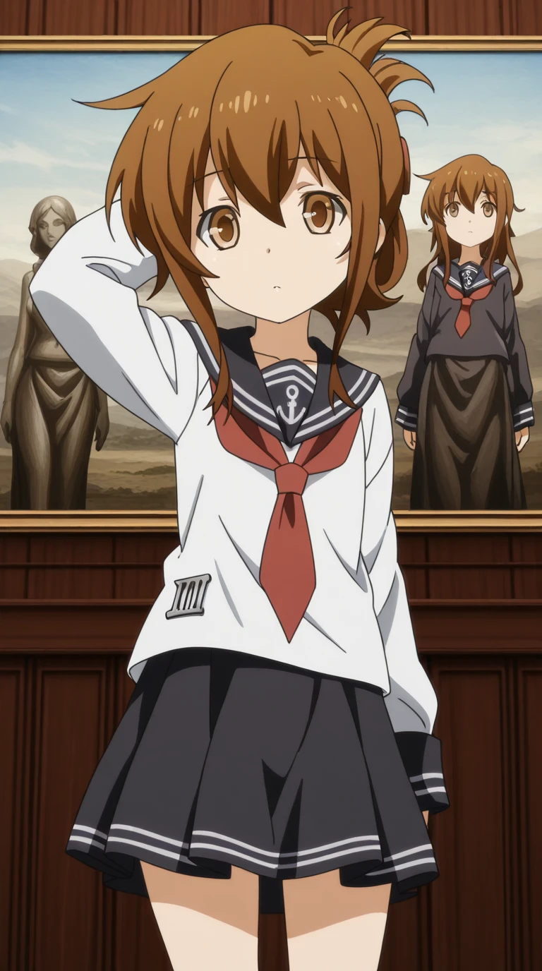 inazuma, inazuma (kancolle), long hair, brown hair, brown eyes, folded ponytail, anime screencap
