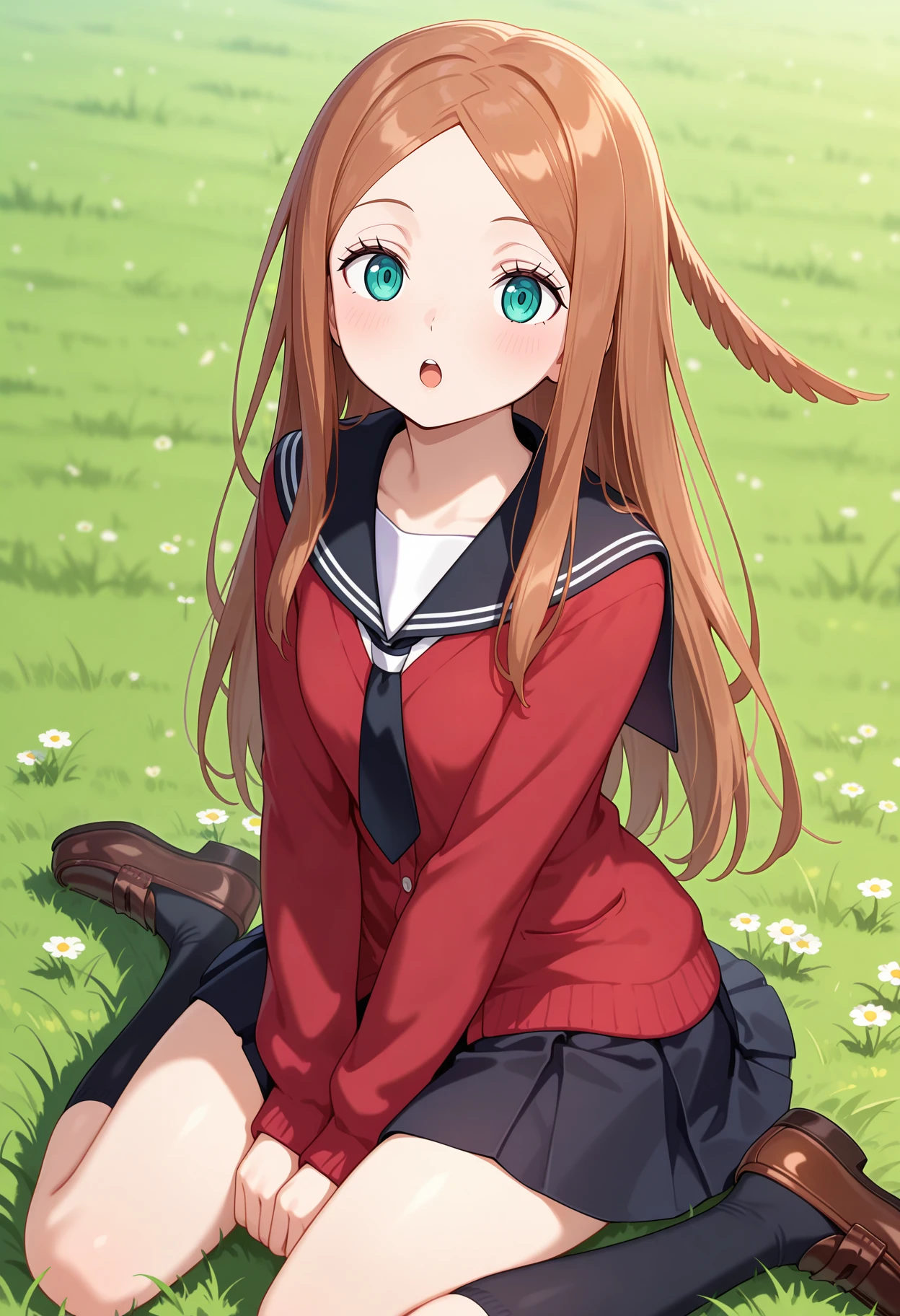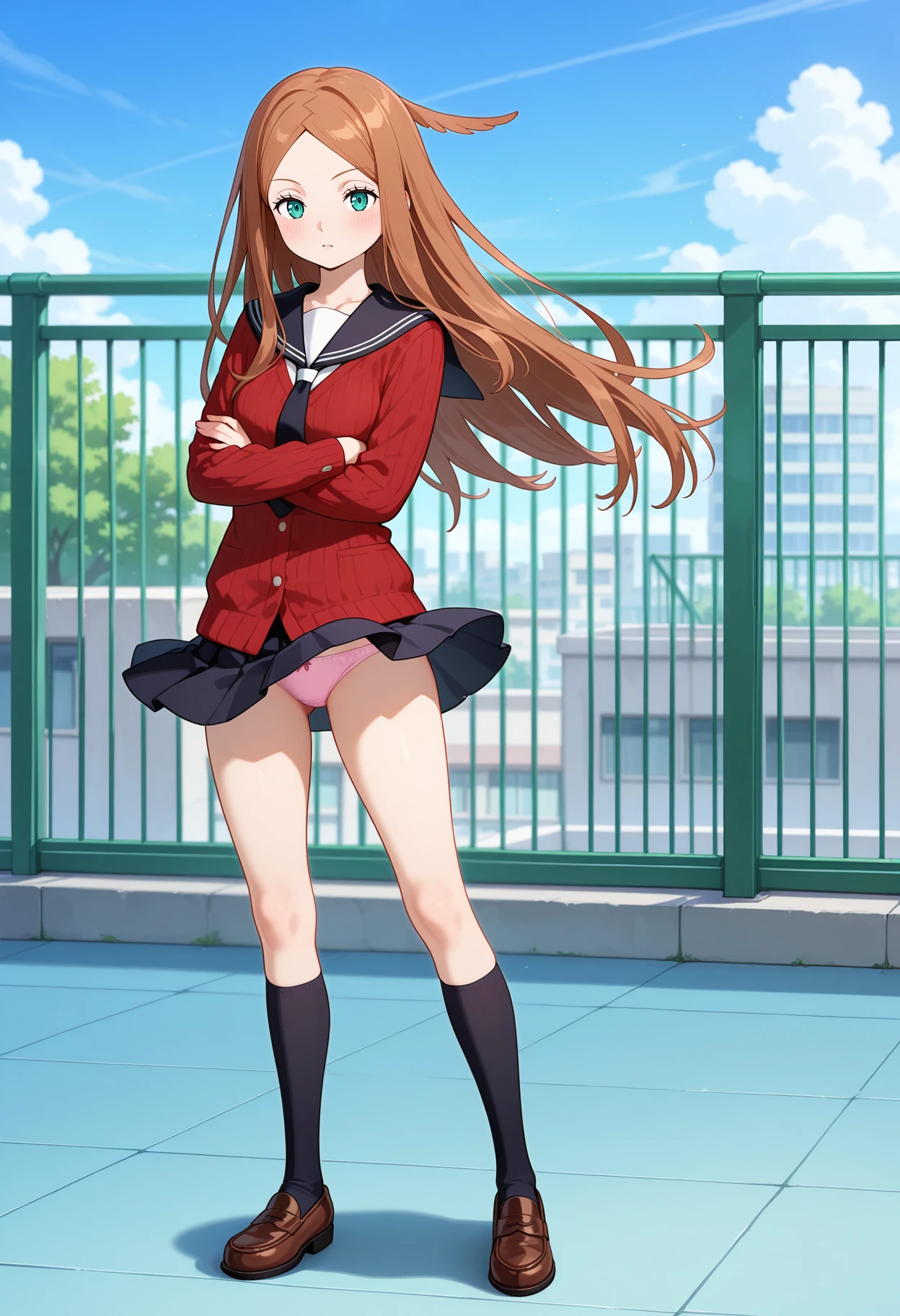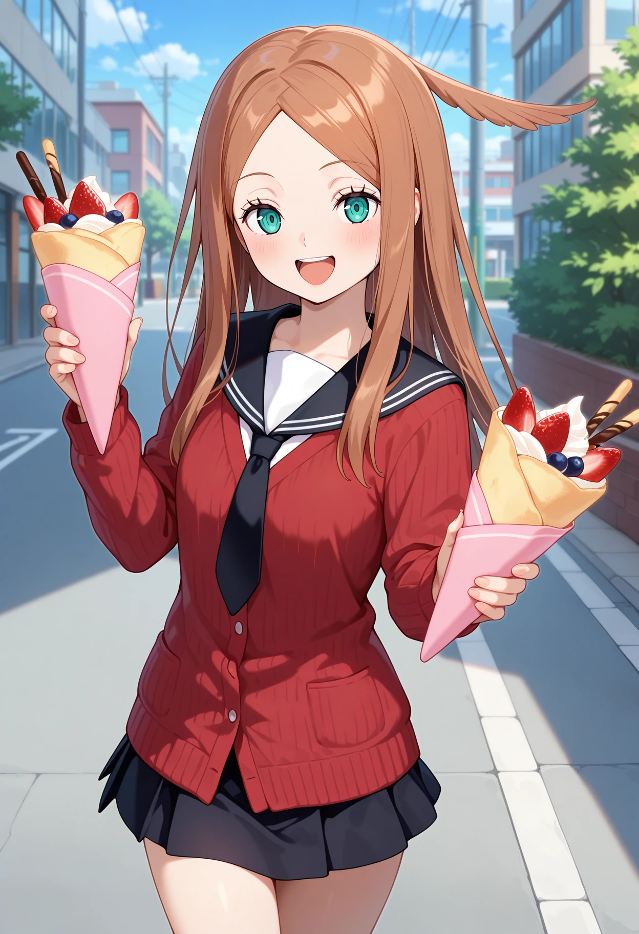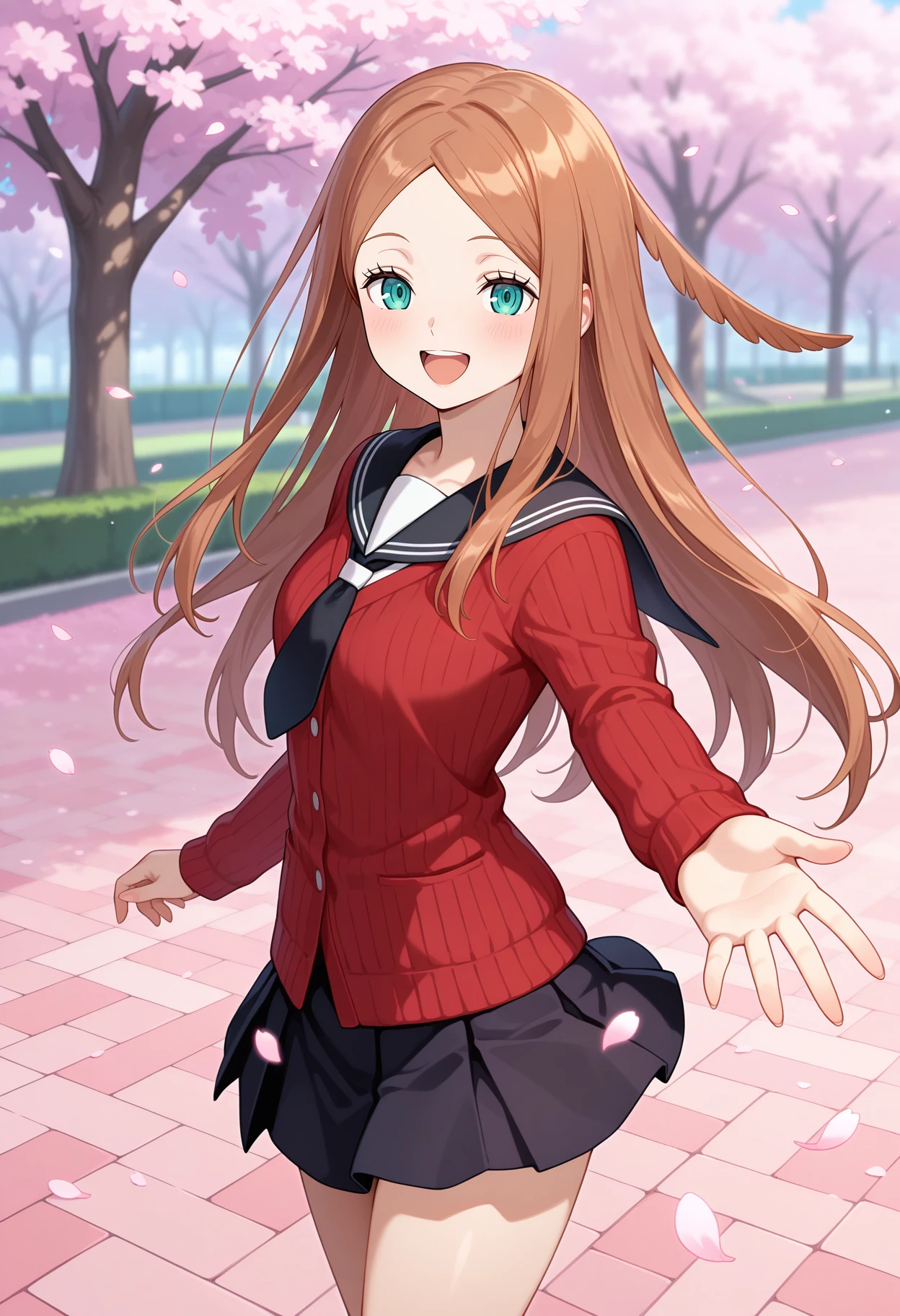 outfit1aakirie, long hair, brown hair, feather hair, school uniform, black sailor collar, black necktie, red cardigan, long sleeves, miniskirt, pleated skirt, black skirt