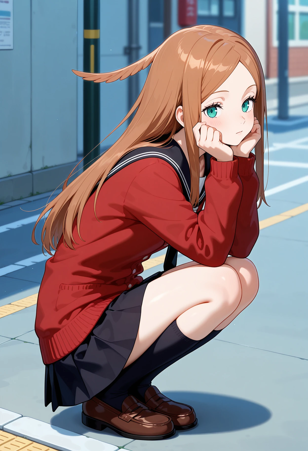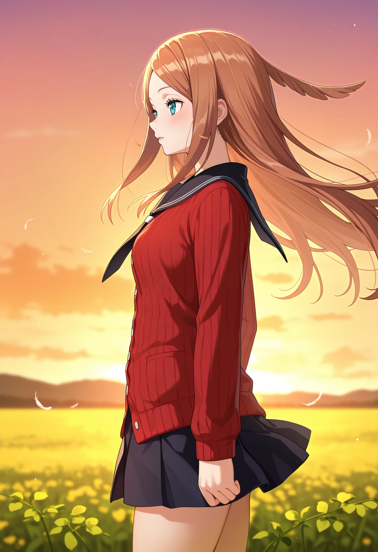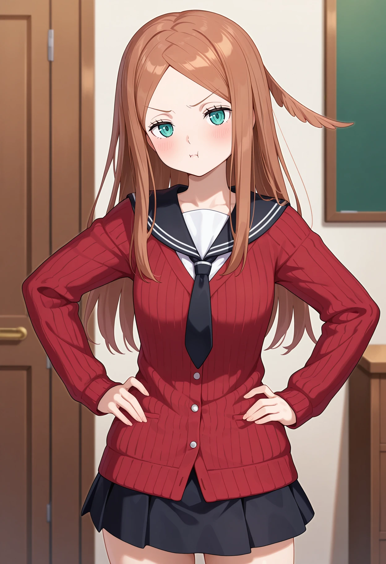 aakirie, long hair, brown hair, feather hair, school uniform, black sailor collar, black necktie, red cardigan, long sleeves, miniskirt, pleated skirt, black skirt