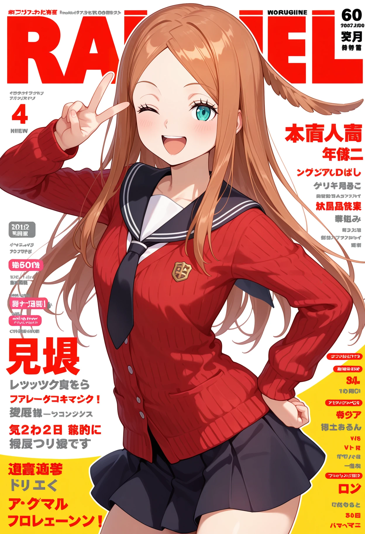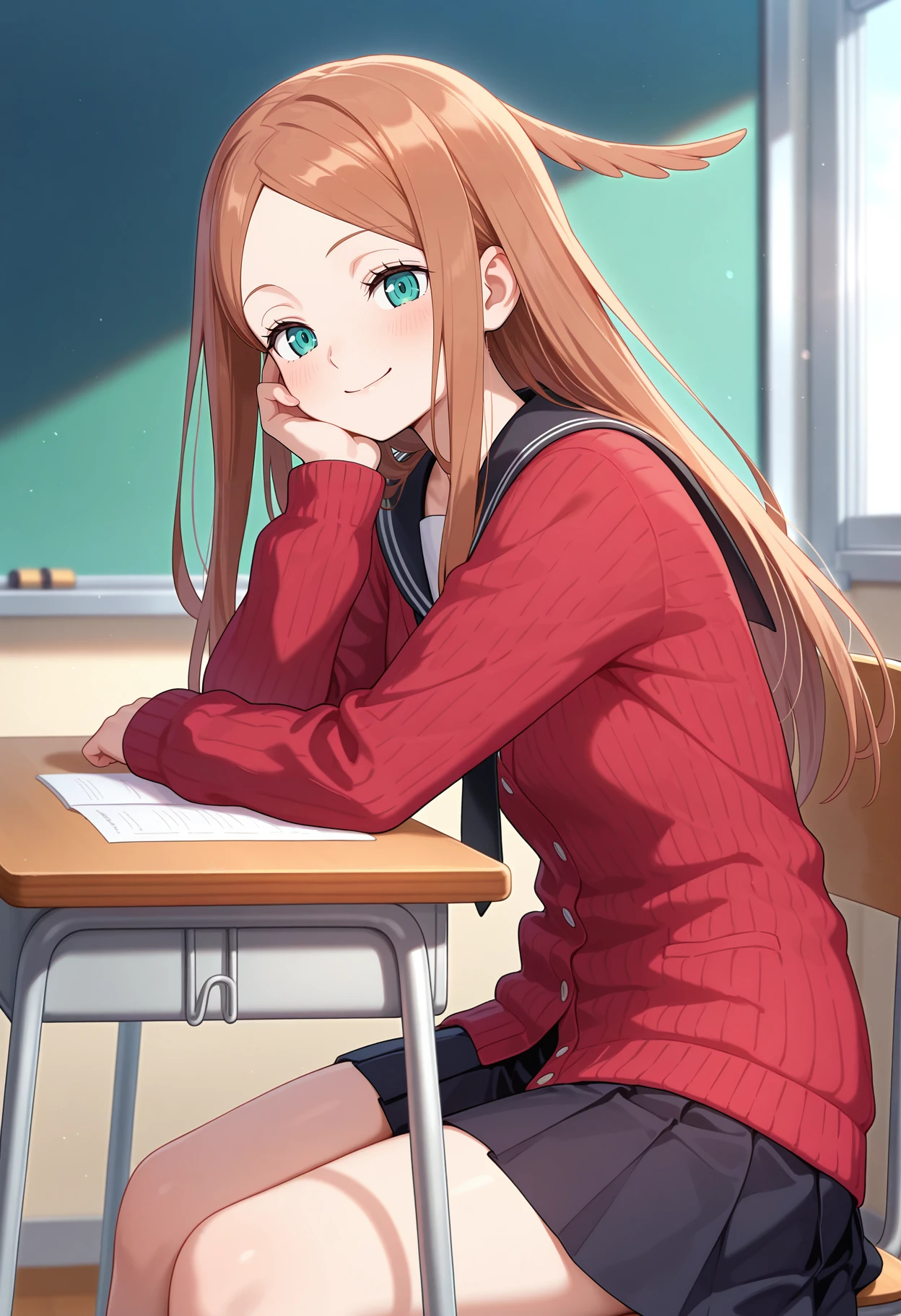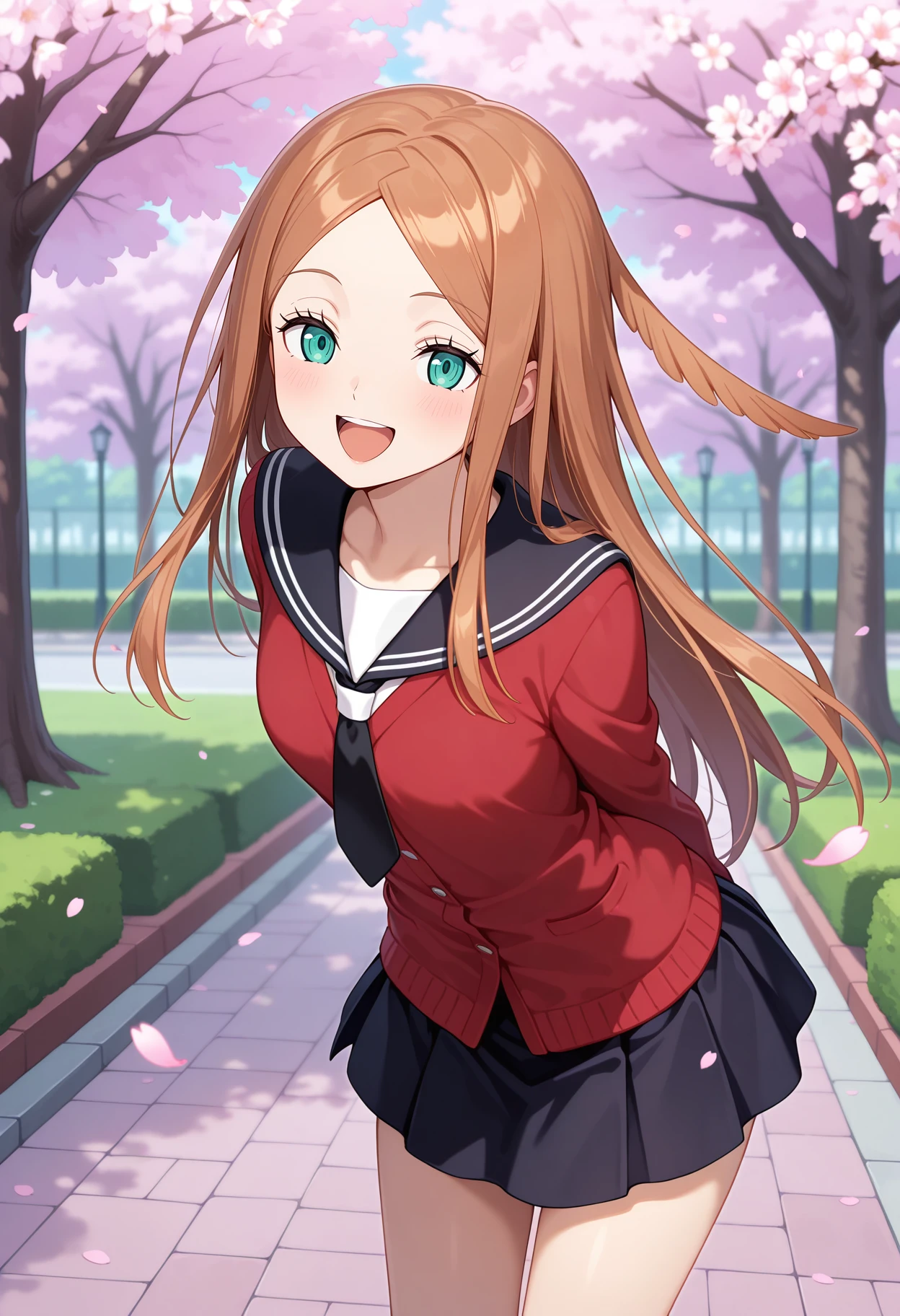 aakirie, long hair, brown hair, feather hair, school uniform, black sailor collar, black necktie, red cardigan, long sleeves, miniskirt, pleated skirt, black skirt