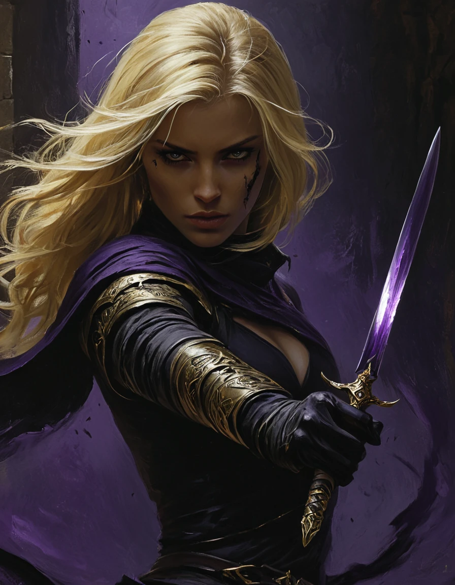 This Shadow Assassin concept embodies an enigmatic figure cloaked in mystery and menace, crafted with a striking palette of deep purple, shimmering gold, and jet black. Their attire blends elegance and utility: a sleek, dark ensemble adorned with intricate golden accents that glint like starlight in the void. Flowing purple fabrics or subtle ethereal trails of shadow weave into their attire, enhancing their mystique and reinforcing their command over the darkness.