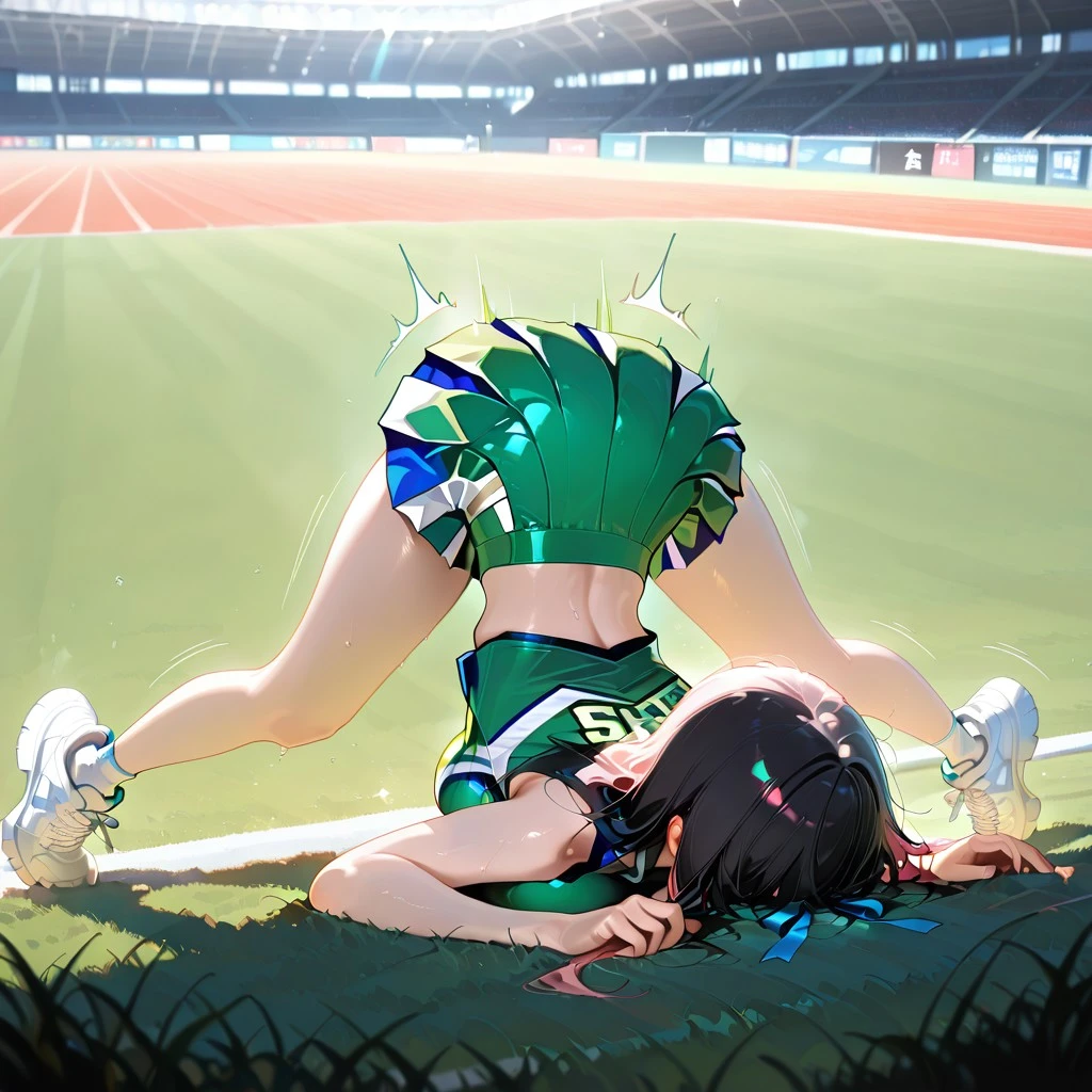 Tags ex: pink cheerleader uniform, pink sleeveless Cheer top, pink pleated cheer skirt, red pompoms, red ribbons, white sneakers, white safety shorts, handstand, happy, on a grass sports field, sunny day, blue sky,