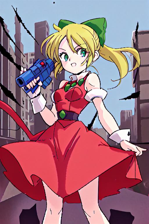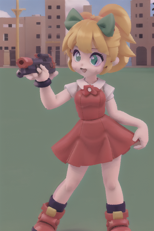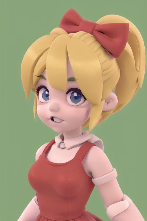 Green bow, blonde hair, red dress, blue eyes, Roll3D