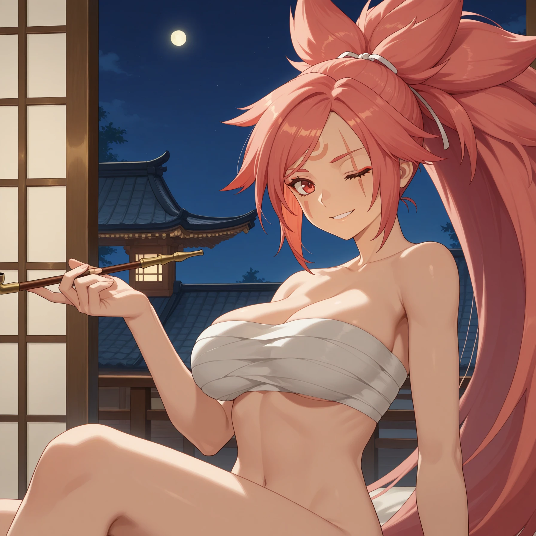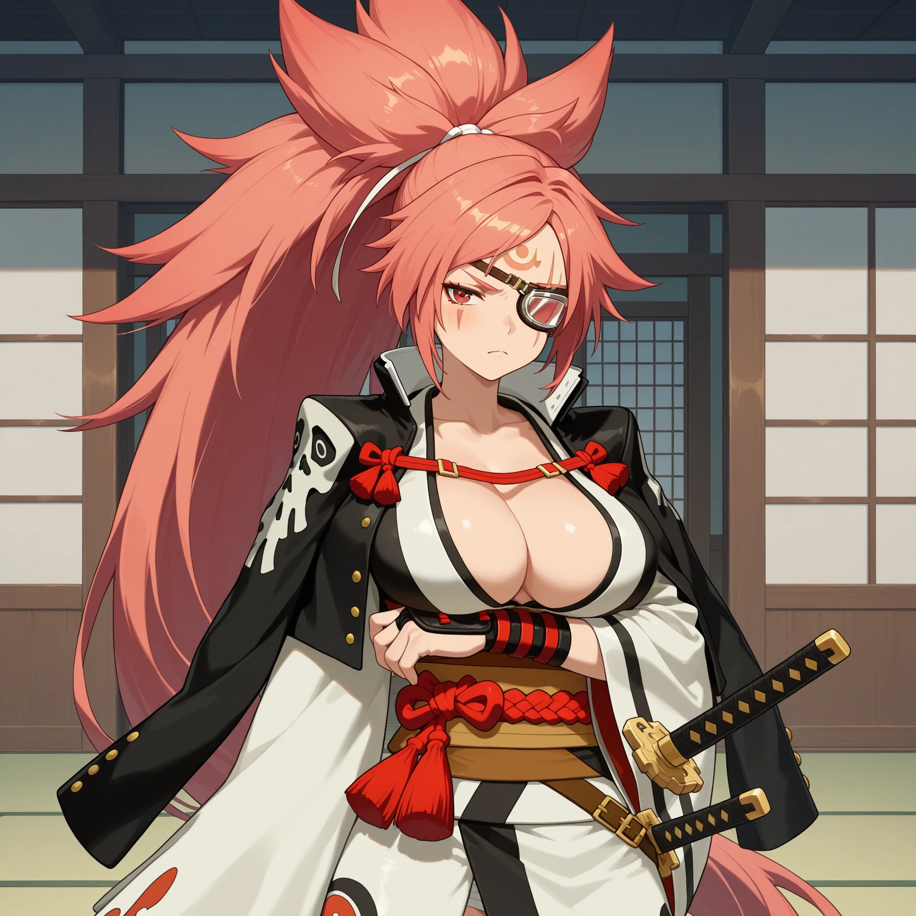 baigg, baiken, ponytail, very long hair, pink hair, forehead mark, facial mark, red eyes, one eye closed, scar across eye, eyepatch, black jacket, skull print, jacket on shoulders, multicolored kimono, open kimono, black arm guards, katana, sheath, brown sash, rope belt, sarashi underwear, black sandals, open-toe boots