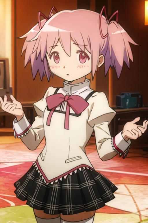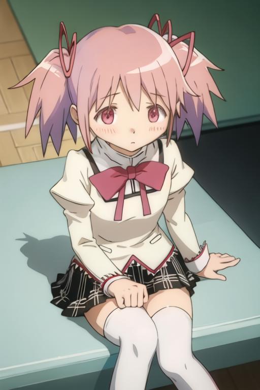 The trigger word is kaname_madoka_puellamagimadokamagica, and the recommended tags are best quality, masterpiece, highres, solo, {kaname_madoka_puellamagimadokamagica:1.15}, pink_hair, short_hair, twintails, short_twintails, pink_eyes, ribbon, hair_ribbon, bow, blush.