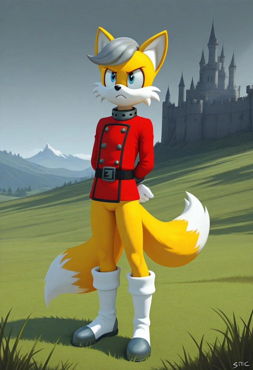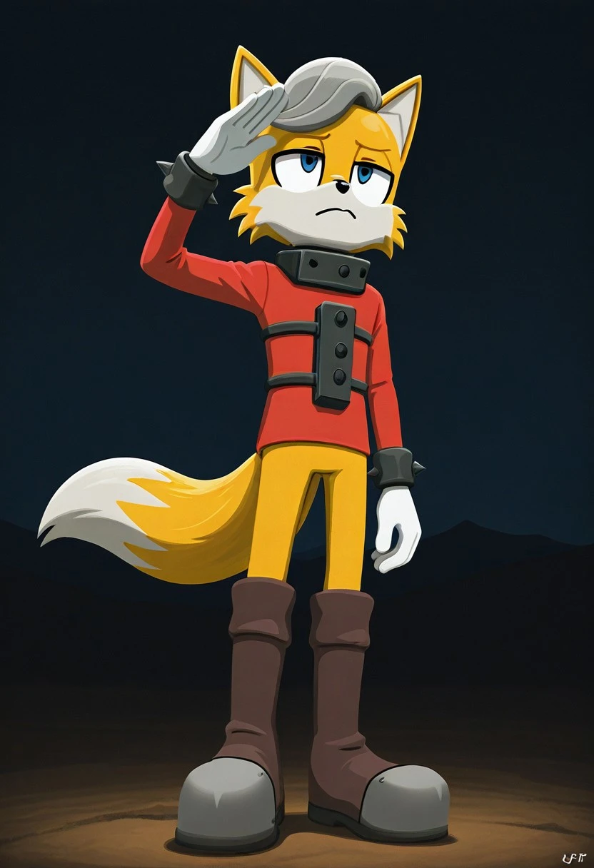 Anti-Tails the fox, yellow fur, blue eyes, gray tuft of hair, two tails, red shirt, white trimming, , white gloves, red and white boots