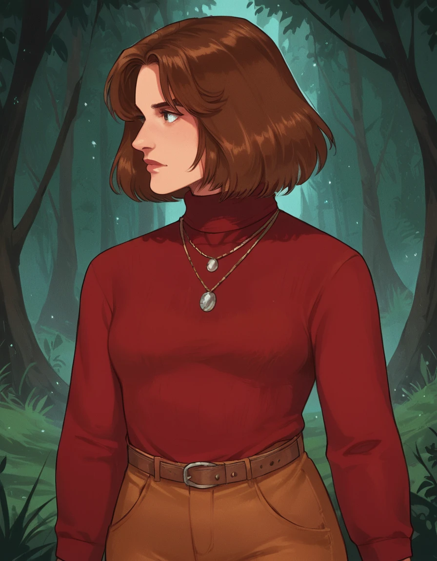 1girl, solo, brown hair, turtleneck, jewelry, short hair, necklace, pants, brown pants, belt, cheryl williams