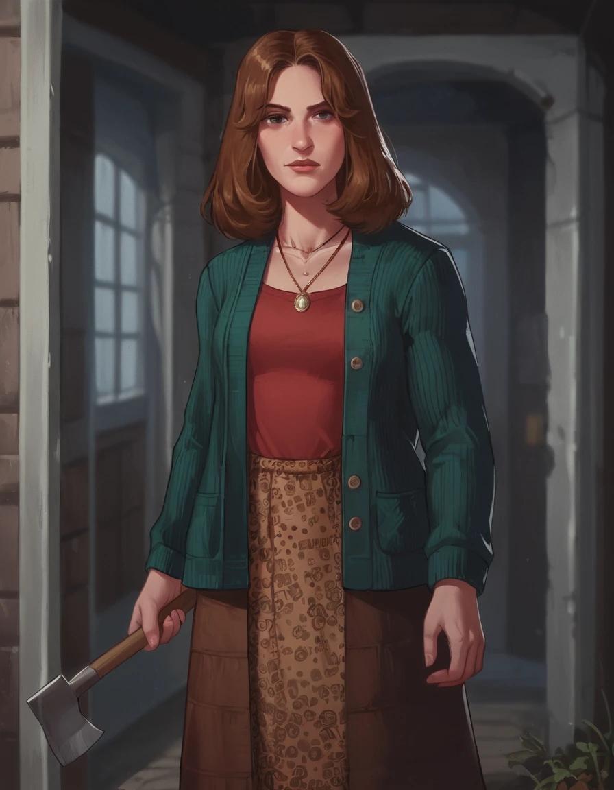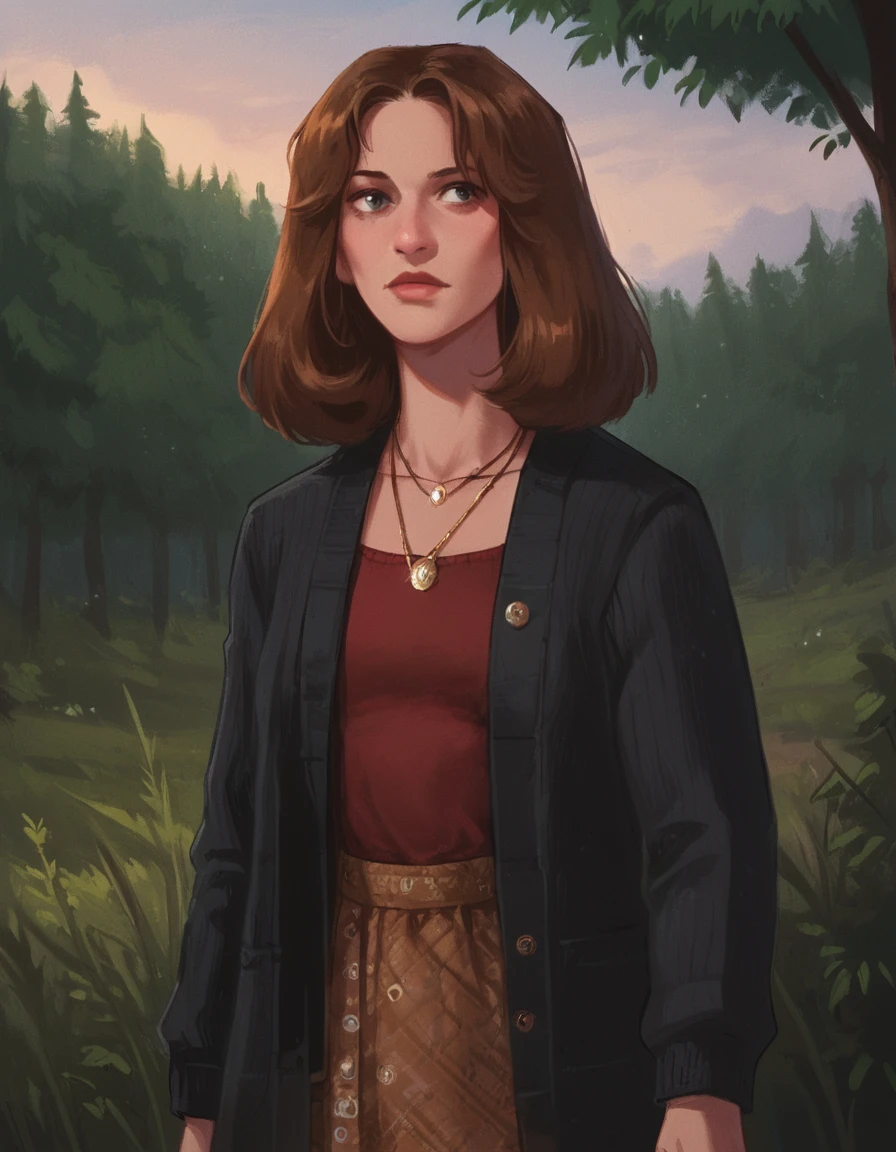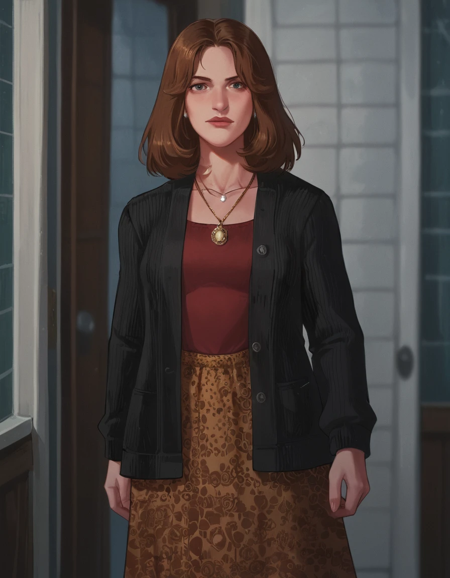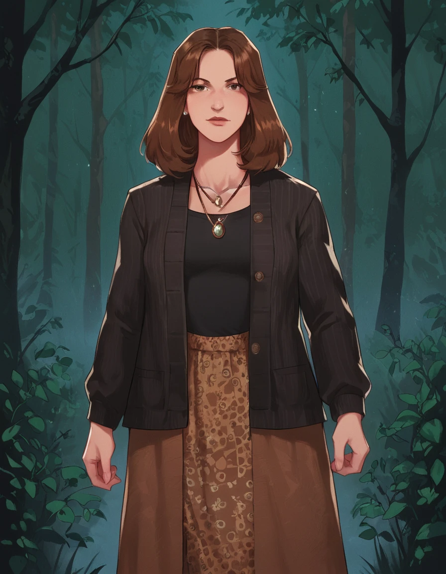 1girl, solo, jewelry, necklace, skirt, jacket, brown hair, open clothes, long skirt, cheryl williams