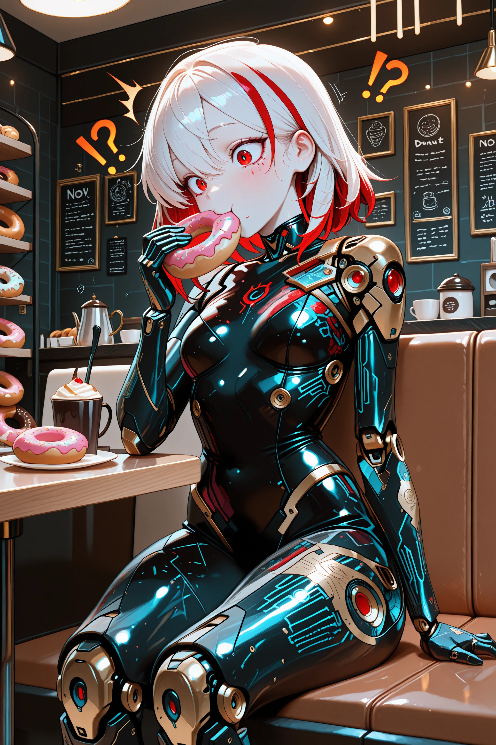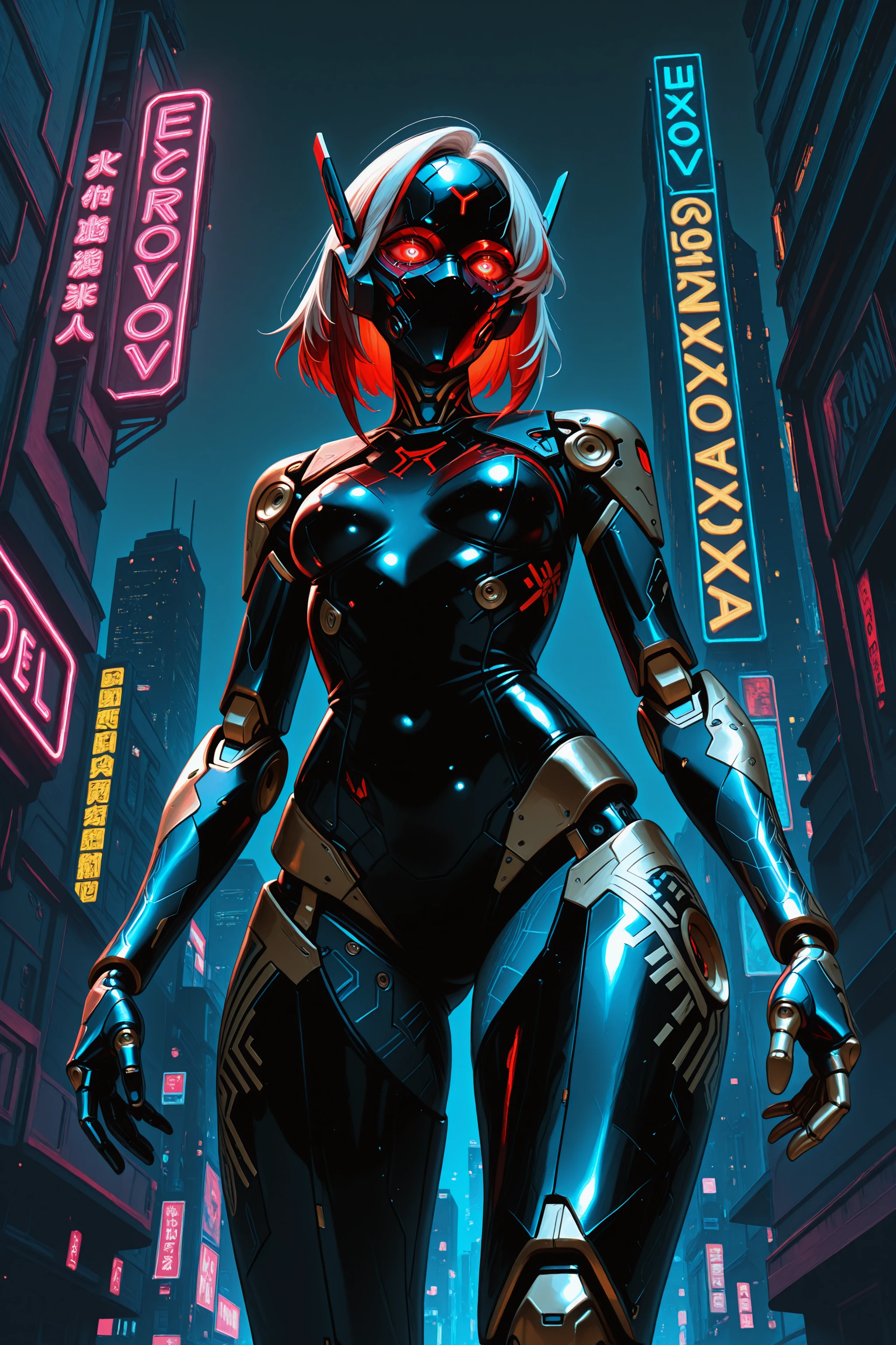 has been trained with a prompt "1girl, android, red eyes, glowing eyes, medium hair, white hair, red hair, streaked hair, small breasts, (full mask, covered face:1.2), robot ears, black cybernetic bodysuit, black mechanical arms, black mechanical legs, golden lines, glowing lines, patterned clothing, golden pattern, circuit board pattern, " and versions of that to modify for no mask and ???? looks