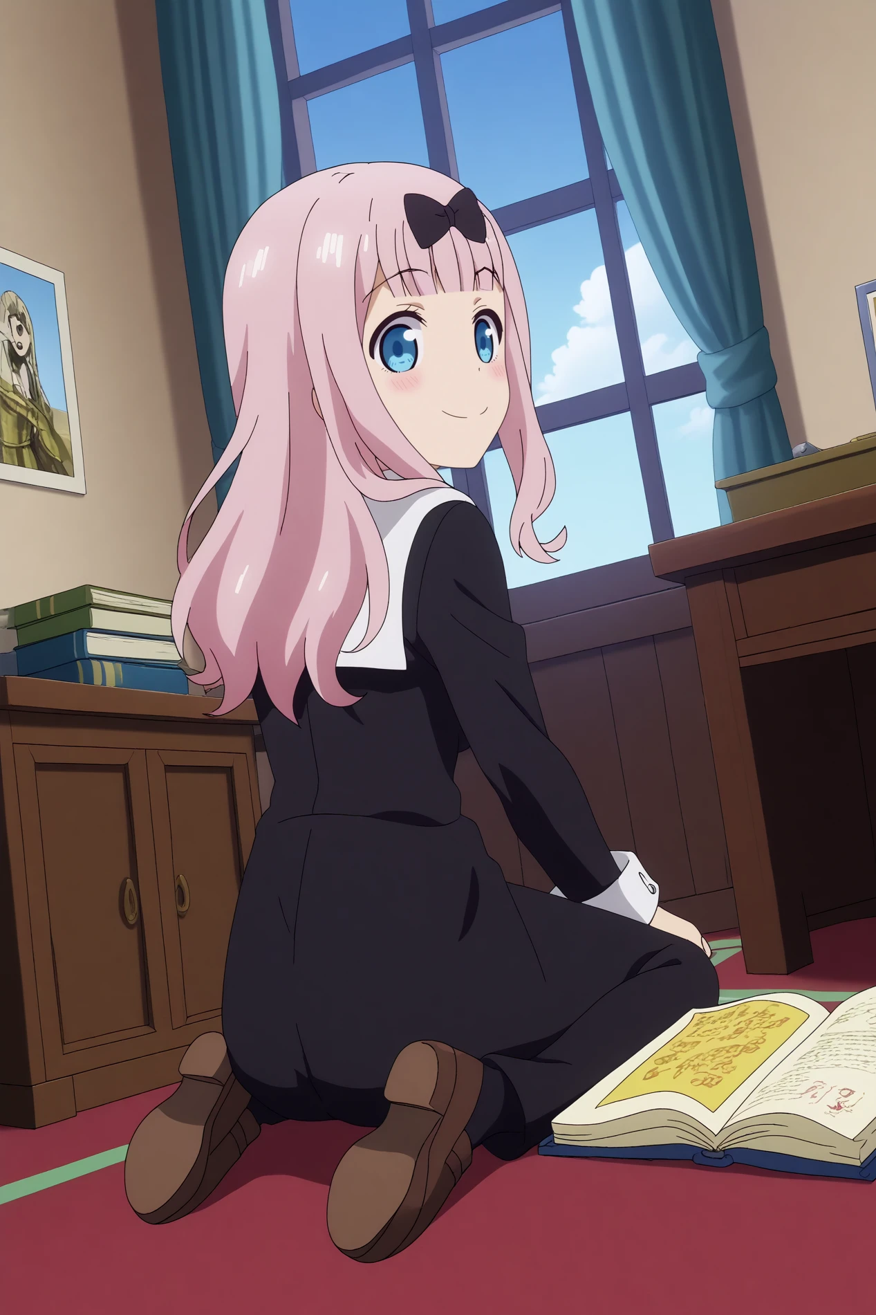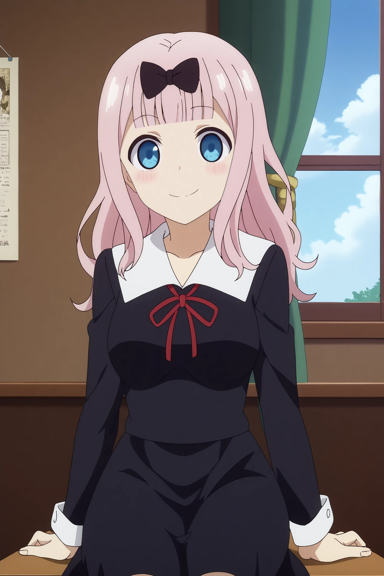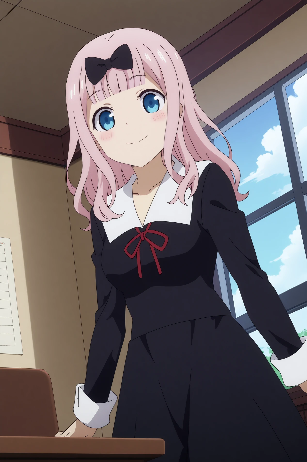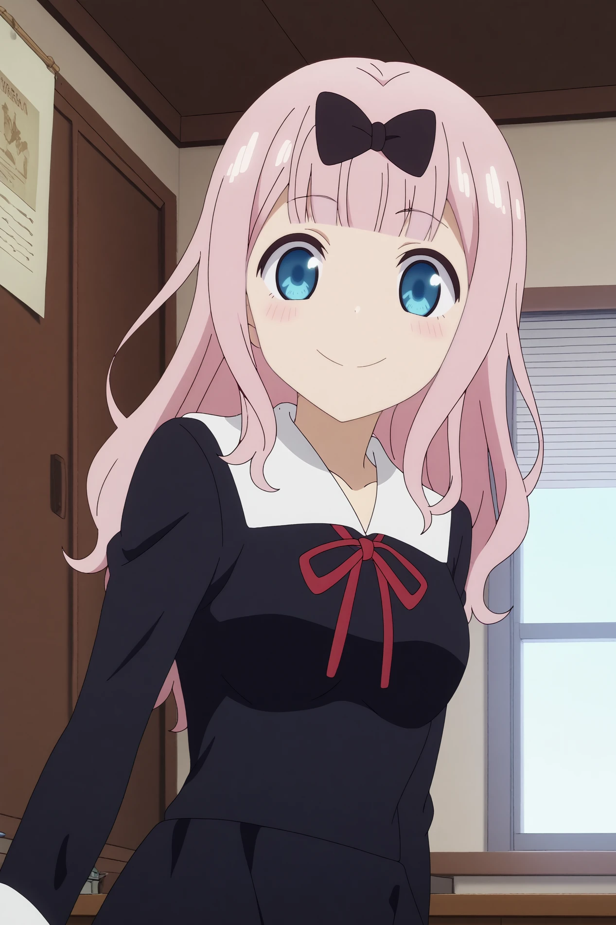 chika fujiwara,1girl,shuuchiin academy school uniform,school uniform,black bow,bangs,smile,bow,red ribbon,blunt bangs