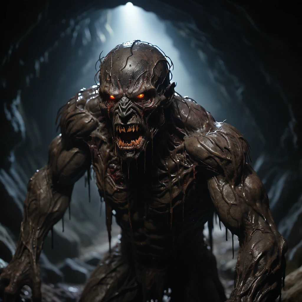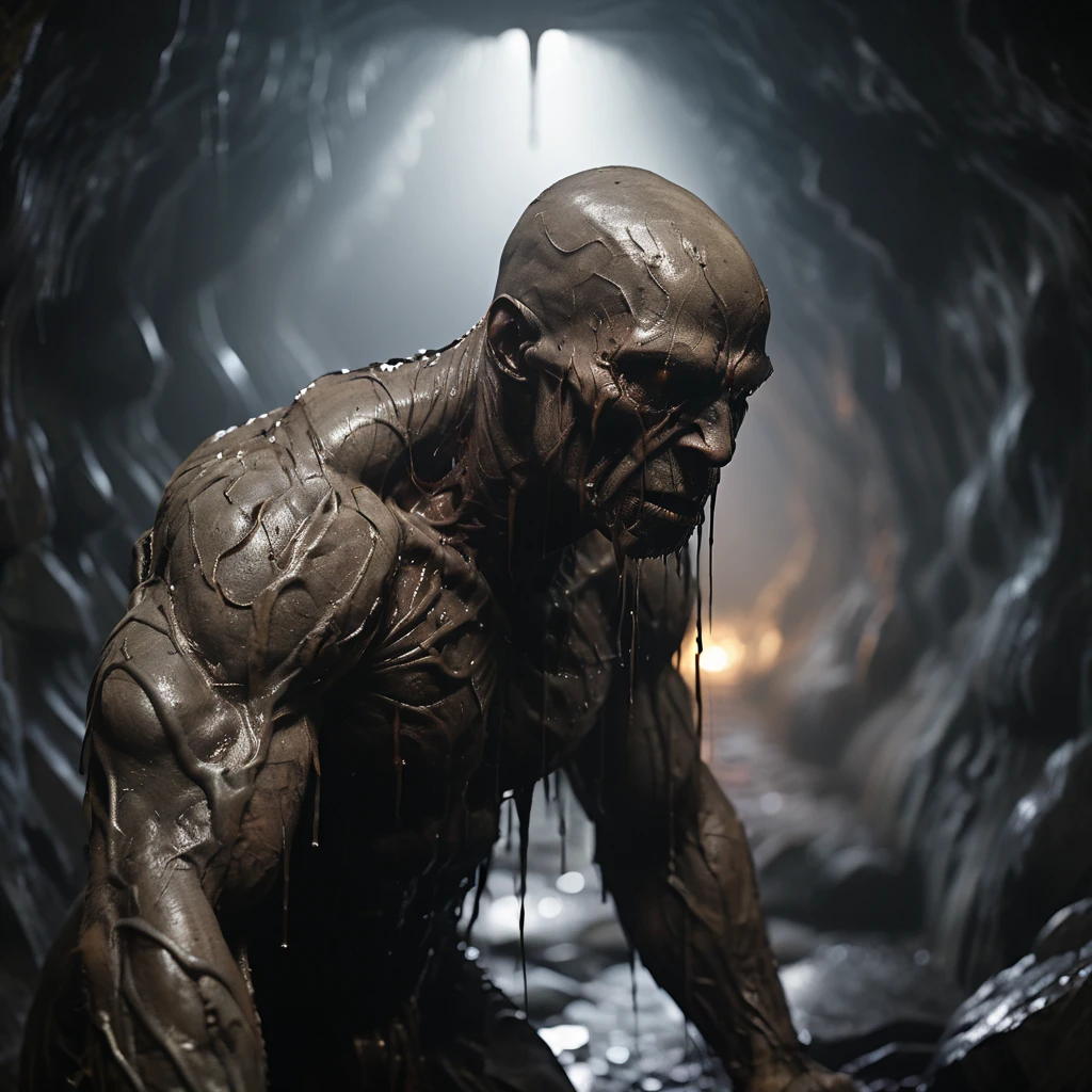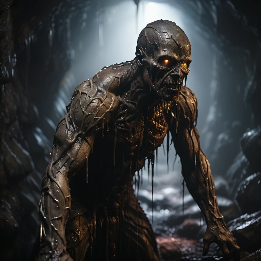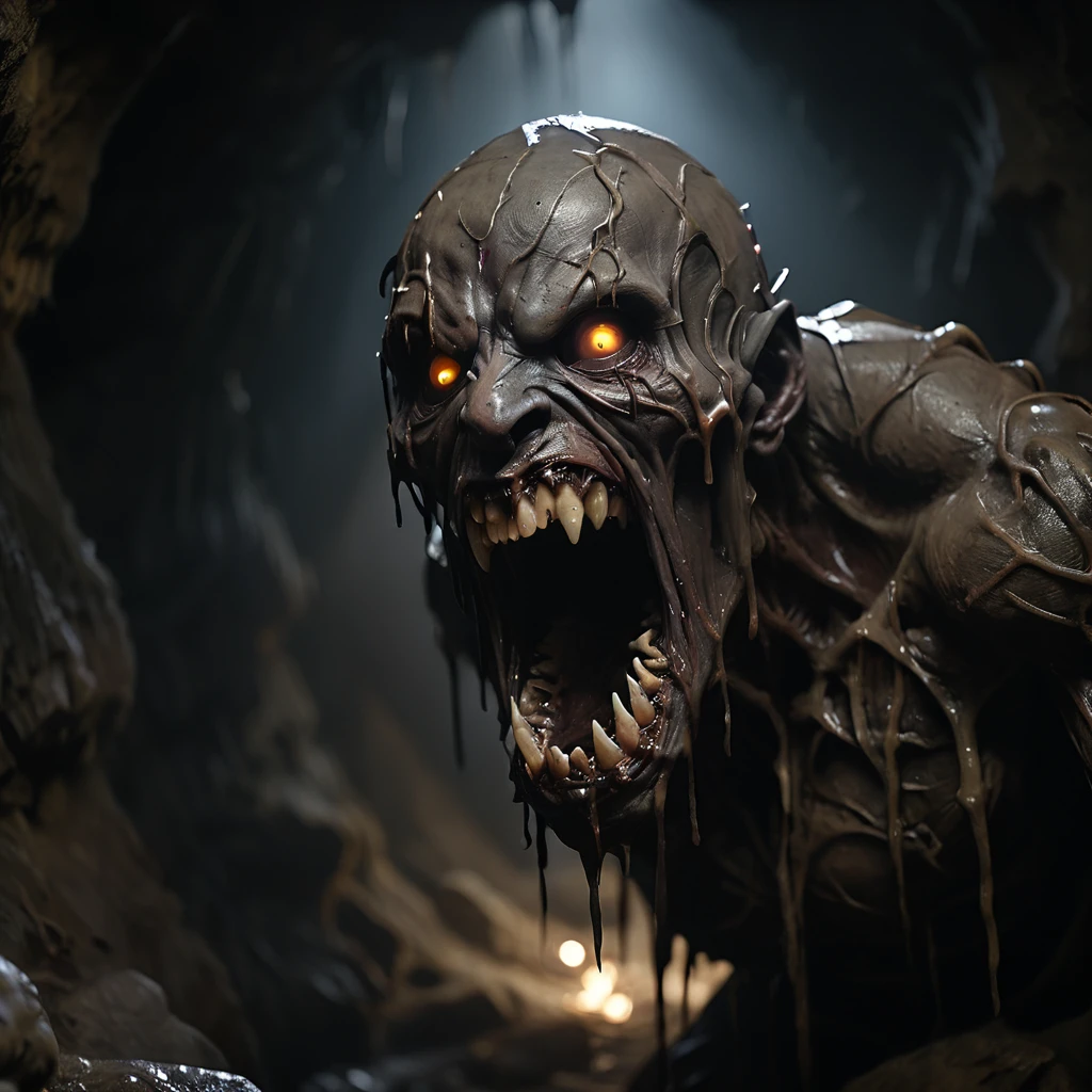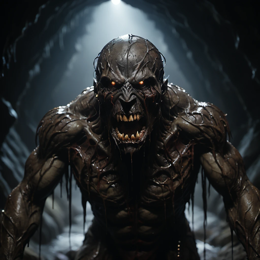 1boy, bald, black background, blood, blurry, blurry background, dripping, emerging from floor, emerging from wall, facial hair, from side, glowing, glowing eyes, gyrgogg, male focus, manly, muscular, no humans, open mouth, outdoors, realistic, red eyes, sharp teeth, shiny, solo, teeth, upper body, veins, water, wet, yellow eyes, Description
