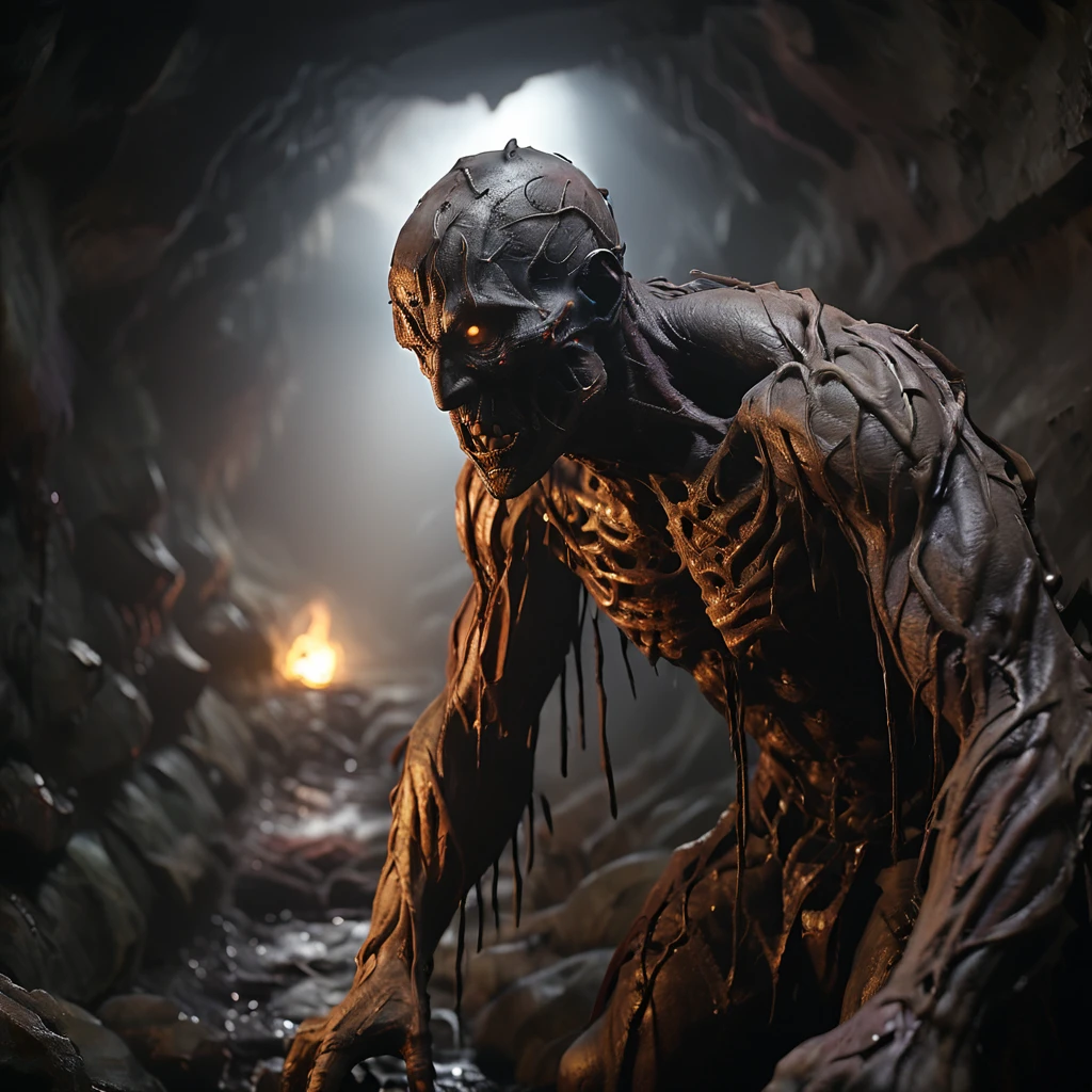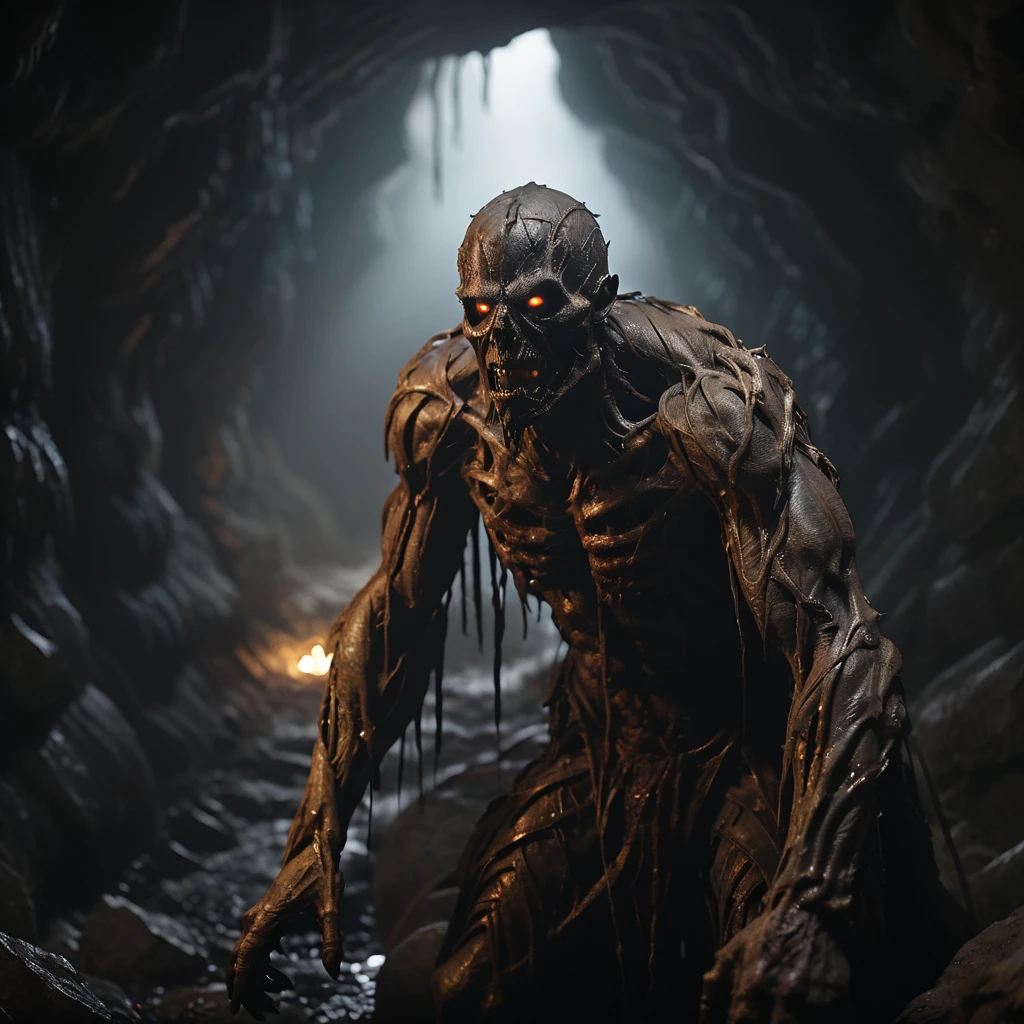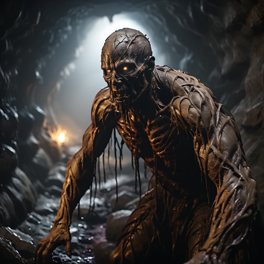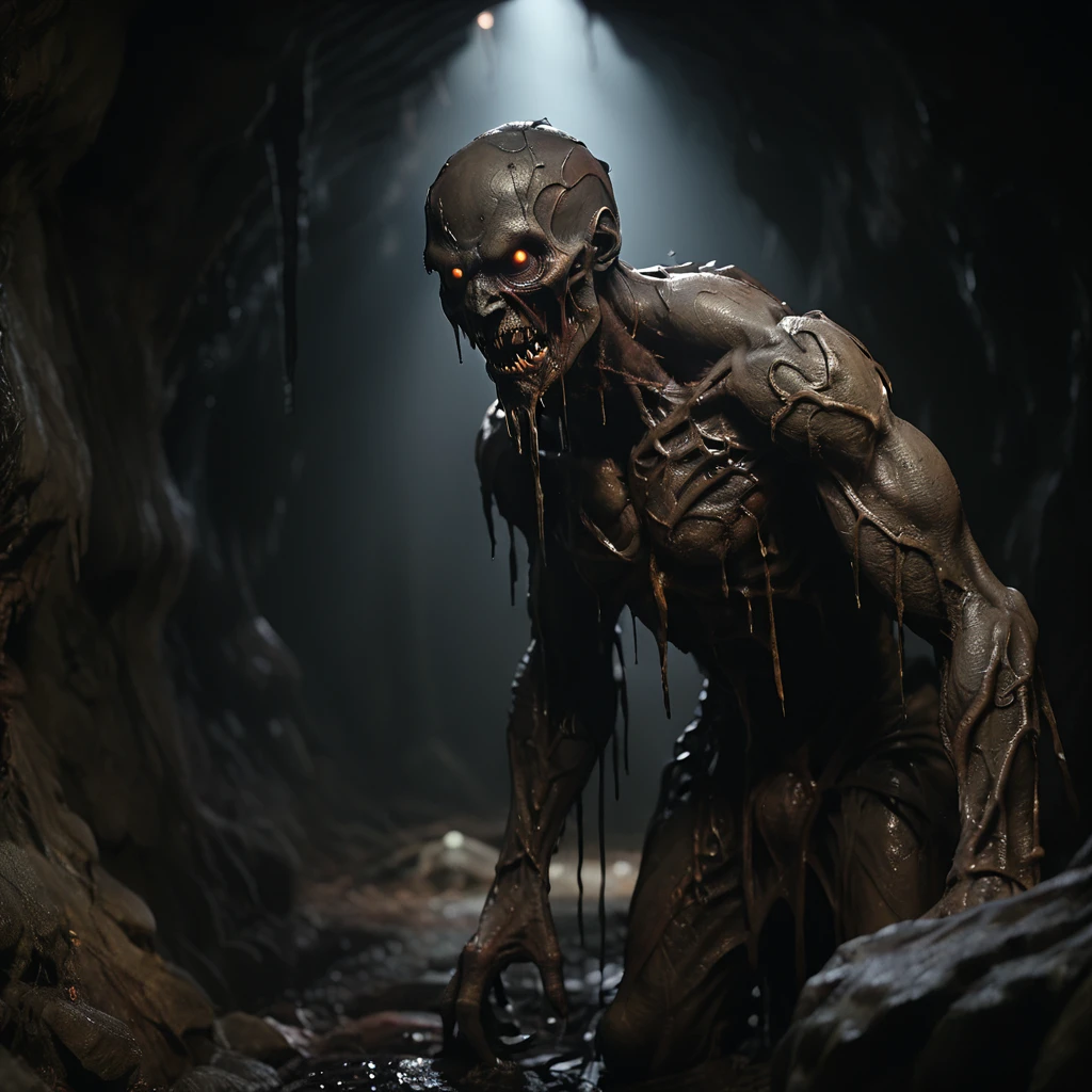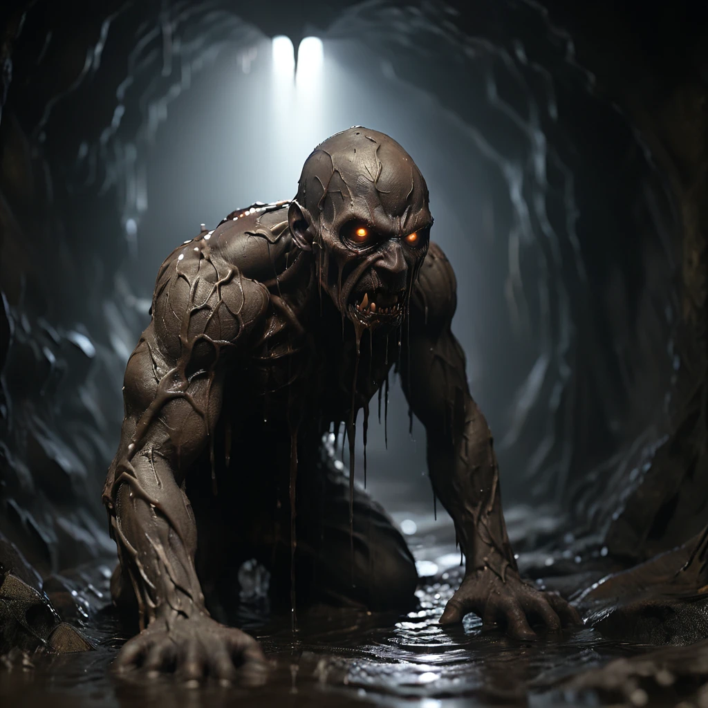 1boy, bald, black background, blood, blurry, blurry background, dripping, emerging from floor, emerging from wall, facial hair, from side, glowing, glowing eyes, gyrgogg, male focus, manly, muscular, no humans, open mouth, outdoors, realistic, red eyes, sharp teeth, shiny, solo, teeth, upper body, veins, water, wet, yellow eyes, Description