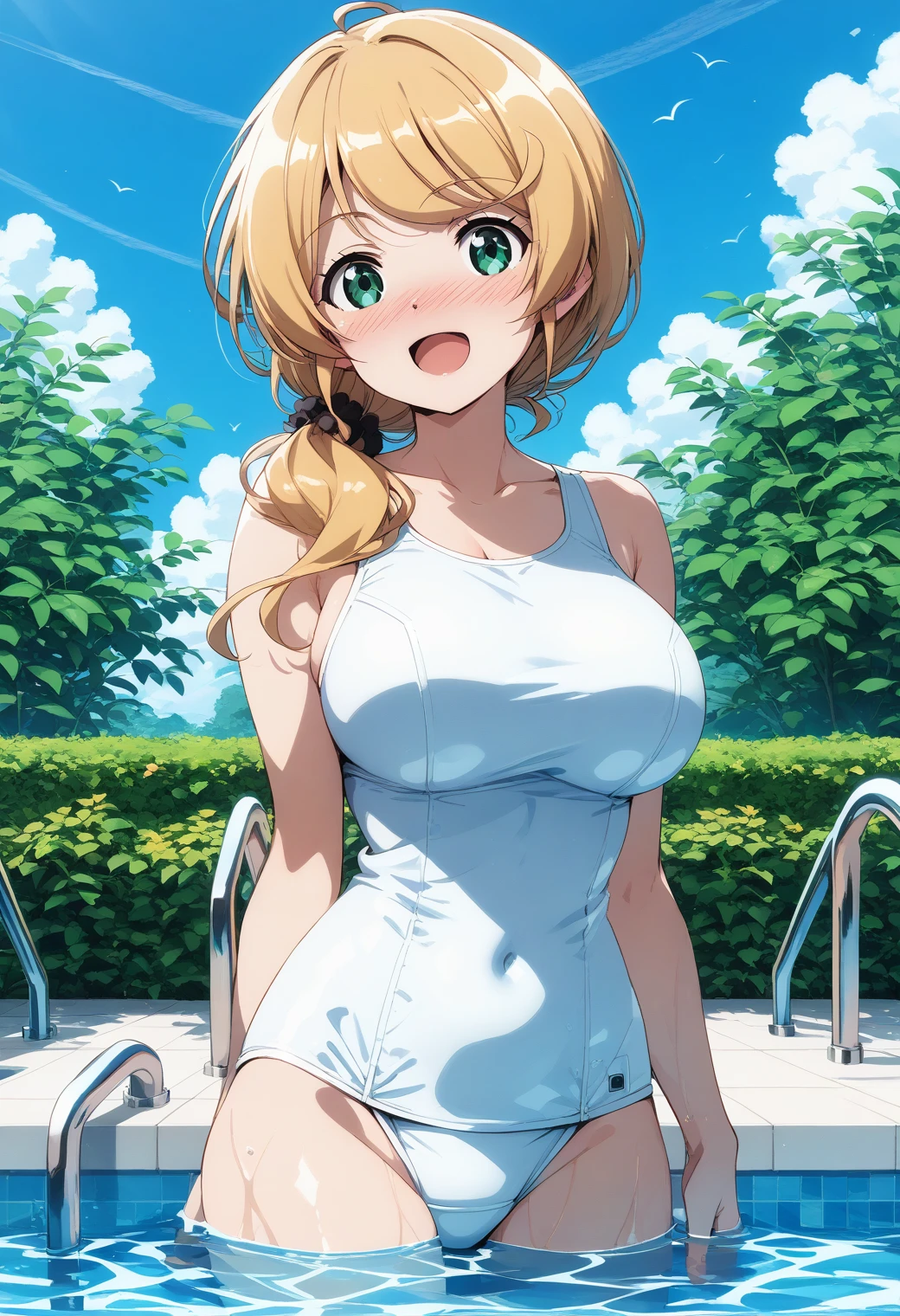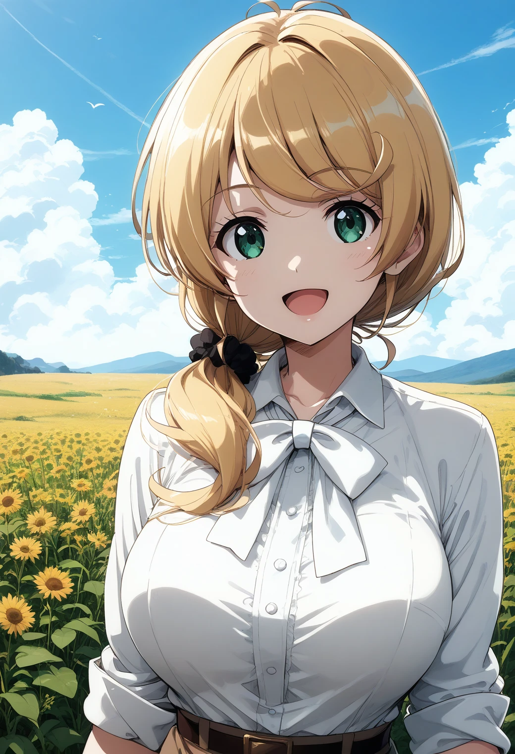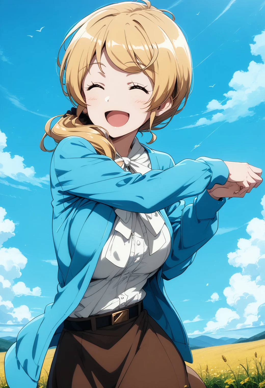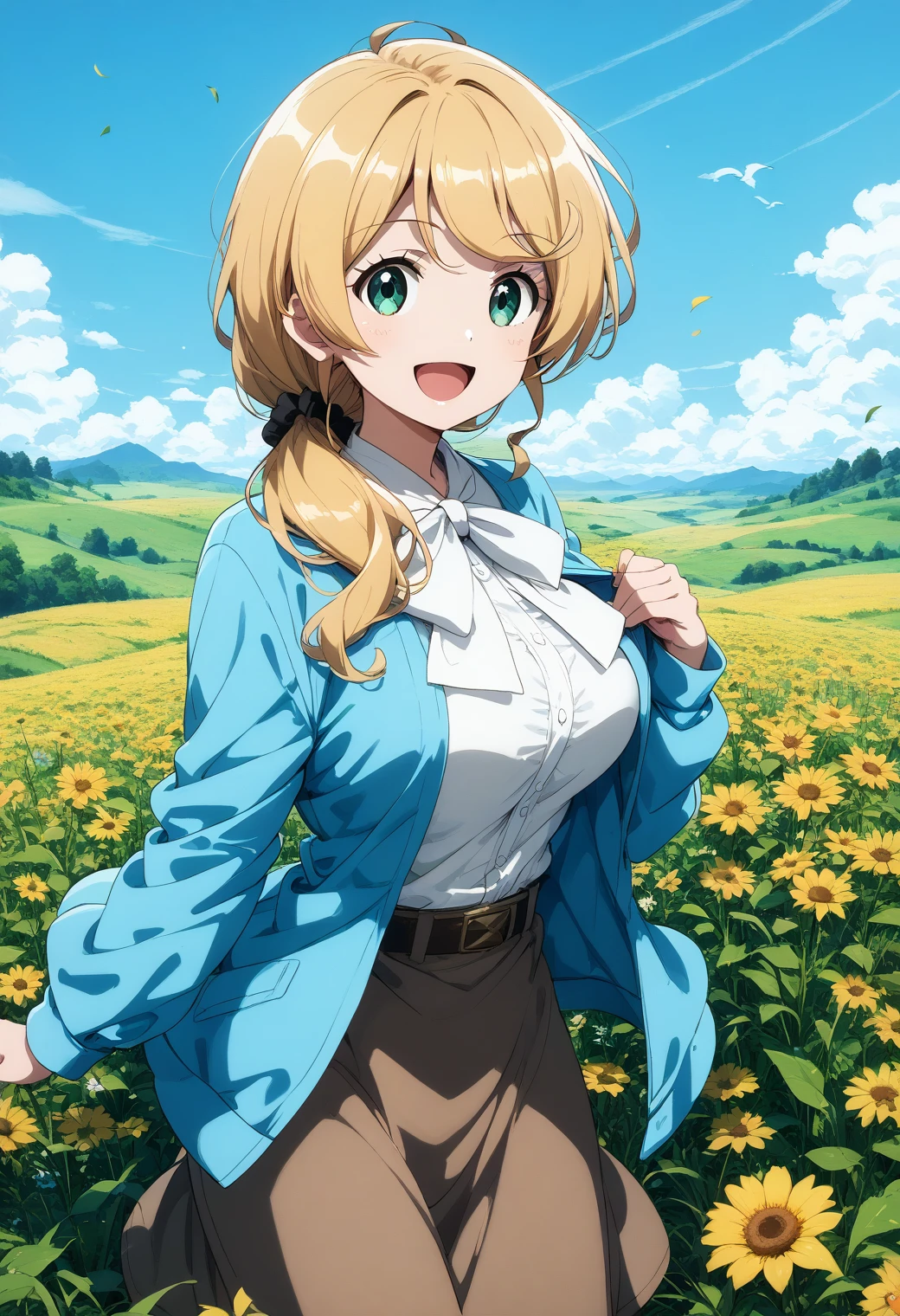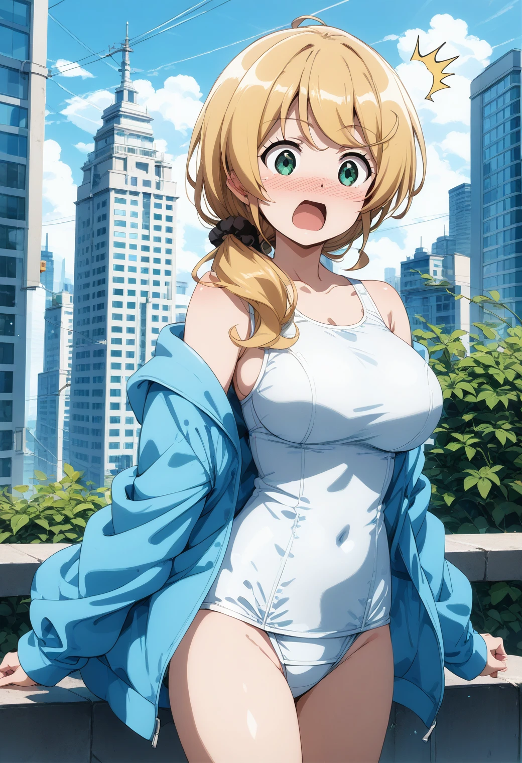 ellen_baker, green eyes, blonde hair, long hair, hair scrunchie, blue jacket, white shirt, blown skirt,