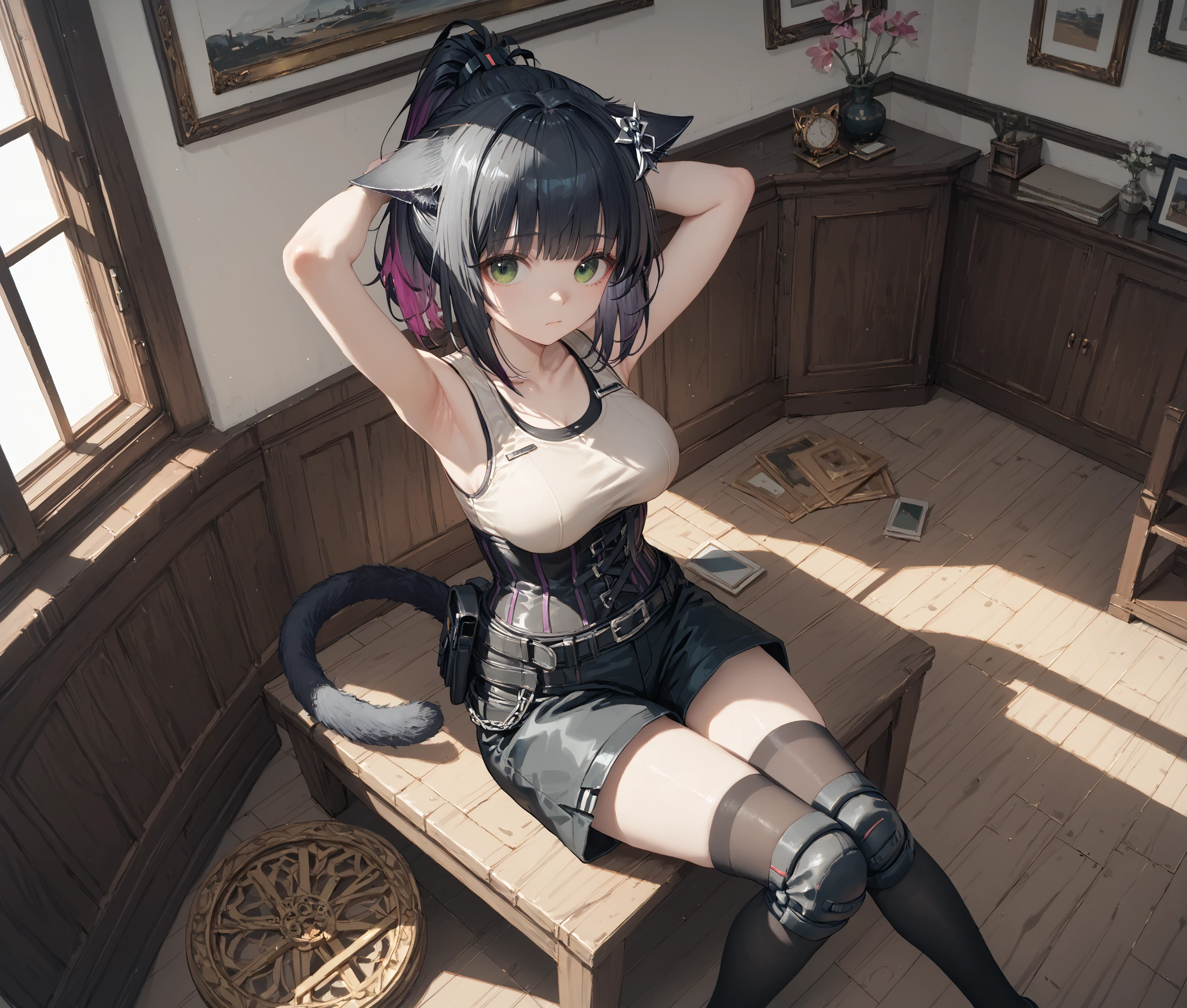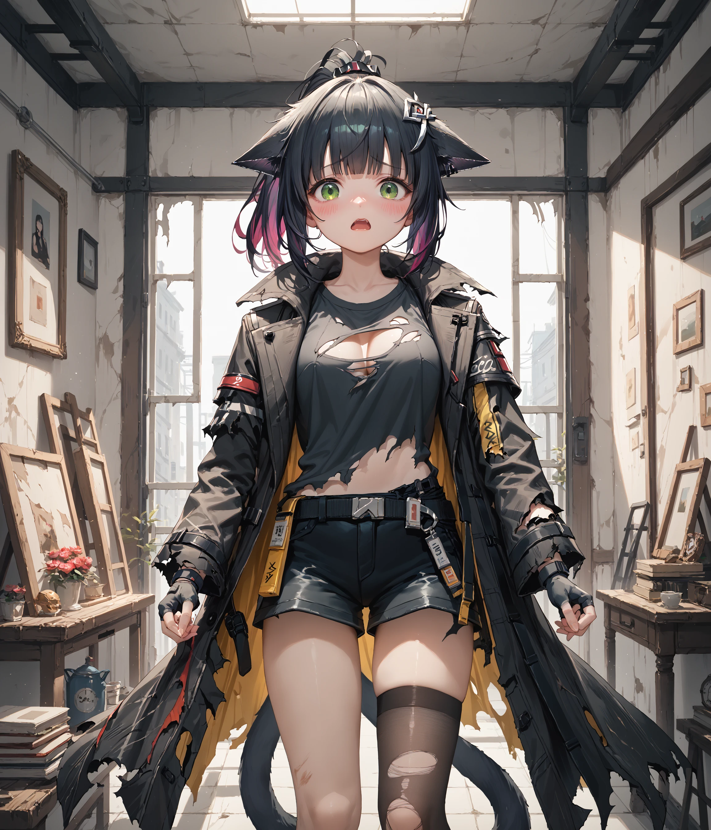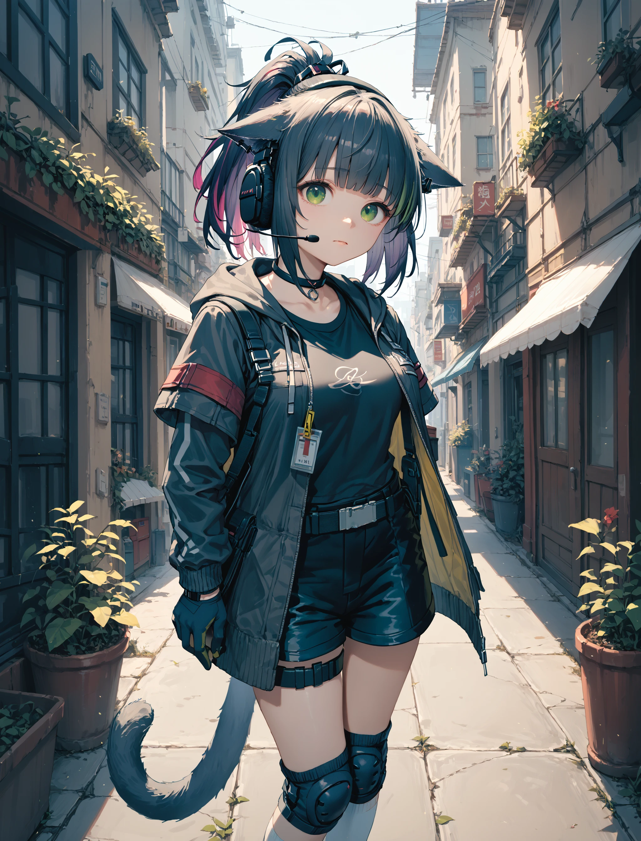 jessica, green eyes, cat ears, cat tail, ponytail, multicolored hair,Optional: