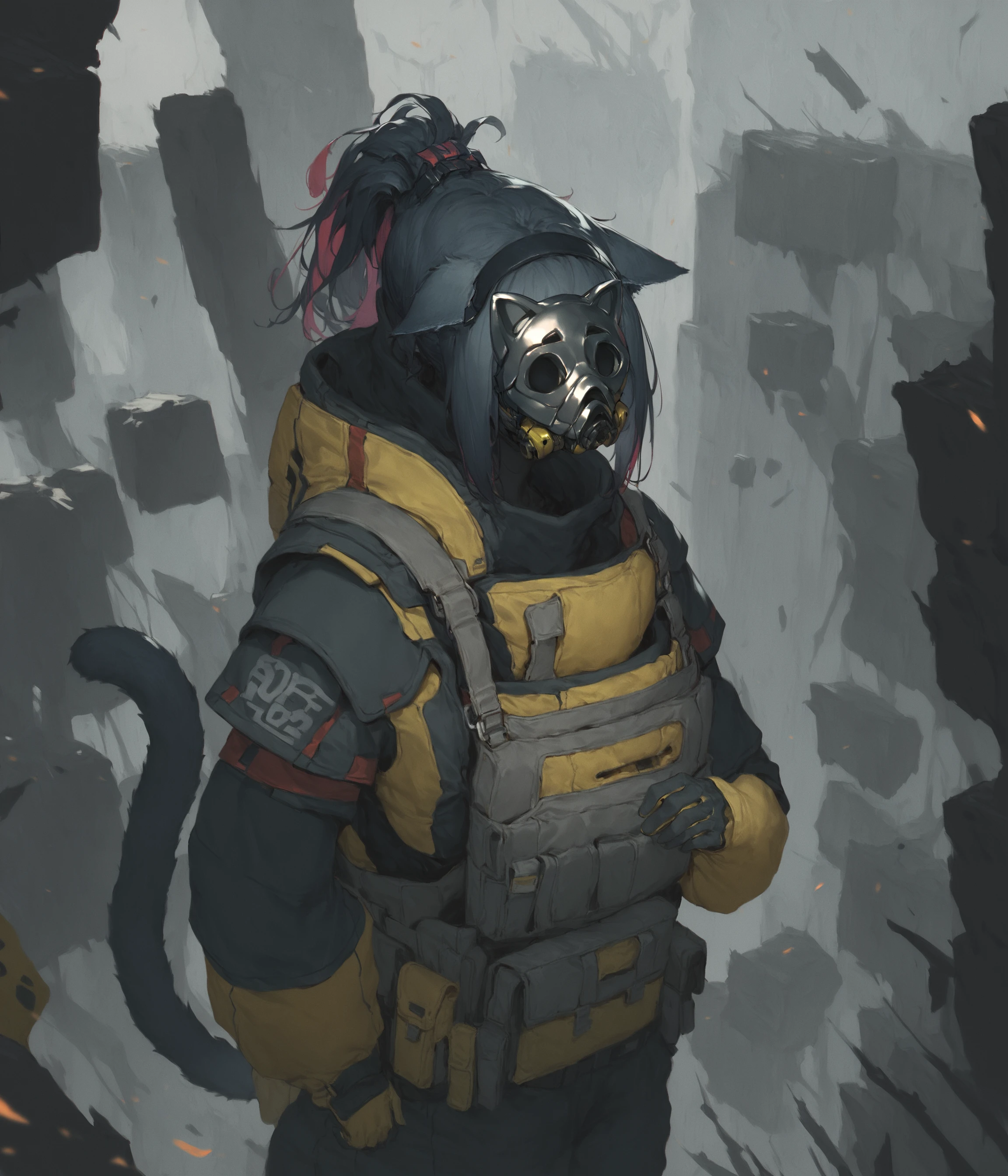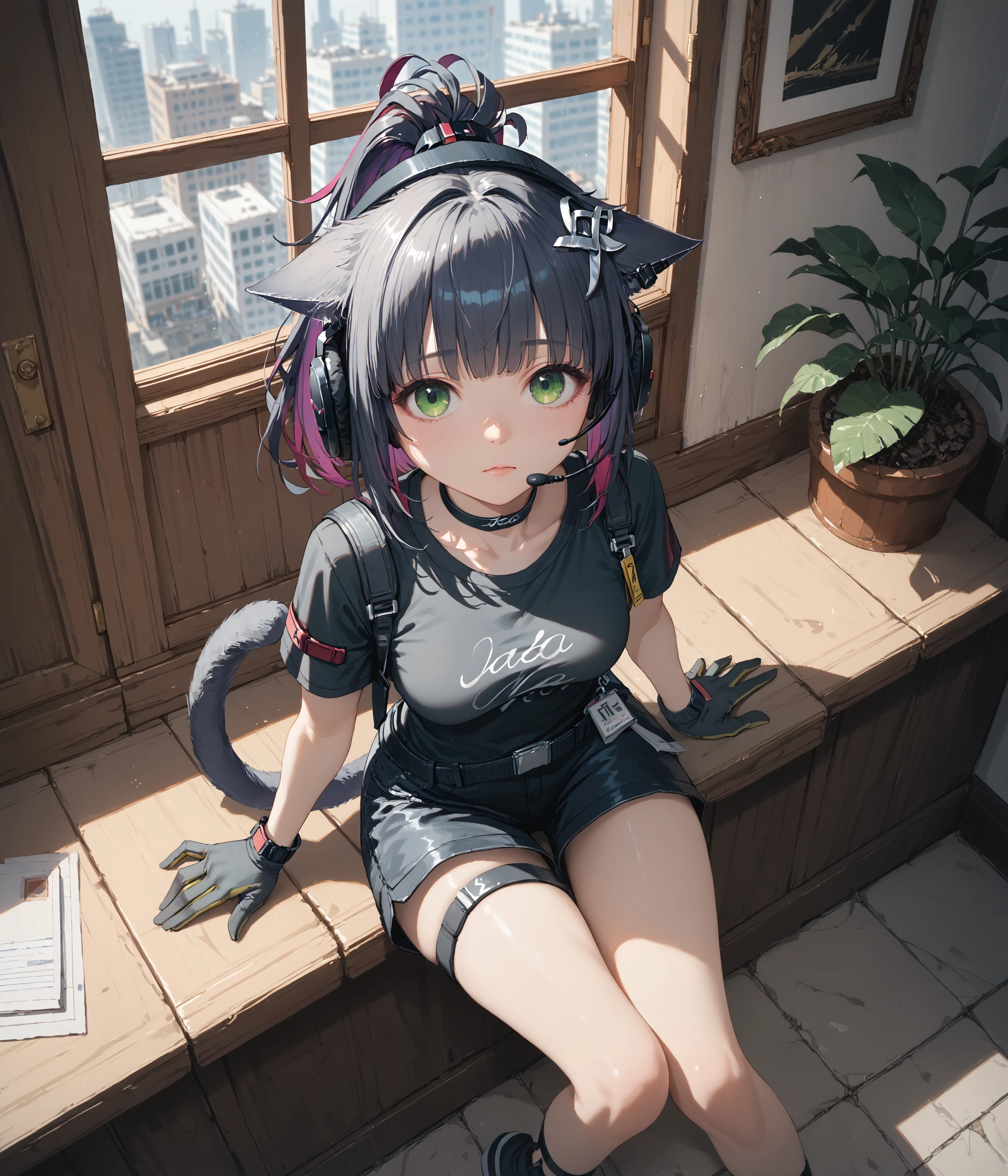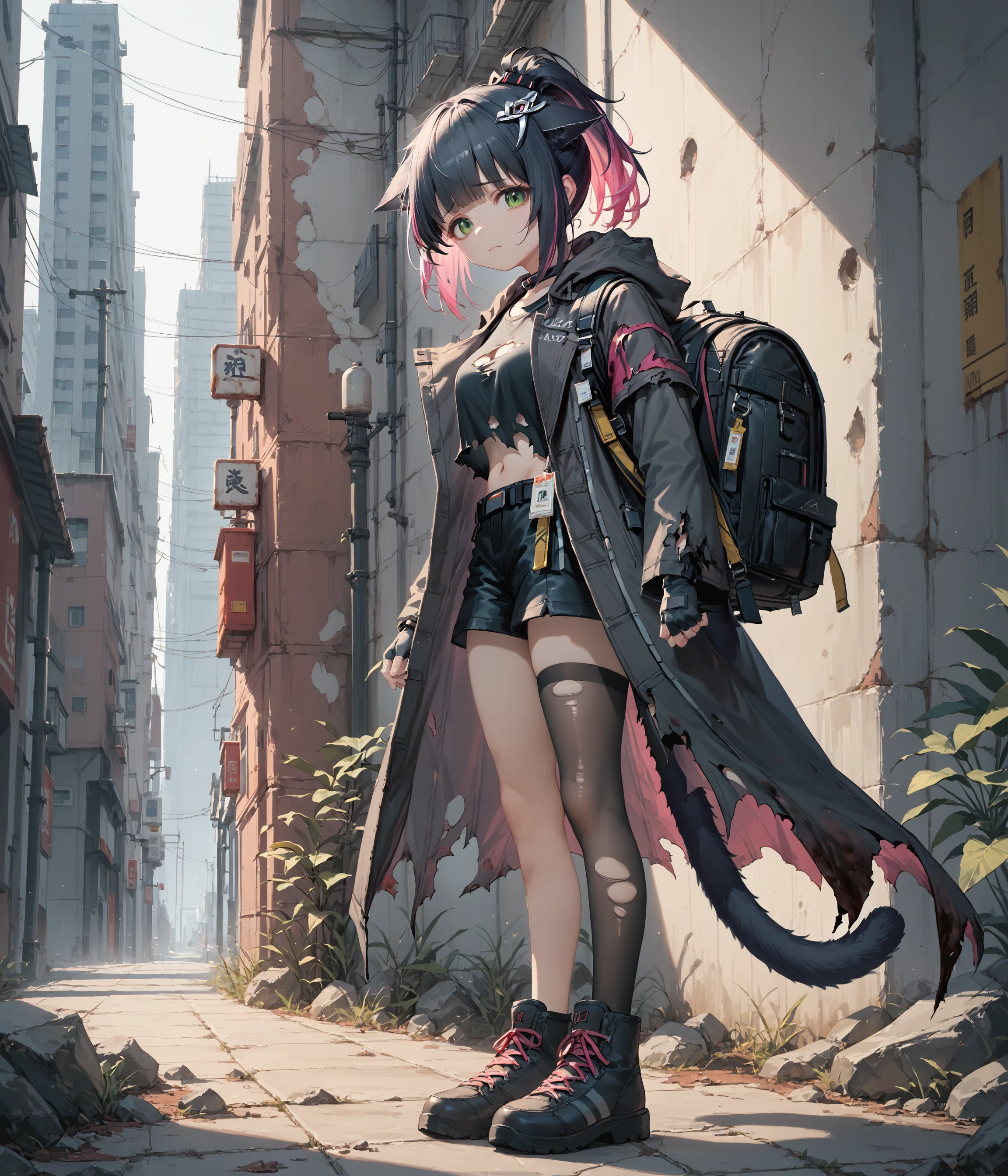 jessica, green eyes, cat ears, cat tail, ponytail, multicolored hair,Optional: