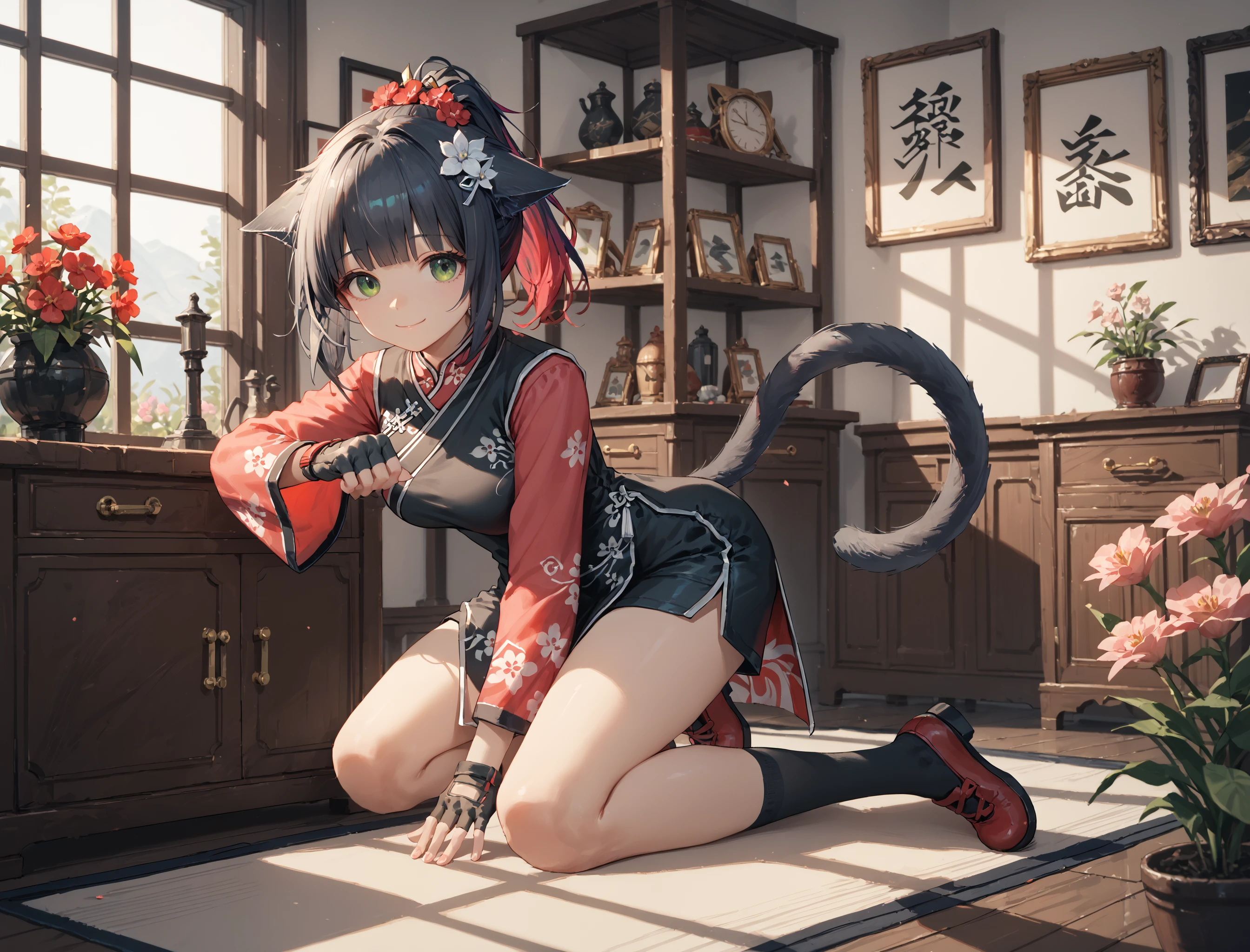 red sleeves, clivia_skin_dress, chinese dress, chinese_dress_long_sleeves, fingerless gloves, flower hair, floral print, black socks, red footwear, black shorts, Jessica the Liberated: