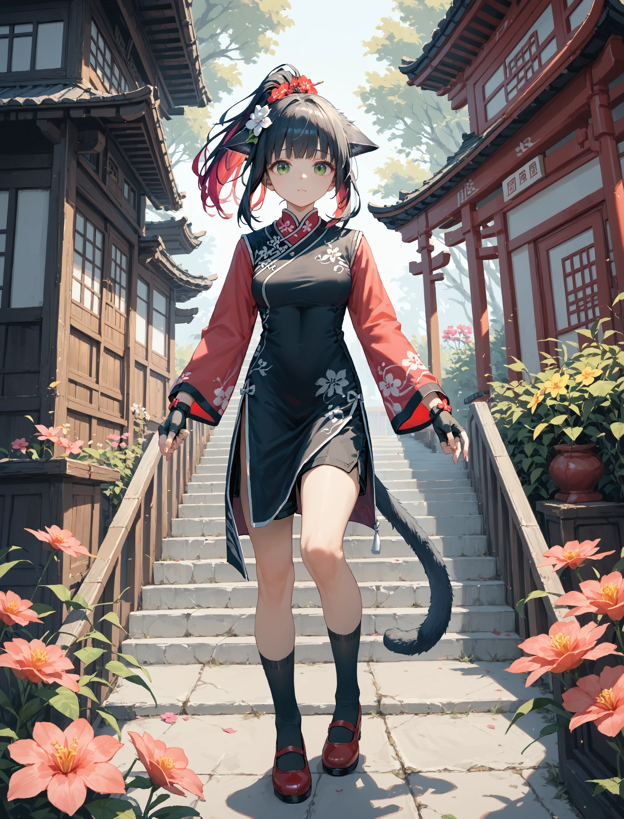 red sleeves, clivia_skin_dress, chinese dress, chinese_dress_long_sleeves, fingerless gloves, flower hair, floral print, black socks, red footwear, black shorts,