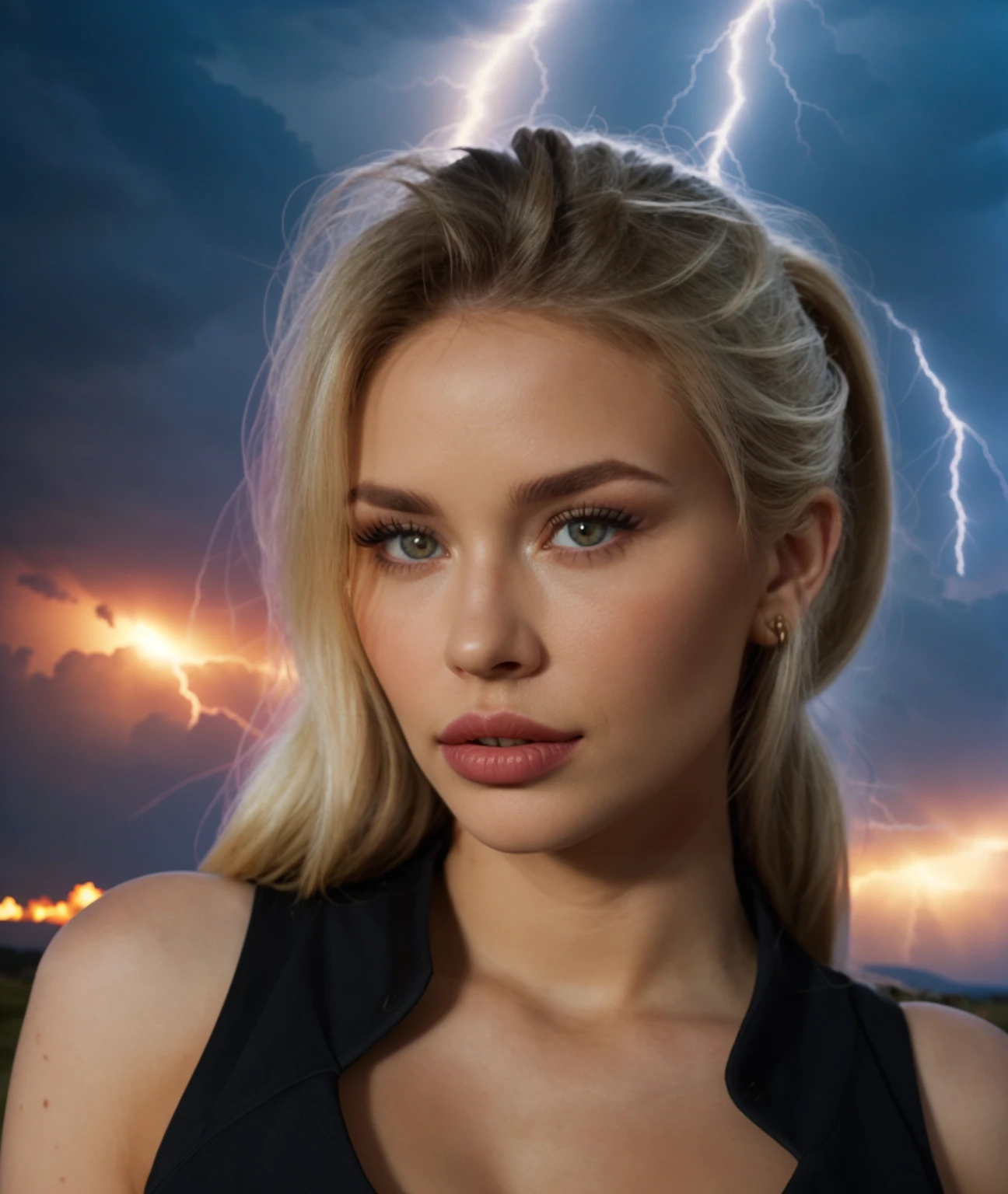 cinematic photo ,amazing photo , <lora:quiron_MikaylaDemaiter_v1230_Lora:0.87> MikayLademaiterQuiron, solo, lips, long hair, blonde hair, looking at viewer, queen costume,1girl running, close up, neon cyberpunk art style, a blonde American girl soldier running from a battle, pale skin, A Vivid UHD Photograph taken from the side, with jeans and blouse, running in a brightly colored New York City with neon lights, detailed with vibrant neon colors, rubble on ground, cars on fire, particles floating in the air, huge battle in background, lots of vibrant colors, beautiful image, ultramodern, teal and magenta highlights, teal shadows, high contrast, fear on face, looking back, young child kid Hayden Panettiere, little kid Tomi Lahren, young Elsa, Ultra Realistic, Extreme Realism, 8K, extremely detailed, photorealism, natural light, masterpiece, best quality, amazing, intricate, highly detailed, sharp focus, cinematic, fear,, . 35mm photograph, film, bokeh, professional, 4k, highly detailed