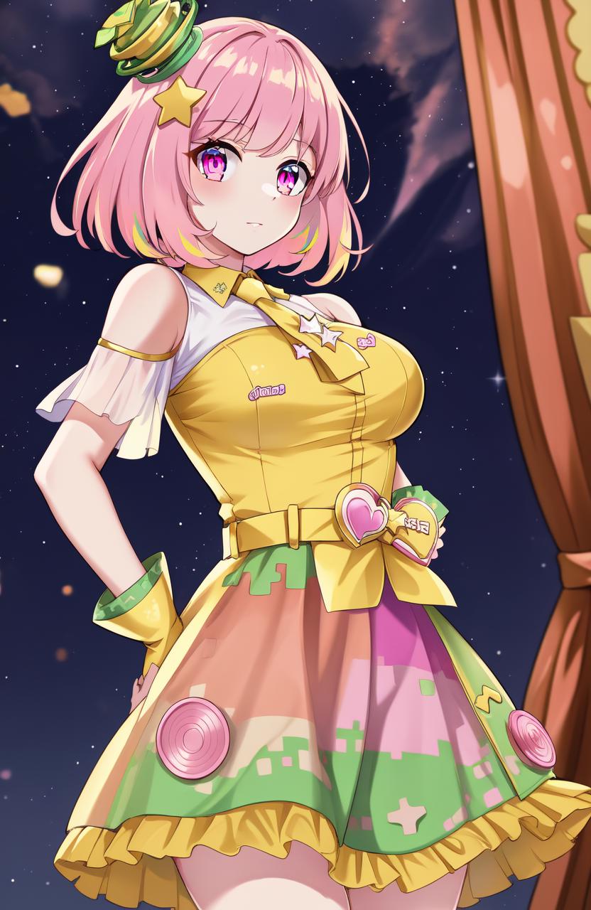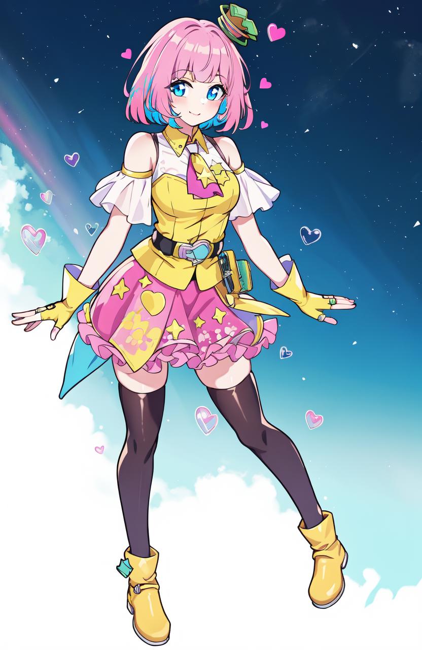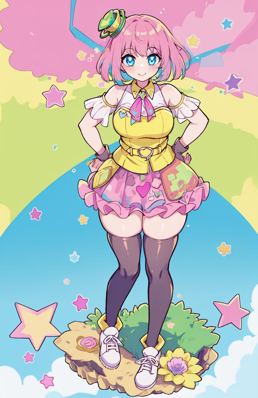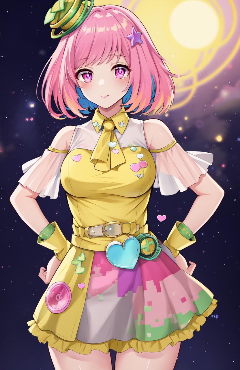 Recommended prompts if you want to more close to original character: poppi(kamen rider), 1girl, (((solo))), ((pink hair)), (((pink eyes))), yellow shirt, white shirt, medium breasts, hair ornament, bare arms, hat, heart, bare shoulders, short sleeves, frilled sleeves, gloves, chest ornaments, fingerless gloves, skirt, shoes, thighhighs, multicolored thighhighs, multicolored skirt