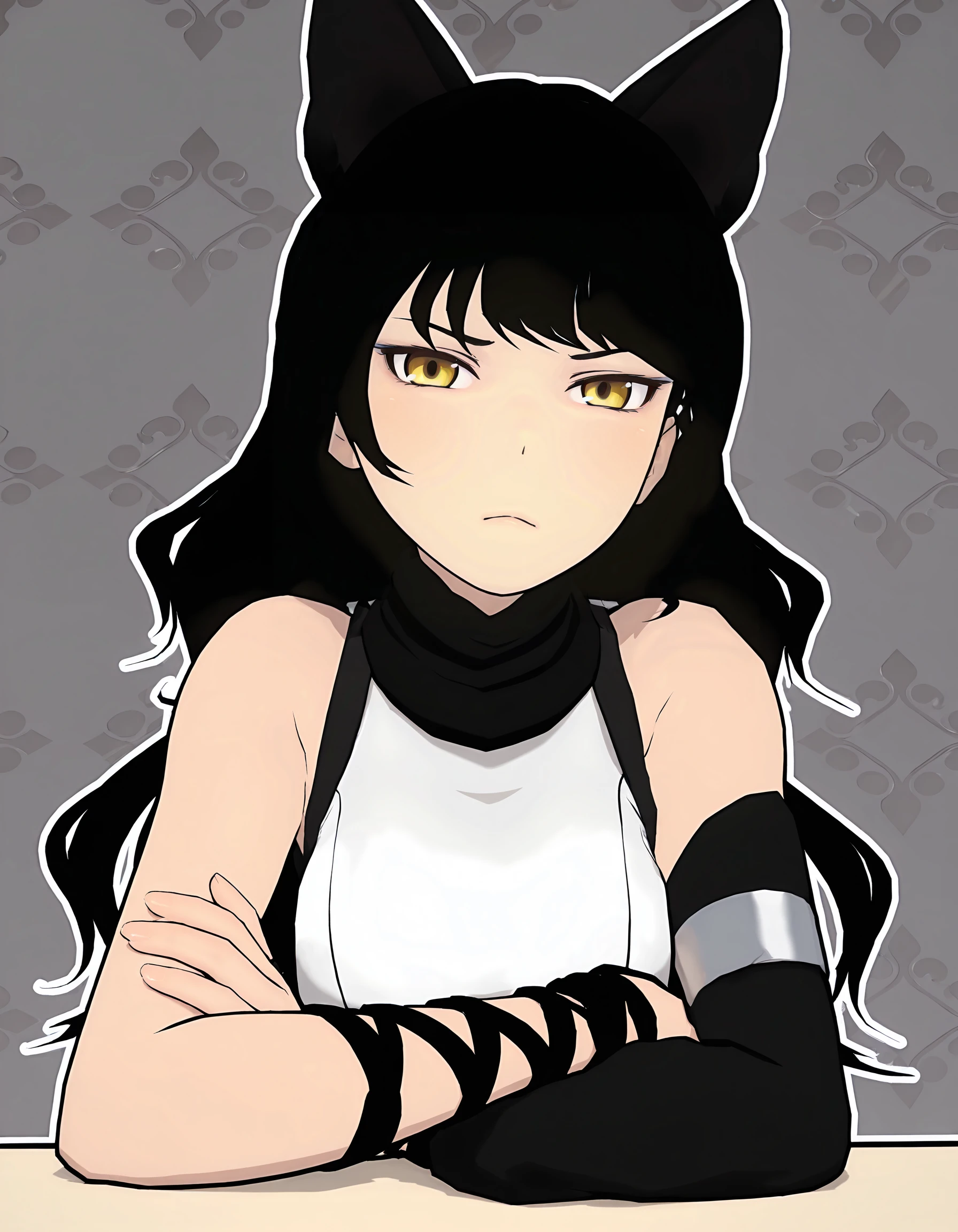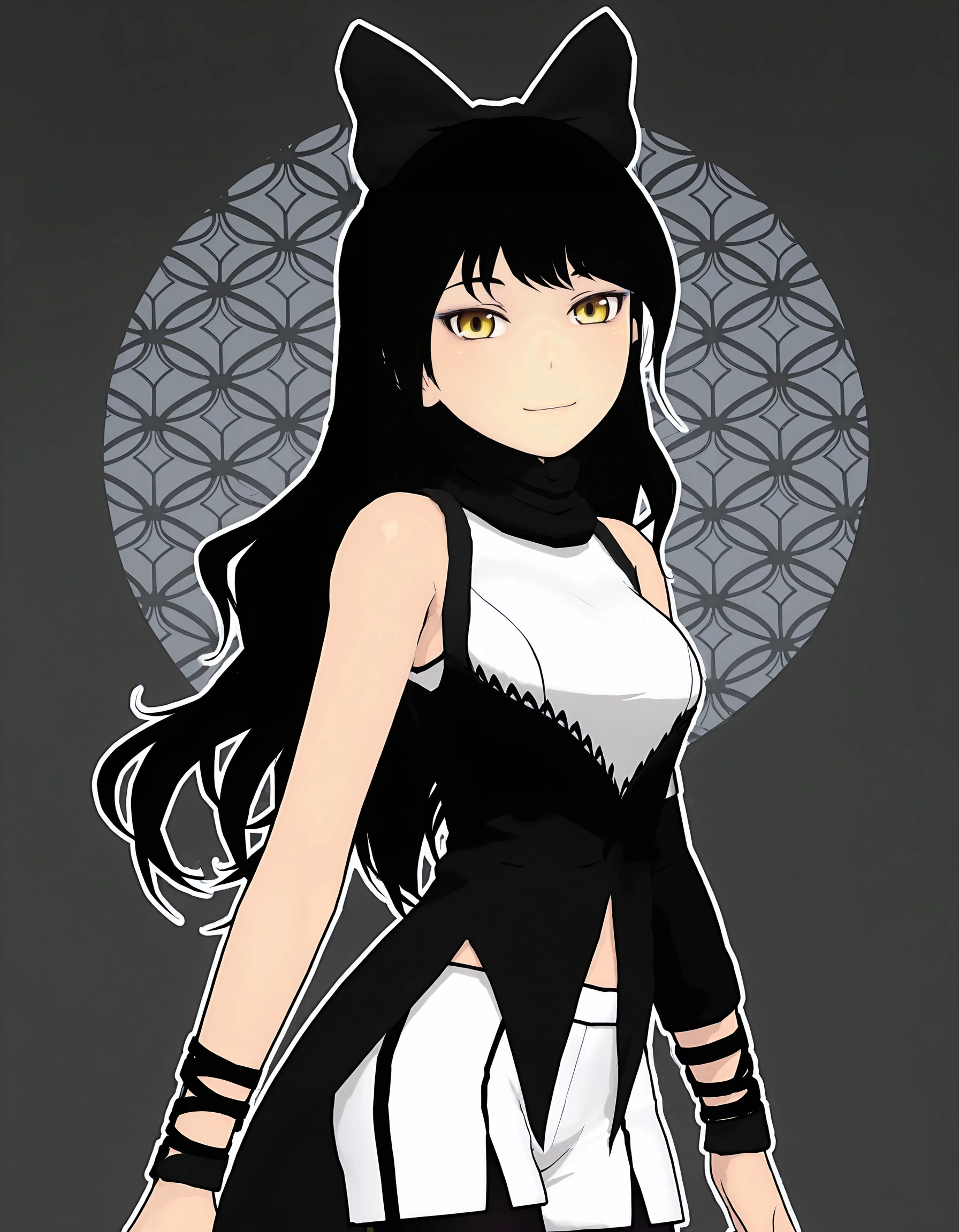 BlakeBelladonnaV1, black hair, yellow eyes, long hair, black hair bow, black scarf, white sleeveless top, asymmetrical sleeves, long sleeve, arm ribbons, black sleeveless vest, split tails, white shorts, black gradient tights, black boots,