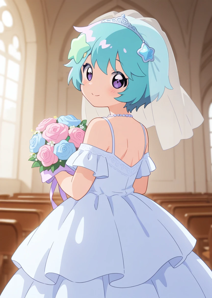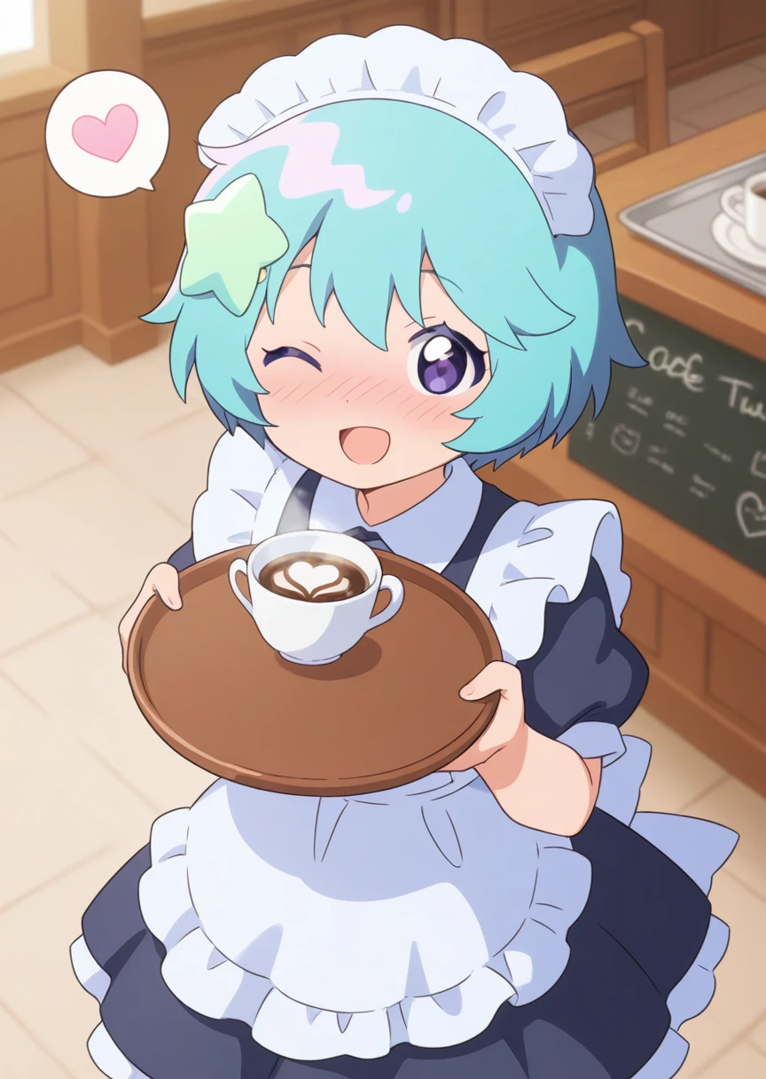 prompts: fuu nonoyama, aqua hair, purple eyes, short hair, hair ornament, hooded vest, white undershirt, yellow skirt, pink legwear, aqua footwear,