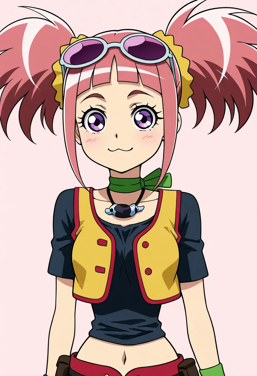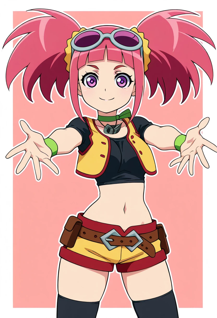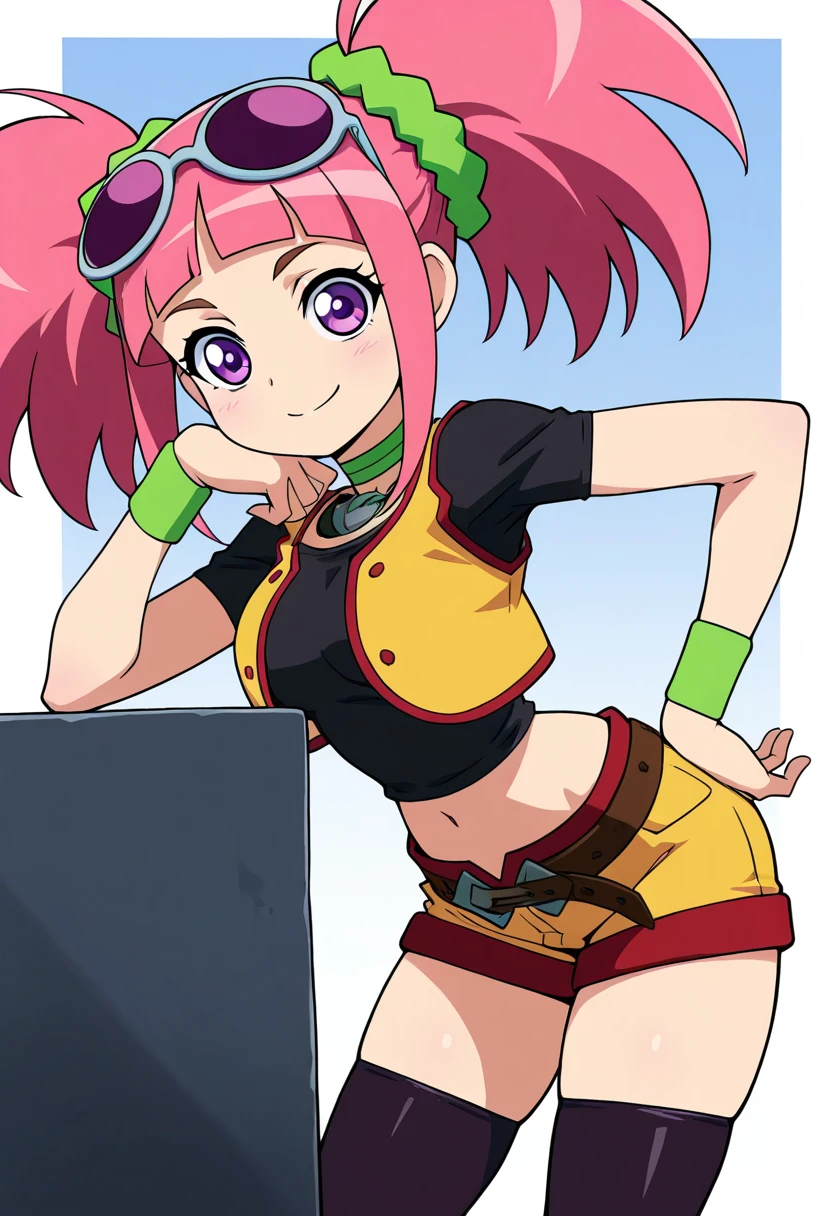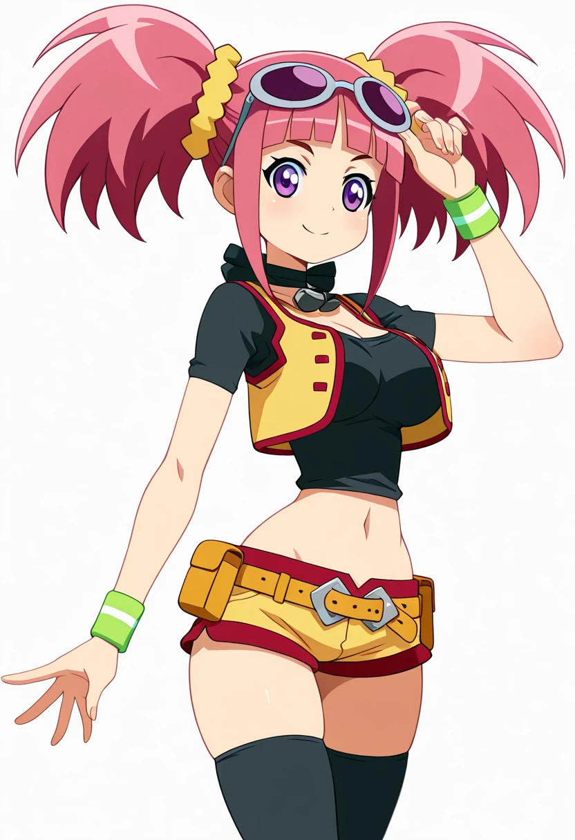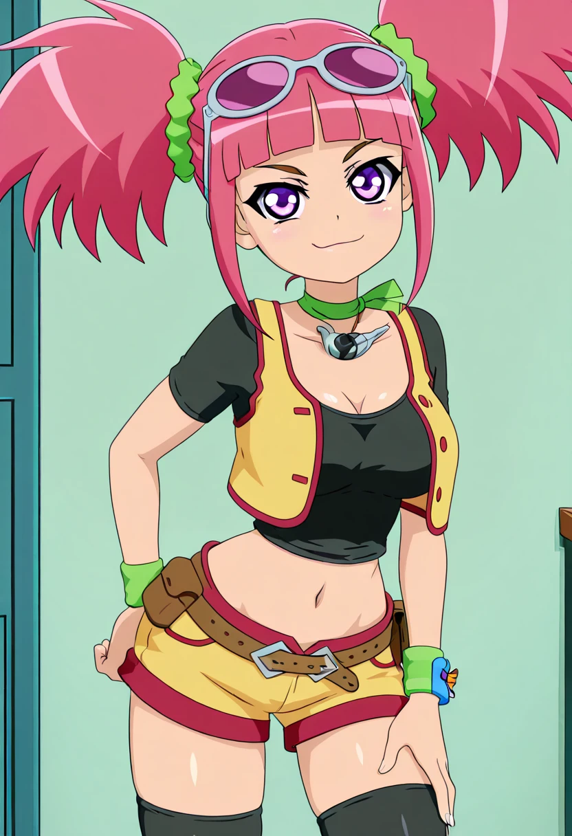 zzTatsuno, purple eyes, pink hair, short hair, short twintails, blunt bangs, zzTatsuno, purple eyes, pink hair, short hair, short twintails, blunt bangs, vest, crop top, navel, midriff, belt, short shorts, black thighhighs, sunglasses on head, scrunchie, wristband,