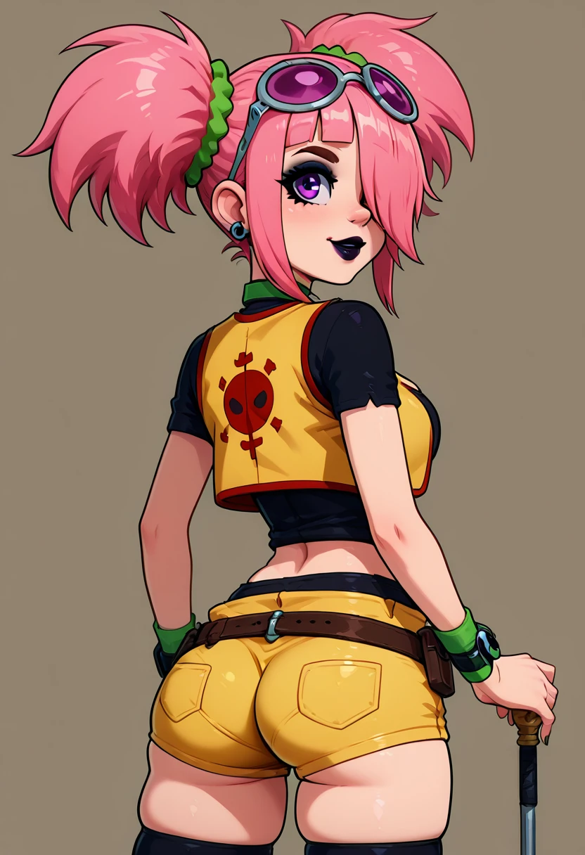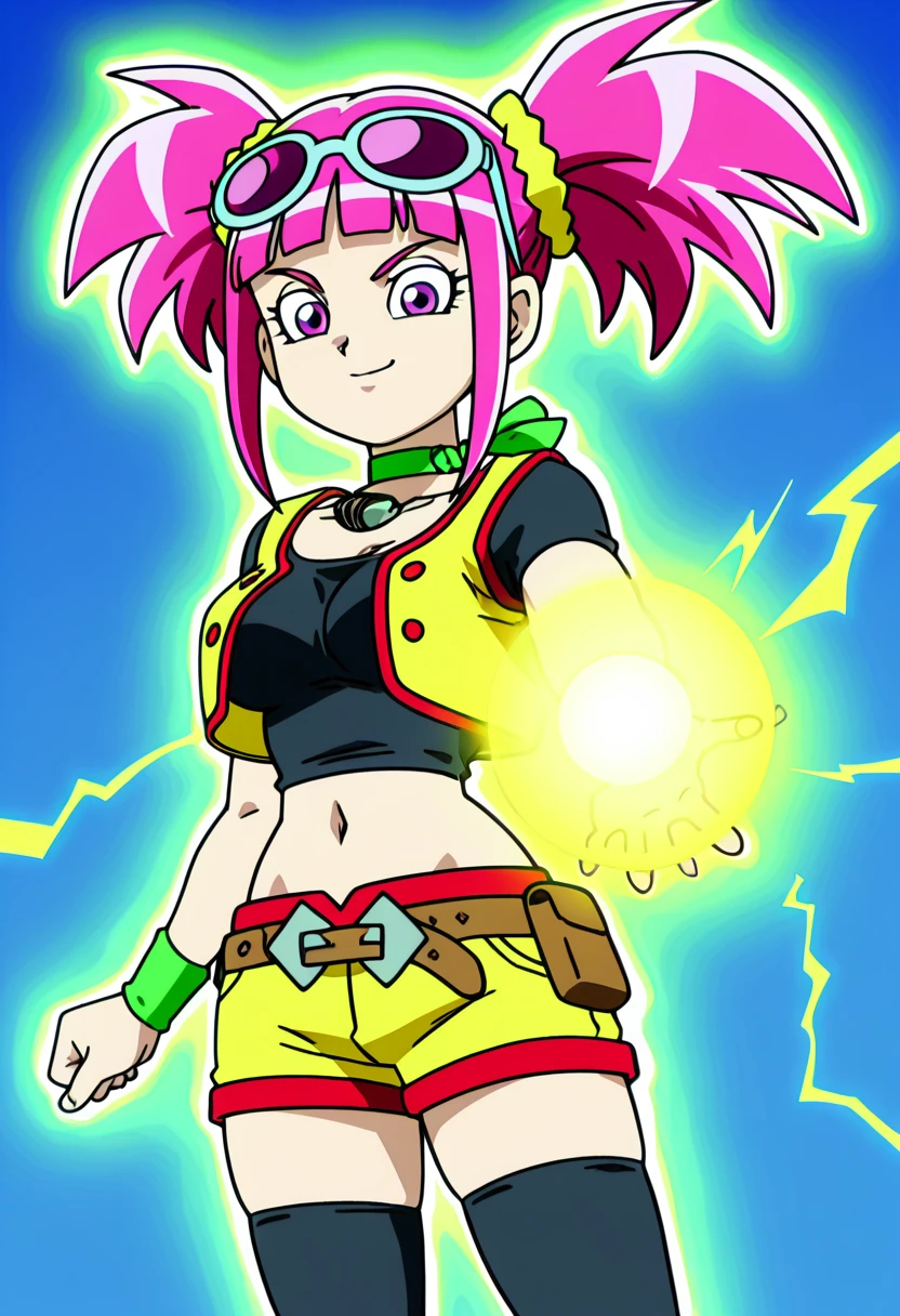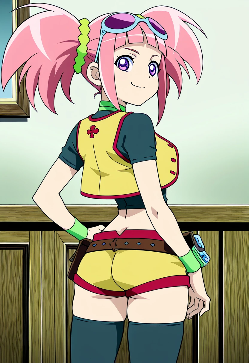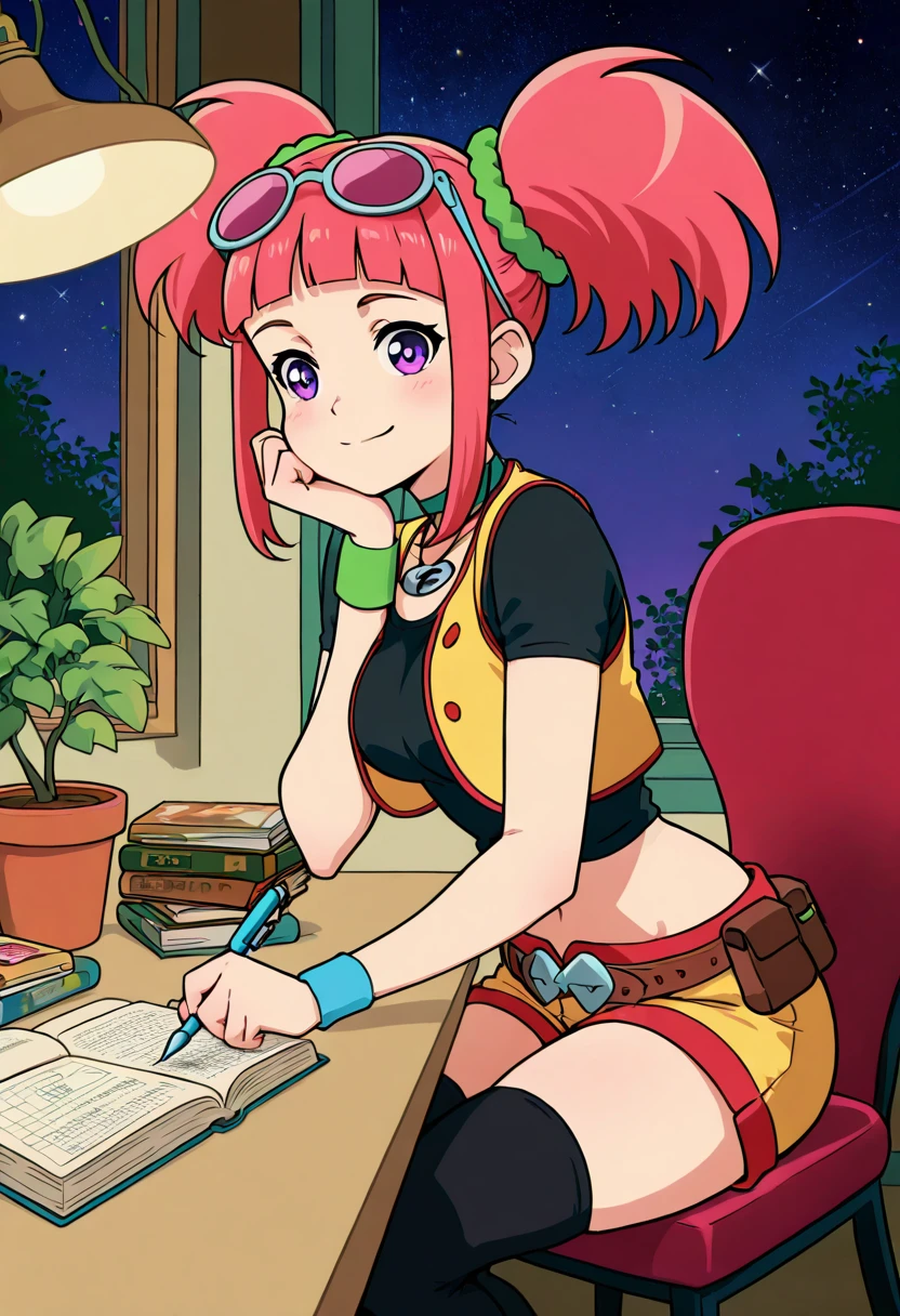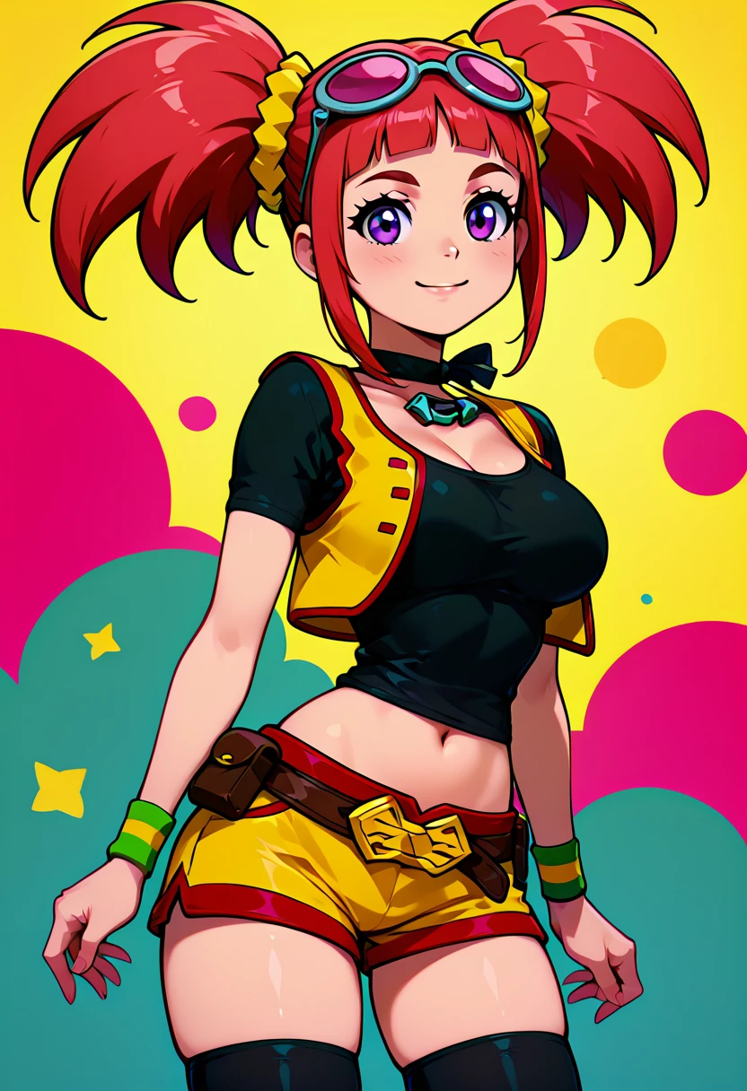 zzTatsuno, purple eyes, pink hair, short hair, short twintails, blunt bangs, zzTatsuno, purple eyes, pink hair, short hair, short twintails, blunt bangs, vest, crop top, navel, midriff, belt, short shorts, black thighhighs, sunglasses on head, scrunchie, wristband,