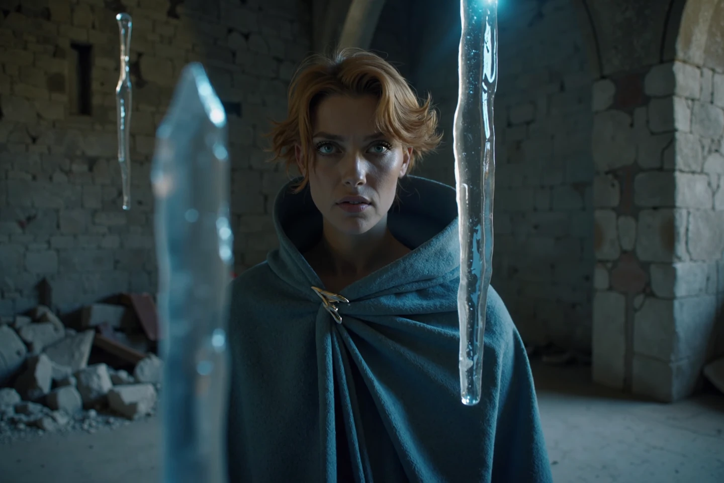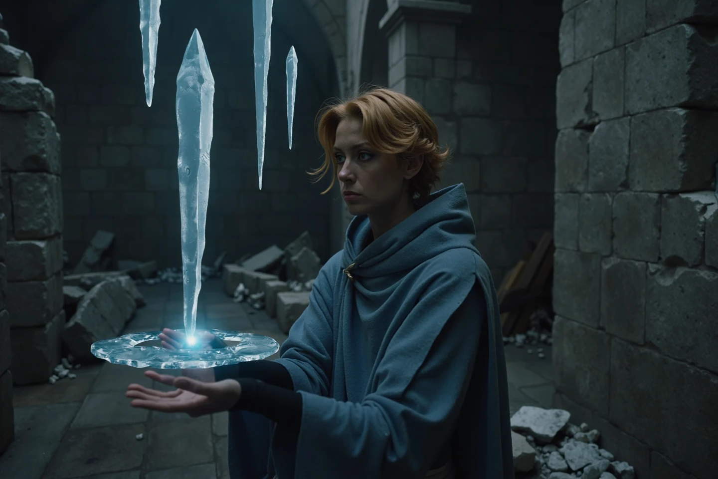 a gorgeous 25 year old bombshell female Sypha Belnades, sypha,1girl,Sypha Belnades,1woman,orange hair,short hair,blue robe,morning,outside,gesturing,casting ice magic, casting ice spell,windy, off white waist wrap, bloody, blue eyes"