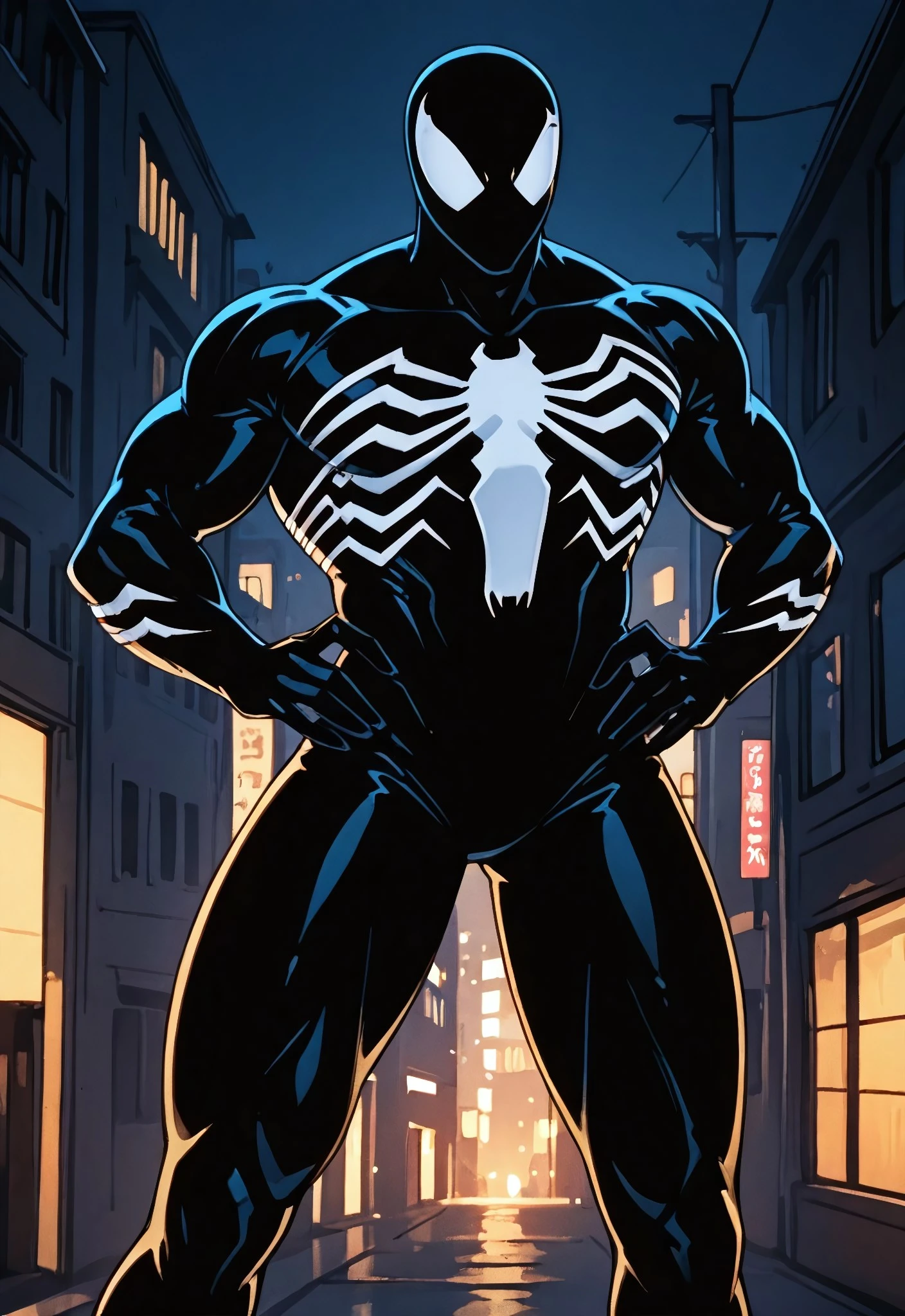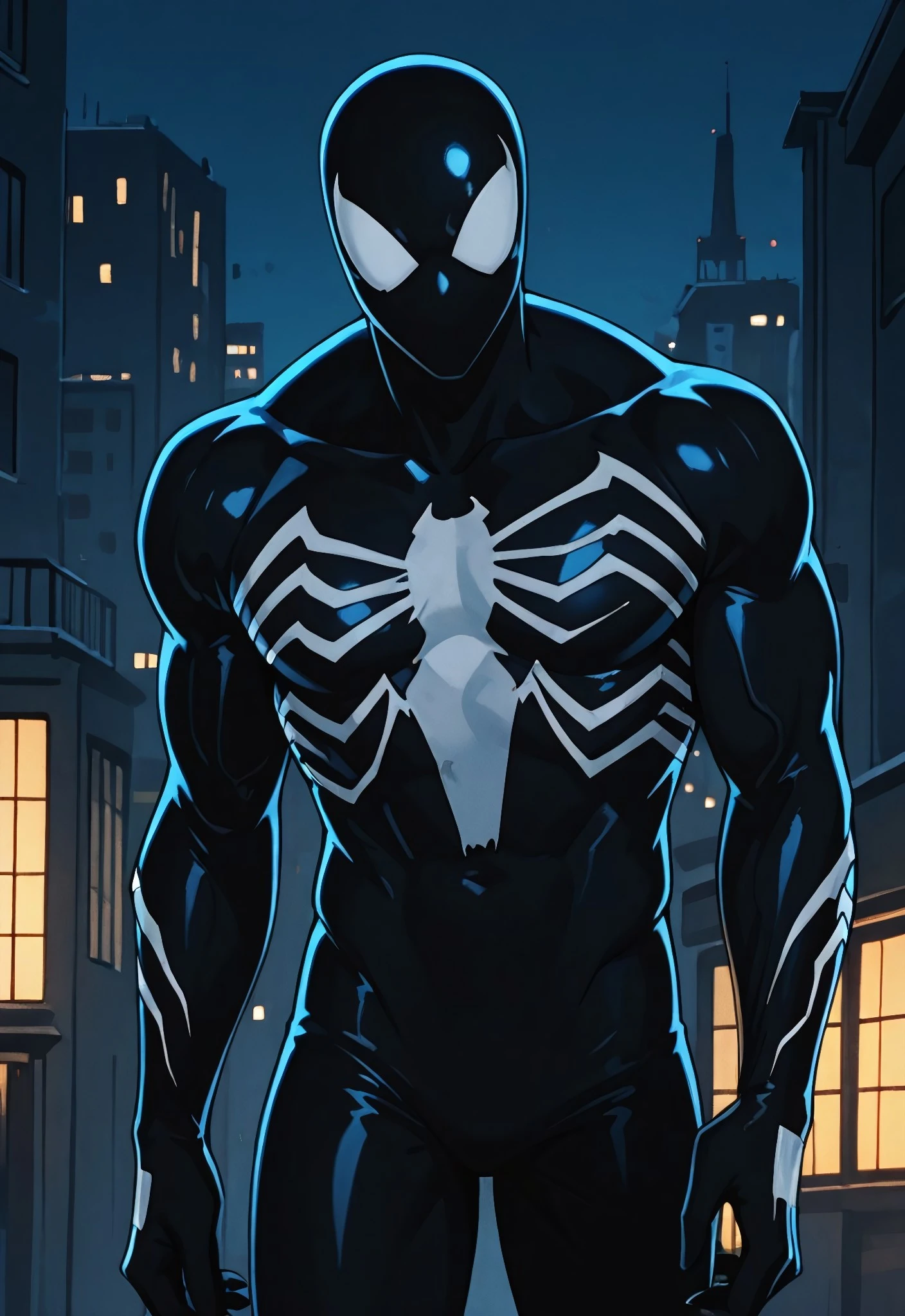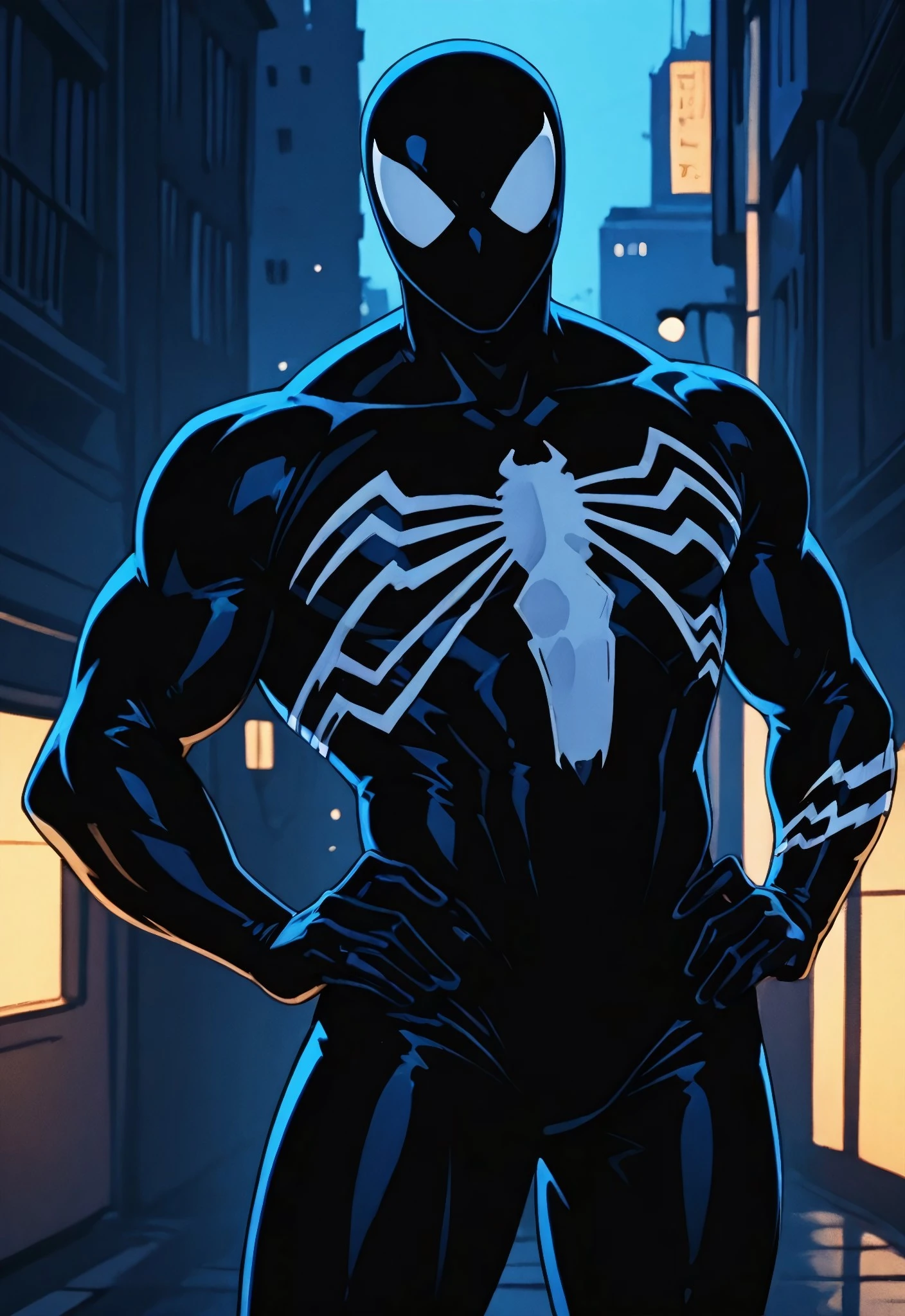 symbiotespider_unlimited(cartoon)IL, symbiote, black , body suit, 1boy, solo, spider print, white spider print, muscular, mask,