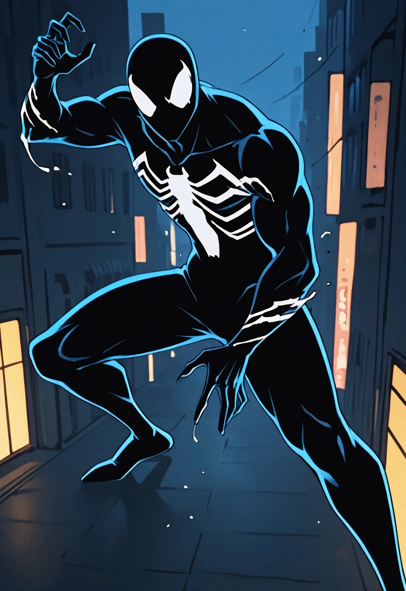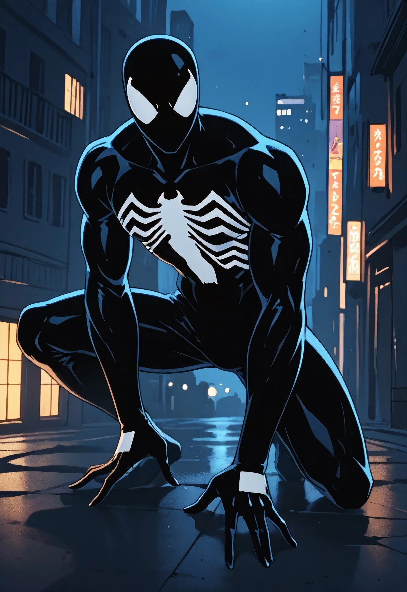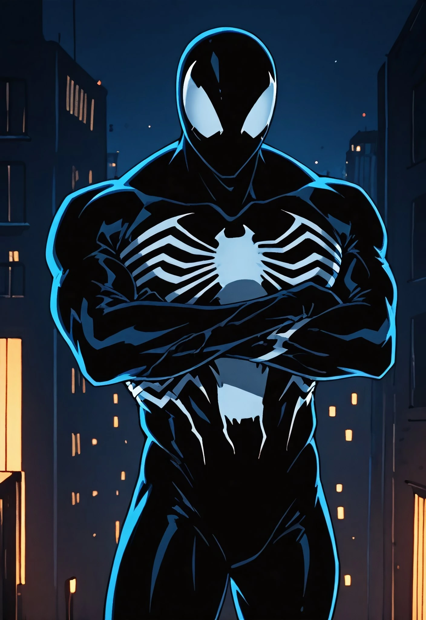 symbiotespider_unlimited(cartoon)IL, symbiote, black , body suit, 1boy, solo, spider print, white spider print, muscular, mask,