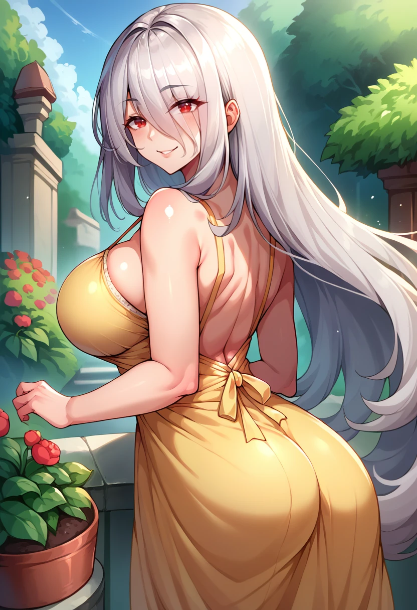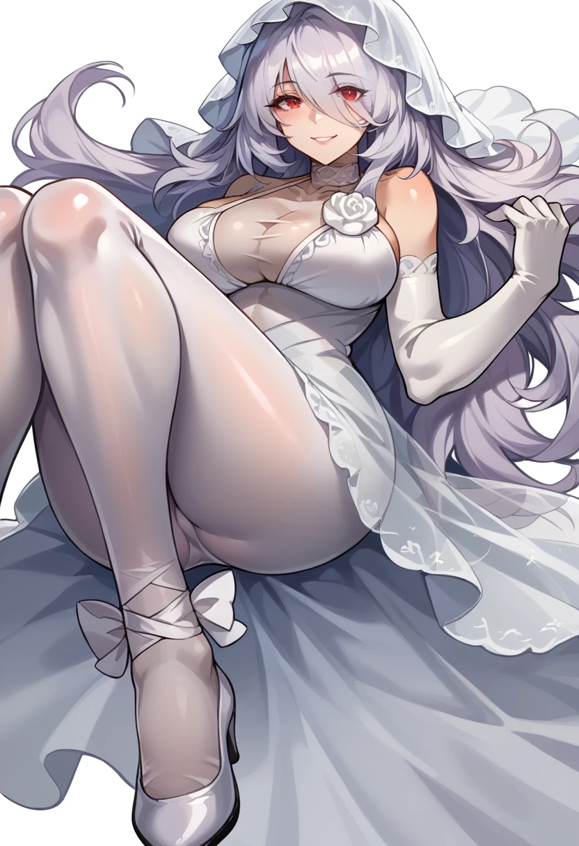 jelopkbys, grey hair, hair over one eye, bridal veil, red eyes, white choker, halterneck, wedding dress, elbow gloves, white gloves, white pantyhose