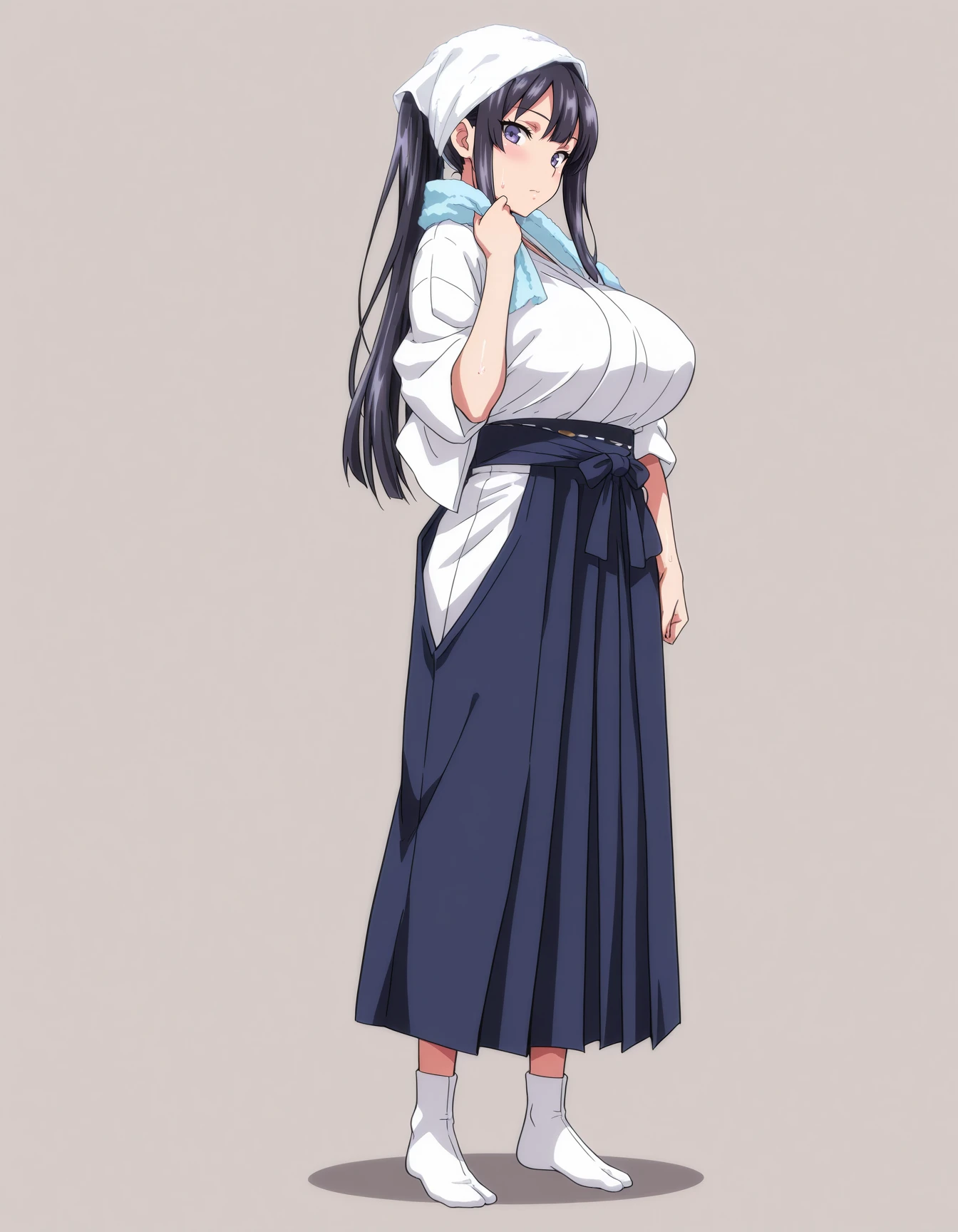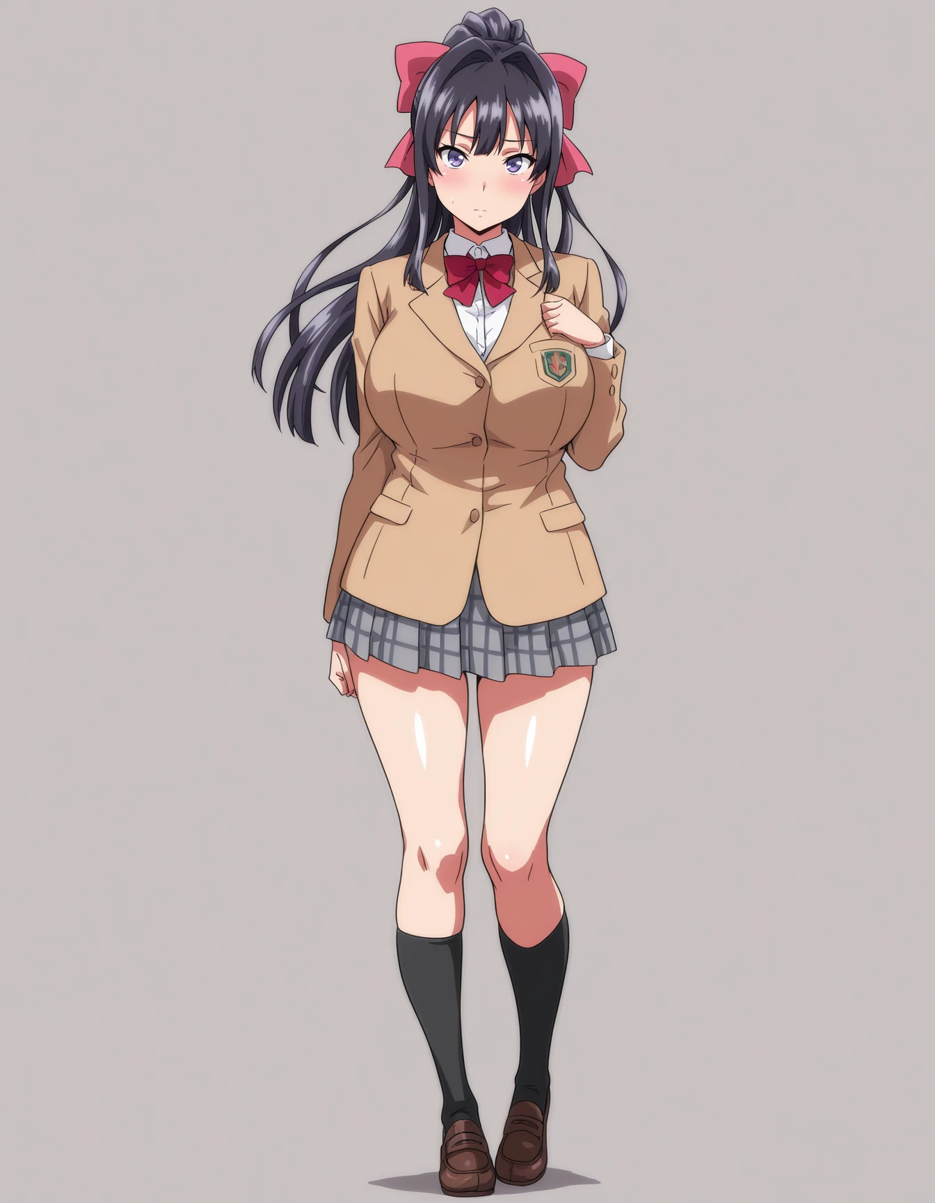 mai_tsubakiim,long_hair,black_hair,ponytail,purple_eyes,hair_bow,school_uniform,red_bow,brown_jacket,school_uniform,plaid_skirt,black_kneehighs,loafers