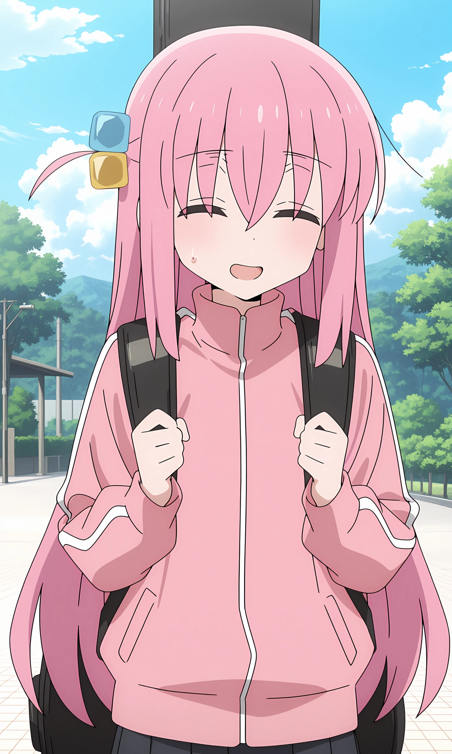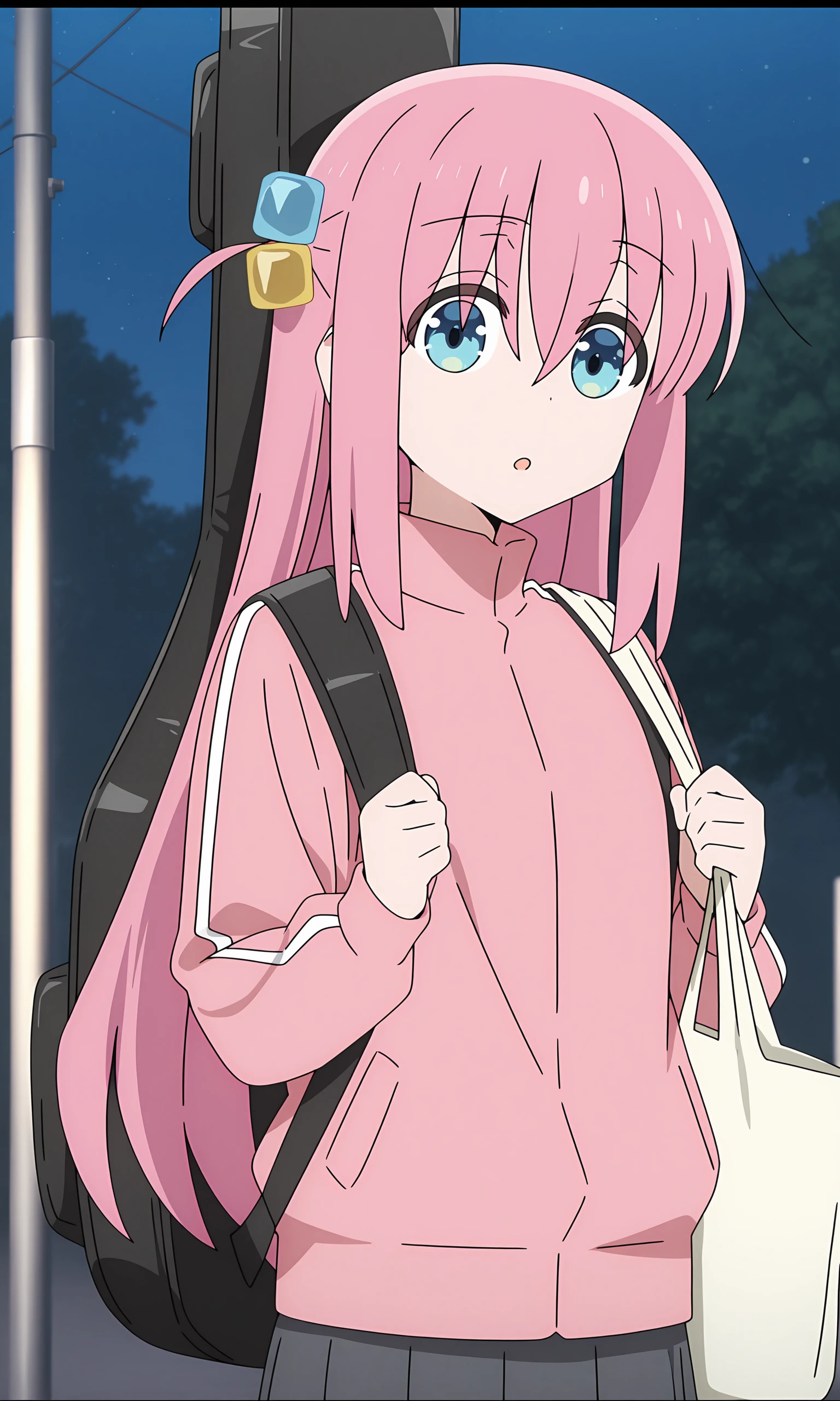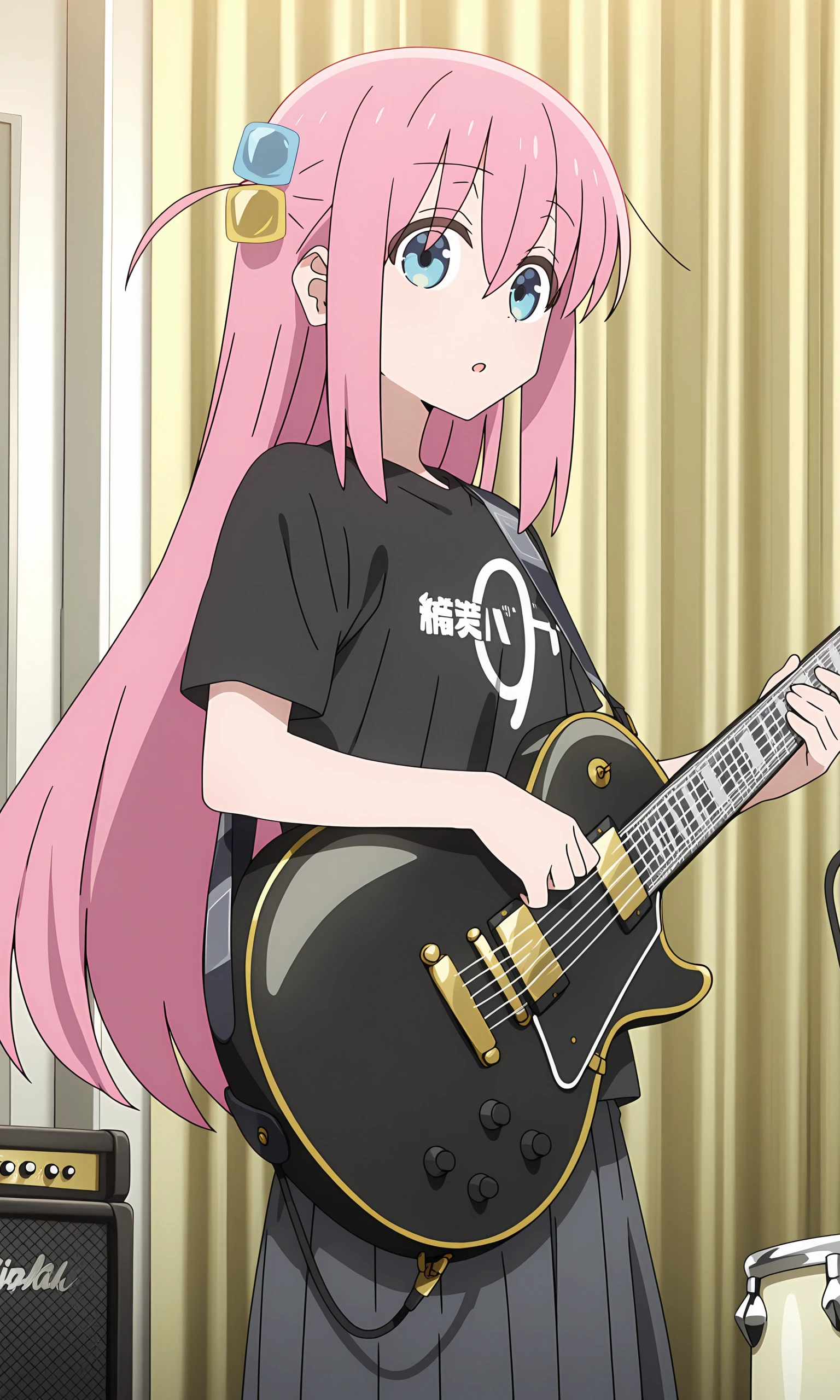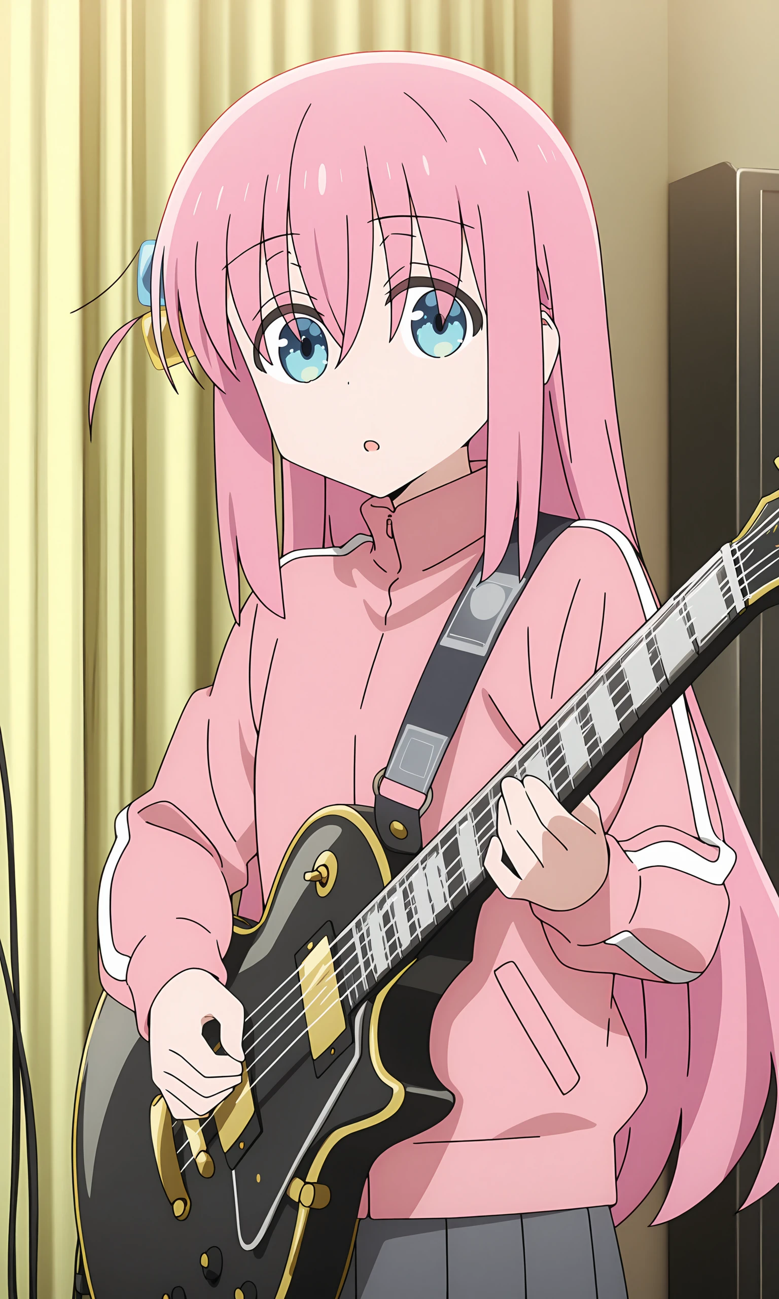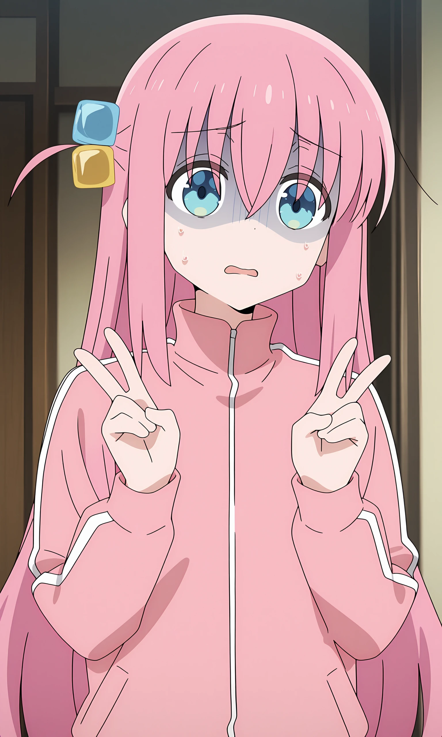 Bocchi, cube hair ornament, pink hair, long hair, blue eyes, hair between eyes,bangs, sidelocks