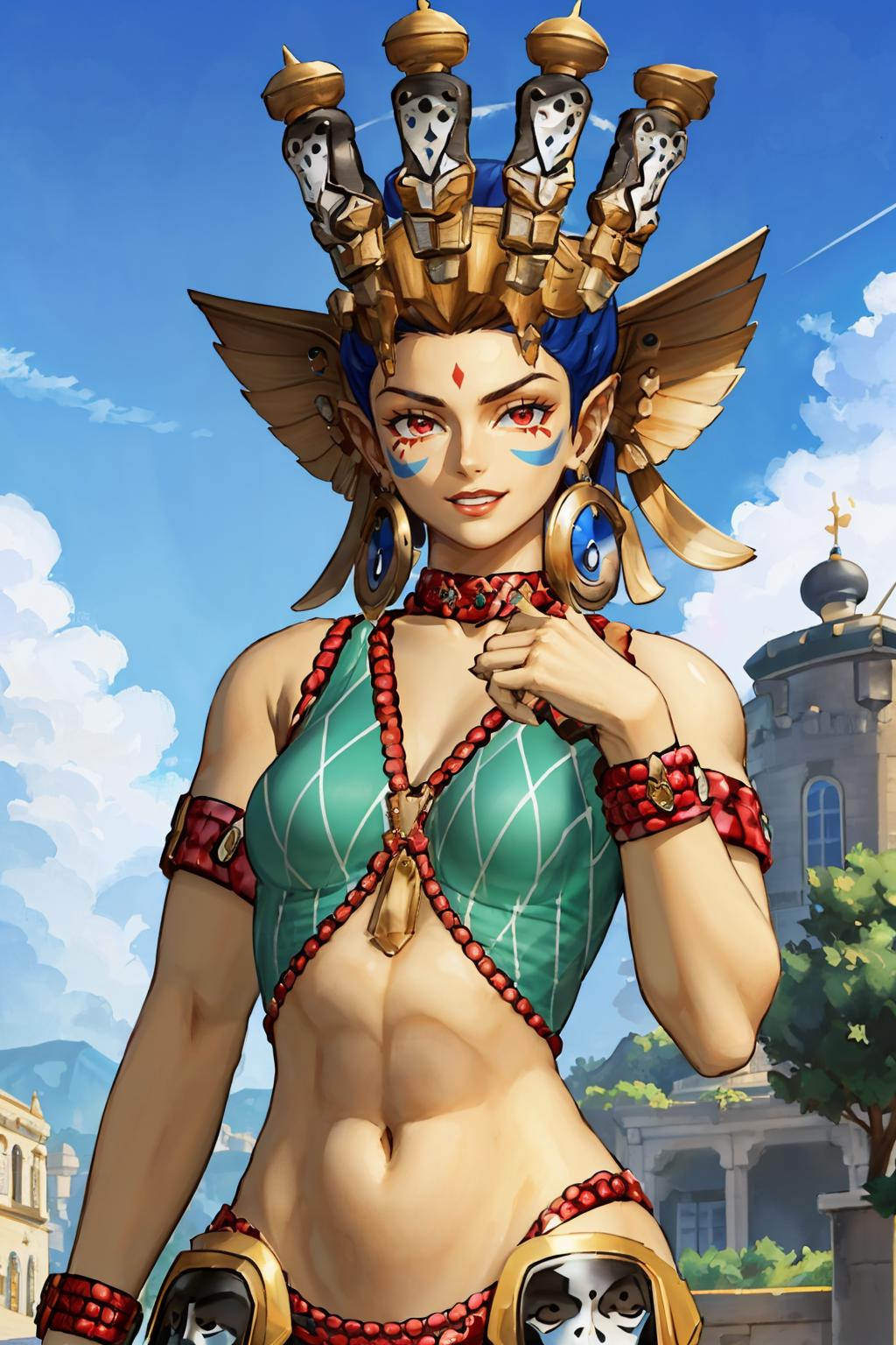 Tags: dakinismt, jewelry, skirt, green top, midriff, (colored skin:1.2), barefoot, bracelet, anklet, face markings, red eyes